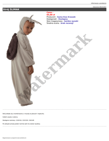Informacje o produkcie Utworzono 08-03-2017 Strój ŚLIMAK Cena : 65,00 zł w at er m ar k Producent : Gama Ewa Kraszek Dostępność : Dostępny Stan magazynowy : bardzo wysoki Średnia ocena : brak recenzji Strój składa się z kombinezonu z muszlą na plecach i kapturka. Całość uszyta z weluru. Dostępne rozmiary: 110/116, 122/128, 134/140 Po zakupie proszę podać rozmiar jaki ma zostać wysłany. Wygenerowano w programie www.oscGold.com
