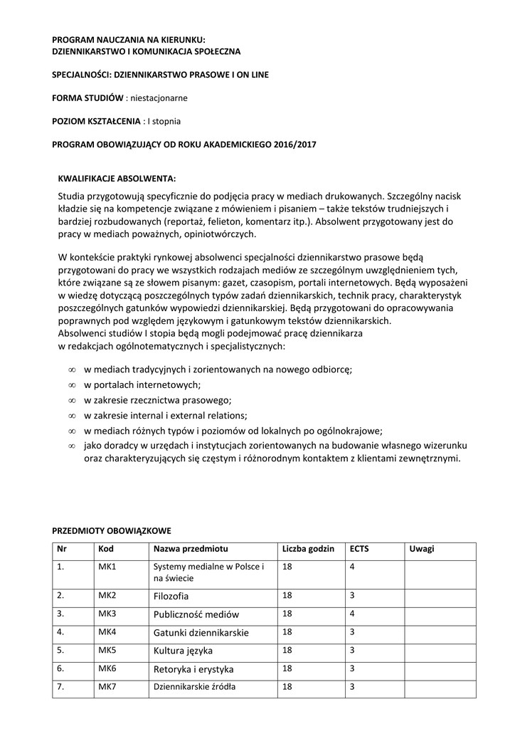 PROGRAM NAUCZANIA NA KIERUNKU: DZIENNIKARSTWO I KOMUNIKACJA SPOŁECZNA SPECJALNOŚCI: DZIENNIKARSTWO PRASOWE I ON LINE FORMA STUDIÓW : niestacjonarne POZIOM KSZTAŁCENIA : I stopnia PROGRAM OBOWIĄZUJĄCY OD ROKU AKADEMICKIEGO 2016/2017 KWALIFIKACJE ABSOLWENTA: Studia przygotowują specyficznie do podjęcia pracy w mediach drukowanych. Szczególny nacisk kładzie się na kompetencje związane z mówieniem i pisaniem – także tekstów trudniejszych i bardziej rozbudowanych (reportaż, felieton, komentarz itp.). Absolwent przygotowany jest do pracy w mediach poważnych, opiniotwórczych. W kontekście praktyki rynkowej absolwenci specjalności dziennikarstwo prasowe będą przygotowani do pracy we wszystkich rodzajach mediów ze szczególnym uwzględnieniem tych, które związane są ze słowem pisanym: gazet, czasopism, portali internetowych. Będą wyposażeni w wiedzę dotyczącą poszczególnych typów zadań dziennikarskich, technik pracy, charakterystyk poszczególnych gatunków wypowiedzi dziennikarskiej. Będą przygotowani do opracowywania poprawnych pod względem językowym i gatunkowym tekstów dziennikarskich. Absolwenci studiów I stopia będą mogli podejmować pracę dziennikarza w redakcjach ogólnotematycznych i specjalistycznych: • • • • • • w mediach tradycyjnych i zorientowanych na nowego odbiorcę; w portalach internetowych; w zakresie rzecznictwa prasowego; w zakresie internal i external relations; w mediach różnych typów i poziomów od lokalnych po ogólnokrajowe; jako doradcy w urzędach i instytucjach zorientowanych na budowanie własnego wizerunku oraz charakteryzujących się częstym i różnorodnym kontaktem z klientami zewnętrznymi. PRZEDMIOTY OBOWIĄZKOWE Nr Kod Nazwa przedmiotu Liczba godzin ECTS 1. MK1 Systemy medialne w Polsce i na świecie 18 4 2. MK2 Filozofia 18 3 3. MK3 Publiczność mediów 18 4 4. MK4 Gatunki dziennikarskie 18 3 5. MK5 Kultura języka 18 3 6. MK6 Retoryka i erystyka 18 3 7. MK7 Dziennikarskie źródła 18 3 Uwagi informacji 8. MK8 Warsztat dziennikarski 18 3 9. MK9 Wprowadzenie do kultury współczesnej 18 4 10. MK10 Prawo 9 4 11. MK11 Nauka o komunikowaniu 36 4 12. MK12 Język wypowiedzi 18 4 dziennikarskiej 13. MK13 Lektorat prasy polskiej 18 4 14. MK14 Podstawy dziennikarstwa 18 3 18 3 18 3 internetowego 15. MK15 Edycja dokumentów i obrazów 16. MK16 Warsztat tekstu informacyjnego 17. MK17 Ochrona własności intelektualnej 9 4 18. MK18 Organizacja i zarządzanie mediami 18 4 19. MK19 Tworzenie i publikowanie 18 4 stron internetowych 20. MK20 Dziennikarstwo sportowe 18 4 21. MK21 Społeczne funkcje 18 3 18 3 dziennikarstwa 22. MK22 Techniki prowadzenia wywiadu 23. MK23 Public Relations – podstawy 18 3 24 MK24 Etyka dziennikarska 18 3 25. MK25 Dziennikarstwo ekonomiczne 18 4 26. MK26 Reklama w prasie 18 3 27. MK27 Warsztat komentatora 18 3 18 3 prasowego 28. MK28 Tworzenie i moderowanie internetowego portalu gazety 29. MK29 Publicystyka – warsztat 18 3 30. MK30 Social media 18 3 31. MK31 Warsztat reportera 18 3 32. MK32 Warsztat korespondenta 18 4 zagranicznego 33. MK33 Czasopisma life stylowe 18 4 34. MK34 Dyskurs prasowy w Polsce i na 18 3 świecie 35. MK35 Język obcy 120 12 36. MK36 Sport a media 18 1 37. MK37 Seminarium licencjackie 36 12 38. MK38 Praktyki zawodowe 60 2 39. MK39 Podstawy przedsiębiorczości 15 1 PRZEDMIOTY DO WYBORU: Nr Kod Nazwa przedmiotu Liczba godzin ECTS 1. MK_O1 Pozycjonowanie w prasie 18 2 2. MK_O1 Kultura pierwszych stron 18 2 3. MK_O2 18 2 4. MK_O2 18 2 5. MK_O3 Agencje informacyjne w Polsce i na świecie Prasa bezpłatna w Polsce i na świecie Organizacja redakcji prasowej 18 2 6. MK_O3 Media Relations - warsztat 18 2 7. MK_O4 18 2 8. MK_O4 Prasowe dziennikarstwo sportowe Dziennikarstwo internetowe – warsztat 18 2 9. MK_O5 Creative Writing 18 2 10. MK_O5 Reklama w prasie - warsztat 18 2 11. MK_O6 Prasa fachowa w Polsce 18 2 12. MK_O6 Promocja prasy 18 2 13. MK_O7 18 2 14. MK_O7 18 2 15. MK_O8 Dziennikarz jako animator lokalnej społeczności Dziennikarz prasy lokalnej i jego warsztat Rzecznictwo prasowe 18 2 16. MK_O8 Warsztat monitoringu prasy 18 2 17. MK_O9 18 2 18. MK_O9 Tabloid a dziennik opiniotwórczy Reportaż ilustrowany 18 2 19. MK_O10 18 2 20. MK_O10 Prasa mniejszości narodowych i etnicznych Prasa katolicka w Polsce 18 2 21. MK_O11 Dziennikarz i jego blog 18 2 22. MK_O11 Praktyczne pisanie felietonu 18 2 Uwagi 23. MK_O12 Współczesny język polski po 1989 roku 18 2 24. MK_O12 Stylistyka wypowiedzi dziennikarskiej 18 2 25. MK_O13 Metody i techniki badania rynku mediów 18 2 26. MK_O13 Polski dyskurs prasowy 18 2 27. MK_O14 18 2 28. MK_O14 Czasopiśmiennictwo poradnikowe Negocjacje i mediacje 18 2 29. MK_O15 Reportaż społeczny 18 2 30. MK_O15 Prasa drugoobiegowa w Polsce 18 2 31. MK_O16 Praktyczne pisanie reportażu 18 2 32. MK_O16 Dziennikarstwo sportowe 18 2 33. MK_O17 Prasowy dział kultury 18 2 34. MK_O17 18 2 35. MK_O18 Warsztat recenzenta teatralnego Warsztat tytułowania tekstów 18 2 36. MK_O18 Fotografia prasowa 18 2 WARUNKI UKOŃCZENIA STUDIÓW I UZYSKANIA TYTUŁU ZAWODOWEGO DANEGO KIERUNKU/SPECJALNOŚCI/SPECJALIZACJI Pozytywna ocena z pracy dyplomowej oraz pozytywna ocena z egzaminu dyplomowego. Praca może mieć charakter projektu poprzedzonego wprowadzeniem teoretycznym. INNE WYMAGANIA Egzamin z języka obcego na poziomie biegłości B2 Europejskiego Opisu Kształcenia Językowego Rady Europy PLAN STUDIÓW NA KIERUNKU: dziennikarstwo i komunikacja społeczna SPECJALNOŚĆ: dziennikarstwo prasowe i on line POZIOM: I I semestr Lp. Nazwa przedmiotu O/F* Forma zajęć** Liczba Forma godzin zaliczenia ECTS 2 Filozofia O Ćwiczenia 18 Z/o 3 3 Socjologia O Ćwiczenia 18 Z/o 4 4 Gatunki dziennikarskie O Ćwiczenia 18 Z/o 3 5 Kultura języka O Ćwiczenia 18 Z/o 3 6 Retoryka i erystyka O Ćwiczenia 18 Z/o 3 7 Nauka o komunikowaniu O Wykład 18 E 4 8 Nauka o komunikowaniu O Ćwiczenia 18 Z/o 3 9 Warsztat dziennikarski O Ćwiczenia 18 Z/o 3 10 Wprowadzenie do k