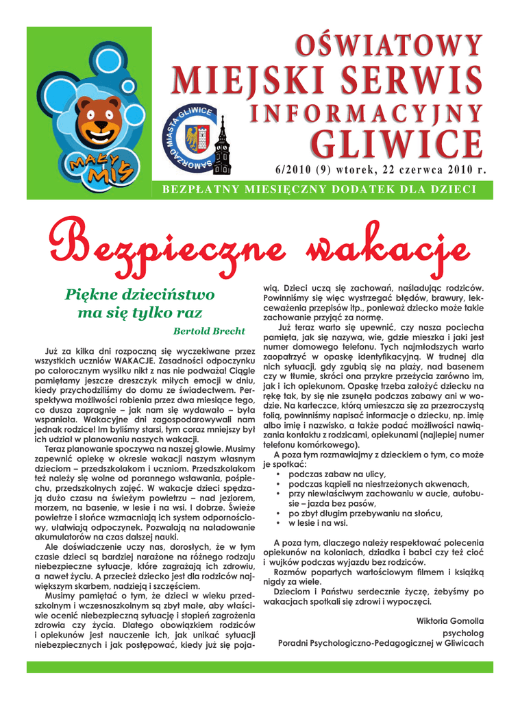 6/2010 (9) wtorek, 22 czerwca 2010 r. BEZPŁATNY MIESIĘCZNY DODATEK DLA DZIECI Bezpieczne wakacje Piękne dzieciństwo ma się tylko raz Bertold Brecht Już za kilka dni rozpoczną się wyczekiwane przez wszystkich uczniów WAKACJE. Zasadności odpoczynku po całorocznym wysiłku nikt z nas nie podważa! Ciągle pamiętamy jeszcze dreszczyk miłych emocji w dniu, kiedy przychodziliśmy do domu ze świadectwem. Perspektywa możliwości robienia przez dwa miesiące tego, co dusza zapragnie – jak nam się wydawało – była wspaniała. Wakacyjne dni zagospodarowywali nam jednak rodzice! Im byliśmy starsi, tym coraz mniejszy był ich udział w planowaniu naszych wakacji. Teraz planowanie spoczywa na naszej głowie. Musimy zapewnić opiekę w okresie wakacji naszym własnym dzieciom – przedszkolakom i uczniom. Przedszkolakom też należy się wolne od porannego wstawania, pośpiechu, przedszkolnych zajęć. W wakacje dzieci spędzają dużo czasu na świeżym powietrzu – nad jeziorem, morzem, na basenie, w lesie i na wsi. I dobrze. Świeże powietrze i słońce wzmacniają ich system odpornościowy, ułatwiają odpoczynek. Pozwalają na naładowanie akumulatorów na czas dalszej nauki. Ale doświadczenie uczy nas, dorosłych, że w tym czasie dzieci są bardziej narażone na różnego rodzaju niebezpieczne sytuacje, które zagrażają ich zdrowiu, a nawet życiu. A przecież dziecko jest dla rodziców największym skarbem, nadzieją i szczęściem. Musimy pamiętać o tym, że dzieci w wieku przedszkolnym i wczesnoszkolnym są zbyt małe, aby właściwie ocenić niebezpieczną sytuację i stopień zagrożenia zdrowia czy życia. Dlatego obowiązkiem rodziców i opiekunów jest nauczenie ich, jak unikać sytuacji niebezpiecznych i jak postępować, kiedy już się poja- wią. Dzieci uczą się zachowań, naśladując rodziców. Powinniśmy się więc wystrzegać błędów, brawury, lekceważenia przepisów itp., ponieważ dziecko może takie zachowanie przyjąć za normę. Już teraz warto się upewnić, czy nasza pociecha pamięta, jak się nazywa, wie, gdzie mieszka i jaki jest numer domowego telefonu. Tych najmłodszych warto zaopatrzyć w opaskę identyfikacyjną. W trudnej dla nich sytuacji, gdy zgubią się na plaży, nad basenem czy w tłumie, skróci ona przykre przeżycia zarówno im, jak i ich opiekunom. Opaskę trzeba założyć dziecku na rękę tak, by się nie zsunęła podczas zabawy ani w wodzie. Na karteczce, którą umieszcza się za przezroczystą folią, powinniśmy napisać informacje o dziecku, np. imię albo imię i nazwisko, a także podać możliwości nawiązania kontaktu z rodzicami, opiekunami (najlepiej numer telefonu komórkowego). A poza tym rozmawiajmy z dzieckiem o tym, co może je spotkać: • podczas zabaw na ulicy, • podczas kąpieli na niestrzeżonych akwenach, • przy niewłaściwym zachowaniu w aucie, autobusie – jazda bez pasów, • po zbyt długim przebywaniu na słońcu, • w lesie i na wsi. A poza tym, dlaczego należy respektować polecenia opiekunów na koloniach, dziadka i babci czy też cioć i wujków podczas wyjazdu bez rodziców. Rozmów popartych wartościowym filmem i książką nigdy za wiele. Dzieciom i Państwu serdecznie życzę, żebyśmy po wakacjach spotkali się zdrowi i wypoczęci. Wiktoria Gomolla psycholog Poradni Psychologiczno-Pedagogicznej w Gliwicach Podsumowując pierwsze pół roku istnienia „Małego Misia”, zwróciliśmy się do Państwa z ankietą dotyczącą odbioru pisemka, oceny jego zwartości i formy, a także oczekiwań i sugestii dotyczących rozwoju tego oświatowego dodatku do „Miejskiego Serwisu Informacyjnego”. Liczba udzielonych odpowiedzi (statystyki przedstawiliśmy w majowym numerze) okazała się wystarczająca, aby można było pokusić się o krótką analizę. Ankieta zawierała kilka pytań dotyczących dostępności „Małego Misia”. Byliśmy ciekawi, jak dociera do Państwa nasze pisemko. Okazało się, że przyjęty przez nas sposób dystrybucji – za pośrednictwem przedszkoli i szkół – zdaje egzamin. Oczywiście są miejsca, do których gazetka nie dociera. Po sygnałach od Państwa będziemy się starali rozwiązać ten problem. Na pewno zajmiemy się także nagłaśnianiem dystrybucji „Małego Misia” – niemal połowa respondentów stwierdziła, że nie wie, kiedy ukazuje się kolejny numer. W kierowanej do Państwa ankiecie wiele razy, w różnych formach, pytaliśmy o opinie na temat zawartości „Małego Misia”. Cieszymy się, że podejmowane przez nas tematy uznajecie Państwo za godne uwagi oraz że tematyka pisemka uzyskała najwyższą średnią ocenę w badanych kategoriach. Największym zainteresowaniem cieszył się numer poświęcony feriom w mieście – wnioskujemy z tego, że oczekujecie Państwo przede wszystkim pełnej i bardzo konkretnej informacji o tym, co najmłodszym oferuje nasze miasto. Sięgacie Państwo po pisemko przede wszystkim po to, by spędzić czas z dzieckiem, rozwiązując krzyżówki i rebusy. Postaramy się, aby oferta tego rodzaju zadań była bogata. Nie zgłoszono natomiast uwag dotyczących formy „Małego Misia”. Sposób redagowania pisemka i jego szata graficzna na ogół Państwu odpowiadają. Nie oznacza to oczywiście, że nie będziemy starali się podnieść jakości naszej pracy również i pod tym względem. Państwa ocena bardzo nas satysfakcjonuje. Ponad 60% osób, które odpowiedziały na ankietę, oceniło pisemko dobrze lub wysoko, a ponad 95% respondentów zajrzy do kolejnych numerów „Małego Misia”. Szczególnie jednak jesteśmy zadowoleni z propozycji tematów, które powinniśmy podjąć, oraz innych sugestii dotyczących zawartości i formy kolejnych numerów „Małego Misia”. Większość ze wskazanych przez Państwa problemów podejmiemy w najbliższych (chociaż już powakacyjnych) numerach gazetki. Postaramy się także wprowadzić działy szerzej prezentujące twórczość dzieci –