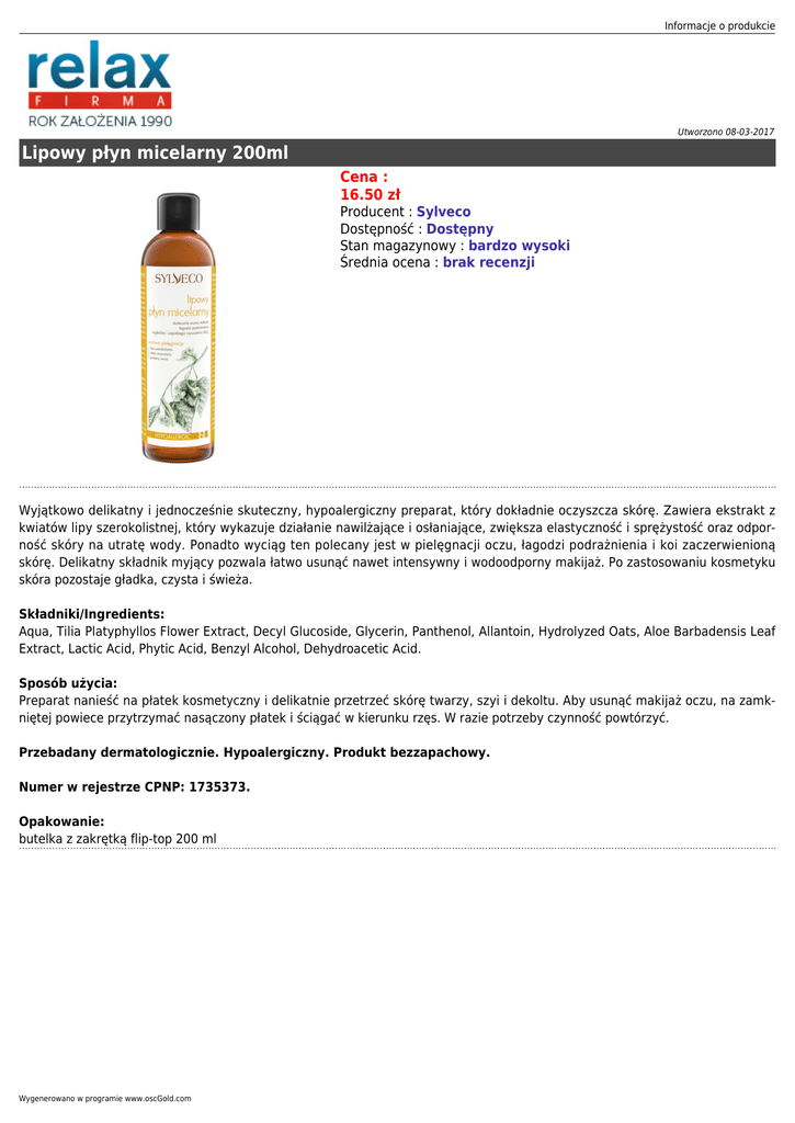 Informacje o produkcie Utworzono 08-03-2017 Lipowy płyn micelarny 200ml Cena : 16.50 zł Producent : Sylveco Dostępność : Dostępny Stan magazynowy : bardzo wysoki Średnia ocena : brak recenzji Wyjątkowo delikatny i jednocześnie skuteczny, hypoalergiczny preparat, który dokładnie oczyszcza skórę. Zawiera ekstrakt z kwiatów lipy szerokolistnej, który wykazuje działanie nawilżające i osłaniające, zwiększa elastyczność i sprężystość oraz odporność skóry na utratę wody. Ponadto wyciąg ten polecany jest w pielęgnacji oczu, łagodzi podrażnienia i koi zaczerwienioną skórę. Delikatny składnik myjący pozwala łatwo usunąć nawet intensywny i wodoodporny makijaż. Po zastosowaniu kosmetyku skóra pozostaje gładka, czysta i świeża. Składniki/Ingredients: Aqua, Tilia Platyphyllos Flower Extract, Decyl Glucoside, Glycerin, Panthenol, Allantoin, Hydrolyzed Oats, Aloe Barbadensis Leaf Extract, Lactic Acid, Phytic Acid, Benzyl Alcohol, Dehydroacetic Acid. Sposób użycia: Preparat nanieść na płatek kosmetyczny i delikatnie przetrzeć skórę twarzy, szyi i dekoltu. Aby usunąć makijaż oczu, na zamkniętej powiece przytrzymać nasączony płatek i ściągać w kierunku rzęs. W razie potrzeby czynność powtórzyć. Przebadany dermatologicznie. Hypoalergiczny. Produkt bezzapachowy. Numer w rejestrze CPNP: 1735373. Opakowanie: butelka z zakrętką flip-top 200 ml Wygenerowano w programie www.oscGold.com