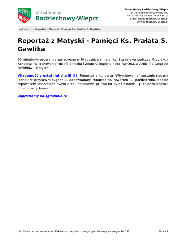 Reportaż z Matyski - Pamięci Ks. Prałata S. Gawlika