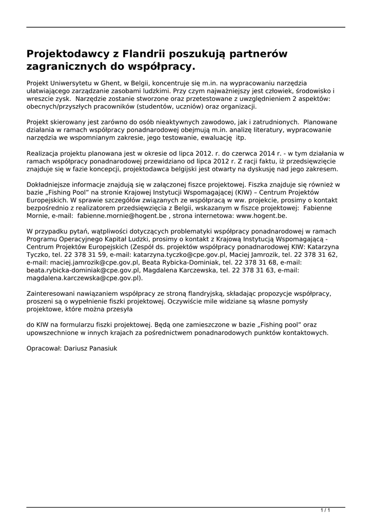 Projektodawcy z Flandrii poszukują partnerów zagranicznych do współpracy. Projekt Uniwersytetu w Ghent, w Belgii, koncentruje się m.in. na wypracowaniu narzędzia ułatwiającego zarządzanie zasobami ludzkimi. Przy czym najważniejszy jest człowiek, środowisko i wreszcie zysk. Narzędzie zostanie stworzone oraz przetestowane z uwzględnieniem 2 aspektów: obecnych/przyszłych pracowników (studentów, uczniów) oraz organizacji. Projekt skierowany jest zarówno do osób nieaktywnych zawodowo, jak i zatrudnionych. Planowane działania w ramach współpracy ponadnarodowej obejmują m.in. analizę literatury, wypracowanie narzędzia we wspomnianym zakresie, jego testowanie, ewaluację itp. Realizacja projektu planowana jest w okresie od lipca 2012. r. do czerwca 2014 r. - w tym działania w ramach współpracy ponadnarodowej przewidziano od lipca 2012 r. Z racji faktu, iż przedsięwzięcie znajduje się w fazie koncepcji, projektodawca belgijski jest otwarty na dyskusję nad jego zakresem. Dokładniejsze informacje znajdują się w załączonej fiszce projektowej. Fiszka znajduje się również w bazie „Fishing Pool” na stronie Krajowej Instytucji Wspomagającej (KIW) – Centrum Projektów Europejskich. W sprawie szczegółów związanych ze współpracą w ww. projekcie, prosimy o kontakt bezpośrednio z realizatorem przedsięwzięcia z Belgii, wskazanym w fiszce projektowej: Fabienne Mornie, e-mail: [email protected] , strona internetowa: www.hogent.be. W przypadku pytań, wątpliwości dotyczących problematyki współpracy ponadnarodowej w ramach Programu Operacyjnego Kapitał Ludzki, prosimy o kontakt z Krajową Instytucją Wspomagającą Centrum Projektów Europejskich (Zespół ds. projektów współpracy ponadnarodowej KIW: Katarzyna Tyczko, tel. 22 378 31 59, e-mail: [email protected], Maciej Jamrozik, tel. 22 378 31 62, e-mail: [email protected], Beata Rybicka-Dominiak, tel. 22 378 31 68, e-mail: [email protected], Magdalena Karczewska, tel. 22 378 31 63, e-mail: [email protected]). Zainteresowani nawiązaniem współpracy ze stroną flandryjską, składając propozycje współpracy, proszeni są o wypełnienie fiszki projektowej. Oczywiście mile widziane są własne pomysły projektowe, które można przesyła do KIW na formularzu fiszki projektowej. Będą one zamieszczone w bazie „Fishing pool” oraz upowszechnione w innych krajach za pośrednictwem ponadnarodowych punktów kontaktowych. Opracował: Dariusz Panasiuk 1/1