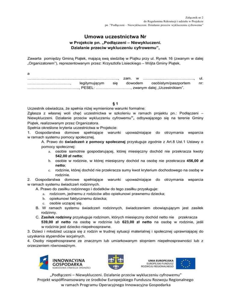 Za cznik nr 2 do Regulaminu Rekrutacji i udzia u w Projekcie pn .”Pod czeni – Niewykluczeni. Dzia anie przeciw wykluczeniu cyfrowemu” Umowa uczestnictwa Nr w Projekcie pn. „Pod czeni – Niewykluczeni. Dzia anie przeciw wykluczeniu cyfrowemu”, Zawarta pomi dzy Gmin Pi tek, maj sw siedzib w Pi tku przy ul. Rynek 16 (zwanym w dalej „Organizatorem”), reprezentowanym przez: Krzysztofa Lisieckiego – Wójta Gminy Pi tek, a ……………...............................................……………., zam. w ………..........…………………., ……………………………, legitymuj cym si dowodem osobistym/paszportem …………………………………., PESEL: ………………………, zwanym dalej „Uczestnikiem”. ul. nr: §1 Uczestnik o wiadcza, e spe nia ni ej wymienione warunki formalne: Zg asza z w asnej woli ch uczestnictwa w szkoleniu w ramach projektu pn.: Pod czeni – Niewykluczeni. Dzia anie przeciw wykluczeniu cyfrowemu”, odbywaj cego si na terenie Gminy Pi tek, realizowanym przez Organizatora. Spe nia okre lone kryteria uczestnictwa w Projekcie: 1. Gospodarstwa domowe spe niaj ce warunki upowa niaj ce do otrzymania wsparcia w ramach systemu pomocy spo ecznej. A. Prawo do wiadcze z pomocy spo ecznej przys uguje zgodnie z Art.8 Ust.1 Ustawy o pomocy spo ecznej: a. osobie samotnie gospodaruj cej, której miesi czny dochód nie przekracza kwoty 542,00 z netto; b. osobie w rodzinie, w której miesi czny dochód na osob nie przekracza 456,00 netto; c. rodzinie, której dochód nie przekracza sumy kwot kryterium dochodowego na osob w rodzinie. 2. Gospodarstwa domowe spe niaj ce warunki upowa niaj ce do otrzymania wsparcia w ramach systemu wiadcze rodzinnych. A. Prawo do zasi ku rodzinnego i dodatków do tego zasi ku przys uguje: a. rodzicom, jednemu z rodziców albo opiekunowi prawnemu dziecka; b. opiekunowi faktycznemu dziecka; c. osobie ucz cej si . B. W ramach systemu wiadcze rodzinnych, wiadczeniem obowi zuj cym jest zasi ek rodzinny. C. Zasi ek rodzinny przys uguje rodzinom, których miesi czny dochód netto nie przekracza 539,00 netto na osob w rodzinie lub 623,00 netto na osob w rodzinie, je li w rodzinie jest dziecko niepe nosprawne. 3. Dzieci i m odzie ucz ca si z rodzin w trudnej sytuacji materialnej i spo ecznej uprawniaj cej do uzyskania stypendiów socjalnych. 4. Osoby niepe nosprawne ze znacznym lub umiarkowanym stopniem niepe nosprawno ci lub z orzeczeniem równowa nym. „Pod czeni – Niewykluczeni. Dzia anie przeciw wykluczeniu cyfrowemu” Projekt wspó finansowany ze rodków Europejskiego Funduszu Rozwoju Regionalnego w ramach Programu Operacyjnego Innowacyjna Gospodarka 5. Wszystkie grupy docelowe. 1. Kryteriami obowi zkowymi dla ka dej z grup sjest: a. sta y lub czasowy meldunek na terenie Gminy Pi tek; b. spe nienie minimum jednej z przes anek wynikaj cej z § 1; c. brak dost pu do Internetu w gospodarstwie domowym i nieposiadanie komputera; d. uko czenie szkolenia komputerowego w ramach projektu przez przynajmniej jednego domownika; e. dostarczenie wymaganych dokumentów oraz podpisanie umowy z Beneficjentem. §2 1. Uczestnik o wiadcza, e zapozna si z Regulaminem Rekrutacji do projektu „Pod czeni – Niewykluczeni. Dzia anie przeciw wykluczeniu cyfrowemu” i go akceptuje. 2. Uczestnik o wiadcza, e w celu udokumentowania spe nienia wymogów formalnych z nast puj ce dokumenty: - formularz rekrutacyjny wraz z niezb dnymi za cznikami. 3. Uczestnik przyjmuje do wiadomo ci, e z one dokumenty nie podlegaj zwrotowi. §3 1. Organizator, zobowi zuje si do przeprowadzenia szkolenia w zakresie obs ugi komputera, podstawowych programów komputerowych, korzystania z Internetu, cznie 30 szkole po 30 godzin szkoleniowych/grupa( cznie 300 os.:30 grup po 10 osób). W ramach szkolenia uczestnik zostanie zakwalifikowany do grupy szkoleniowej w ramach nast puj cych modu ów tematycznych, na podstawie ankiety dotycz cej oceny umiej tno ci obs ugi komputera oraz preferencji w zakresie szkolenia komputerowego: a. Modu I (..... godzin) Podstawy obs ugi komputera, b. Modu II (...... godzin) Pos ugiwanie si edytorem tekstu, c. Modu III (...... godzin) Pos ugiwanie si arkuszem kalkulacyjnym, d. Modu IV (...... godzin) Tworzenie stron www. 2. Organizator zobowi zuje si do zapewnienia zaplecza lokalowego, technicznego i kadrowego, niezb dnego do realizacji projektu. §4 1. Uczestnik przyjmuje do wiadomo ci, e Projekt wspó finansowany jest przez Uni Europejsk ze rodków Europejskiego Funduszu Rozwoju Regionalnego w ramach Programu Operacyjnego Innowacyjna Gospodarka. 2. Organizator zobowi zuje si do: a. zorganizowania szkolenia w godzinach, które zostan ustalone na podstawie danych zebranych od Uczestników, tak by by y to terminy przyst pne, b. zapewnienia materia ów dydaktycznych niezb dnych do realizacji szkolenia, c. wydania certyfikatów uko czenia szkolenia. Ze wskazaniem ile godzin (30 godzin) obejmowa o szkolenie, a tak e jakie poszczególne modu y tematyczne zosta y przeprowadzone. 3. Uczestnik zobowi zuje si do: a. regularnego uczestnictwa w zaj ciach, potwierdzonego wpisem na list obecno ci, b. informowania Organizatora o rezygnacji z udzia u w szkoleniu, c. wype niania ankiet w trakcie trwania Projektu i po jego zako czeniu, „Pod czeni – Niewykluczeni. Dzia anie przeciw wykluczeniu cyfrowemu” Projekt wspó finansowany ze rodków Europejskiego Funduszu Rozwoju Regionalnego w ramach Programu Operacyjnego Innowacyjna Gospodarka d. uczestnik wyra a zgod na udokumentowanie dokumentacji fotograficznej ze szkole na potrzeby realizacji projektu. 4. Uczestnik ma prawo do jednorazowej zmiany grupy, je eli pozwala na to sk ad liczbowy grupy, do której mia oby nast pi przeniesienie. 5. W przypadku nieobecno ci na zaj ciach spowodowanej wypadkami losowymi, jak np. choroba. Uczestnik zobowi zany jest do przed enia odpowiedniego za wiadczenia lekarskiego 6. W przypadku rezygnacji z udzia u w Projekcie, Uczestnik zobowi zany jest do z enia pise