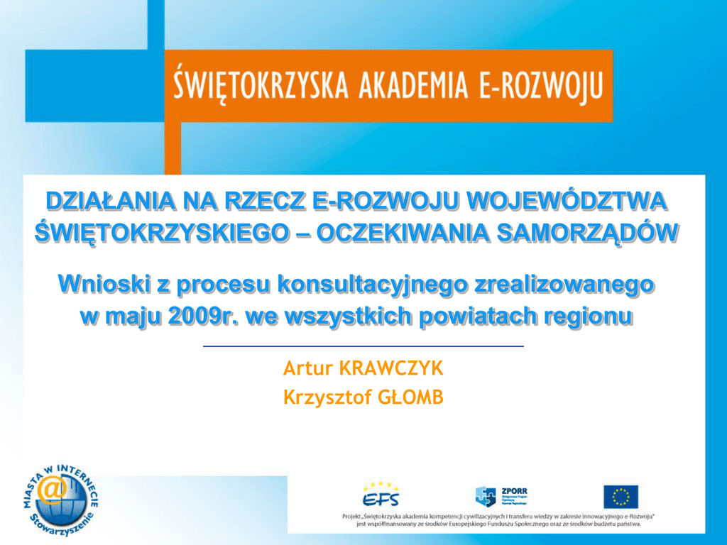 DZIAŁANIA NA RZECZ E-ROZWOJU WOJEWÓDZTWA ŚWIĘTOKRZYSKIEGO – OCZEKIWANIA SAMORZĄDÓW Wnioski z procesu konsultacyjnego zrealizowanego w maju 2009r. we wszystkich powiatach regionu Artur KRAWCZYK Krzysztof GŁOMB © SMWI 2009 Postawy, poglądy i oczekiwania pracowników samorządów Jeżeli nie zacznie się dyskusja o eRadzie to nic się nie uda. Mówienie do radnych o informatyzacji będzie przegrywać jeżeli z poziomu marszałka nie będzie rozwiązań pomocnych, które zauważą radni. Bez spotkań z władzą wykonawczą, przewodniczącymi rad, spotkań z radami nie ma szans aby przedsięwzięcia się powiodły. Mamy koła gospodyń wiejskich, zamieńmy je w e-koła gospodyń, aby one mogły za pomoc a przez skype’a rozmawiać z innym kołem. Trzeba sprawić, aby tematyka społeczeństwa informacyjnego trafiła do strategii lokalnych Decydenci w gminach nie rozumieją potrzeb inwestycji w społeczeństwo informacyjne Wiedza jest nikła wśród decydentów Pracownicy są w różnym wieku i starsze osoby nie są w ogóle przygotowane Słaba jest polityka informacyjna Urzędu Marszałkowskiego na temat realizowanych projektów – za mało szczegółowych informacji, nieznane plany na przyszłość, co chwilę się coś pojawia nowego Powinien zmienić się sposób organizowania projektów, powinni być włączeni ludzie, których dana aplikacja ma dotyczyć – pani z referatów ochrony środowisk, księgowa. Każda gmina jest specyficzna i powinna mieć inne aplikacje dostosowane do indywidualnych potrzeb. © SMWI, 2009 © SMWI 2009 Świętokrzyska Akademia e-Rozwoju , Kielce 17 czerwca 2009r. 2 Postawy i poglądy decydentów samorządowych Są przeszkody jeśli chodzi o budowę sieci w ramach PO RPW. Nikt z nami nic nie konsultuje i nikt nam nic nie mówi a to my jesteśmy jednym z elementów tego projektu. Pokazują nam na prezentacjach sieć szkieletową, ale nie mówią nic więcej o szczegółach. W związku z tym większość z nas podchodzi sceptycznie do projektów które się nam proponuje – mimo tego że chcemy je robić. e-świadomosć to jest e-społeczeństwo i u nas tego nie ma Co chwilę mówicie że coś już jest, już rusza już działa, już podpisujemy umowę i nic się nie zmienia. Nie dzieją się realne prace tylko ciągle gadamy. To ciekawe jest ale ileż można o tym gadać. Trzeba iść przed siebie i robić projektu Ja mam w urzędzie 15 pracowników to po co mam budować jakieś narzędzia dla urzędu skoro to się nie opłaca i nie ma sensu. Nie wytłumaczymy ludziom, że robimy światłowód a nie drogi. © SMWI, 2009 © SMWI 2009 Muszą się zmienić ludzie. Jeszcze ze dwa pokolenia i może mentalność się zmieni i będzie można realizować projekty społeczeństwa informacyjnego. Słabe zainteresowanie większości wójtów i sekretarzy gmin tematami społeczeństwa informacyjnego W gminach temat społeczeństwa informacyjnego nie jest poruszany poza informatykiem i wójtem, który deleguje na szkolenia. Rada gminy też nie widzi problemu, gdyż nie ma wśród nich świadomości. Od niedawna informatyk w gminie B. jest na półetatu. Radni nie są świadomi – słabo wykształceni. Świętokrzyska Akademia e-Rozwoju , Kielce 17 czerwca 2009r. 3 Społeczeństwo informacyjne na wsi i w mieście Społeczność wiejska nie widzi potrzeb. Brak dostępu powoduje niską świadomość. Ludzie nie wiedzą jakie możliwości daje technologia. W działania trzeba włączyć Izby Rolnicze i Ośrodki doradztwa rolniczego, gdyż oni mają swoich przedstawicieli w terenie Nasza urząd w S. dwukrotnie poniósł fiasko 2 wdrożeń na których zostały zmarnowane środki finansowe. Należy uprościć język spotkań dotyczących społeczeństwa informacyjnego gdyż większość decydentów nie rozumie o czym się do nich mówi e-świadomosć to jest e-społeczeństwo i u nas tego nie ma Na wsi jest kompletna plaża, jeśli chodzi o dorosłych. W bardzo wielu domach są komputery i Internet, ale ludzie odganiają się od nich jak od much. Korzystają z nich tylko dzieci, głównie dla gier © SMWI, 2009 © SMWI 2009 Mamy koła gospodyń wiejskich, zamieńmy je w e-koła gospodyń, aby one mogły za pomoc a przez skype’a rozmawiać z innym kołem. Są takie miejscowości gdzie dostępu do Internetu w ogóle nie ma i nie widać tych, którzy mieliby go zbudować Problemem jest świadomość społeczeństwa. Tylko 30% społeczeństwa ma dostęp do sieci. Nie ma zapotrzebowania. Ludzie mentalnie nie są gotowi. Świętokrzyska Akademia e-Rozwoju , Kielce 17 czerwca 2009r. 4 Edukacja, alfabetyzacja, szkolenia, uświadamianie Urząd jest zinformatyzowany, ale gorzej jest z umiejętnościami pracowników Szkolenia są niezbędne. Społeczeństwo potrzebuje wiedzy. Mamy dowody na to, że bez umiejętności obsługi Internetu nie wszystko możemy załatwić. Leśnicy sprzedają drewno tylko w formie aukcji Samorządy mogą wspomóc elektronicznych ostatnio. realizację szkoleń udostępniając swoją infrastrukturę np.: sale w Projekt szkoleniowy jest szkołach. Pomyślmy mocno o niezbędny. Tak dla urzędników rolnikach. jak i dla mieszkańców. Konieczne są szkolenia dla wójtów i radnych Województwo musi nam umożliwić pozyskiwanie wiedzy. To jest rola władz regionalnych. Należy uprościć język spotkań dotyczących społeczeństwa informacyjnego gdyż większość decydentów nie rozumie o czym się do nich mówi Poziom kompetencji i umiejętności urzędników jest niedostateczny, jeżeli nie ma informatyka, a pilnie trzeba przekazać sprawozdanie to jest dramat. © SMWI, 2009 © SMWI 2009 e-świadomosć to jest e- społeczeństwo i u nas tego nie ma Jeśli chodzi o eInclusion to najpierw potrzebna jest alfabetyzacja cyfrowa. E-alfabetyzacja - człowiek też sam musi się uczyć bo inaczej będzie wykluczony Świętokrzyska Akademia e-Rozwoju , Kielce 17 czerwca 2009r. 5 Dziękuję za uwagę ! Kontakt: Artur KRAWCZYK [email protected] kom.: 502.357.58