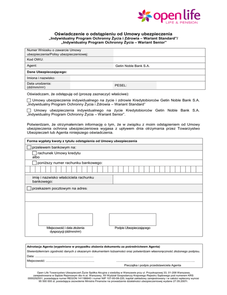 Oświadczenie o odstąpieniu od Umowy ubezpieczenia „Indywidualny Program Ochronny Życia i Zdrowia – Wariant Standard”/ „Indywidualny Program Ochronny Życia – Wariant Senior” Numer Wniosku o zawarcie Umowy ubezpieczenia/Polisy ubezpieczeniowej: Kod OWU: Agent: Getin Noble Bank S.A. Dane Ubezpieczającego: Imiona i nazwisko: Data urodzenia: (dd/mm/rrrr) PESEL: Oświadczam, że odstępuję od (proszę zaznaczyć właściwe): Umowy ubezpieczenia indywidualnego na życie i zdrowie Kredytobiorców Getin Noble Bank S.A. „Indywidualny Program Ochronny Życia i Zdrowia – Wariant Standard” Umowy ubezpieczenia indywidualnego na życie Kredytobiorców Getin Noble Bank S.A. „Indywidualny Program Ochronny Życia – Wariant Senior”. Potwierdzam, że otrzymałem/am informację o tym, że w związku z moim odstąpieniem od Umowy ubezpieczenia ochrona ubezpieczeniowa wygasa z upływem dnia otrzymania przez Towarzystwo Ubezpieczeń lub Agenta niniejszego oświadczenia. Forma wypłaty kwoty z tytułu odstąpienia od Umowy ubezpieczenia przelewem bankowym na: rachunek Umowy kredytu albo poniższy numer rachunku bankowego: imię i nazwisko właściciela rachunku bankowego: przekazem pocztowym na adres: Miejscowość i data złożenia dyspozycji (dd/mm/rrrr) Podpis Ubezpieczającego Adnotacja Agenta (wypełniane w przypadku złożenia dokumentu za pośrednictwem Agenta) Stwierdziłem/am zgodność danych z okazanym dokumentem tożsamości oraz potwierdzam własnoręczność złożonego podpisu. Data: ..................................................................... Miejscowość: ......................................................... ...............……………………………………………………….. Pieczątka i podpis przedstawiciela Agenta Open Life Towarzystwo Ubezpieczeń Życie Spółka Akcyjna z siedzibą w Warszawie przy ul. Przyokopowej 33, 01-208 Warszawa, zarejestrowana w Sądzie Rejonowym dla m.st. Warszawy, XII Wydział Gospodarczy Krajowego Rejestru Sądowego pod numerem KRS 0000292551, posiadająca numer REGON 141186640 i numer NIP 107-00-08-220, kapitał zakładowy zarejestrowany i w całości wpłacony wynosi 95 500 000 zł, posiadająca zezwolenie Ministra Finansów na prowadzenie działalności ubezpieczeniowej wydane 27.09.2007r.