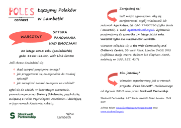 Łączymy Polaków Zarejestruj się! w Lambeth! Ilość miejsc ograniczona. Aby się zarejestrować, wyślij wiadomość lub zadzwoń: Aga Kulesa, tel. 020 77937730 (tylko środa WARSZTAT SZTUKA PANOWANIA NAD EMOCJAMI 23 lutego 2015 roku (poniedziałek) godz. 18:00–21:00, Weir Link Centre Jeśli chcesz dowiedzieć się: i czwartek), e-mail: [email protected]. Zgłoszenia przyjmujemy do czwartku 19 lutego 2015 roku. Warsztat tylko dla mieszkańców Lambeth. Warsztat odbędzie się w the Weir Community and Childern’s Centre, 33 Weir Road, London SW12 0NU (najbliższa stacja metra: Balham lub Clapham North, autobusy nr 155, 255, 417). skąd czerpać pozytywne emocje? Kim jesteśmy? jak przygotować się emocjonalnie do trudnej sytuacji? Warsztat organizowany jest w ramach jak zarządzać swoimi emocjami na codzień? zgłoś się do udziału w bezpłatnym warsztacie, prowadzonym przez Barbarę Sobolewską, psycholożkę związaną z Polish Psychologists’ Association i działającą w jego ramach Akademią Kobiety. projektu „Poles Connect”, realizowanego od stycznia 2015 roku przez Stockwell Partnership. Stockwell Partnership, 157 South Lambeth Road, London SW8 1XN Zobacz także: www.facebook.com/PolesConnect oraz www.stockwell.org.uk