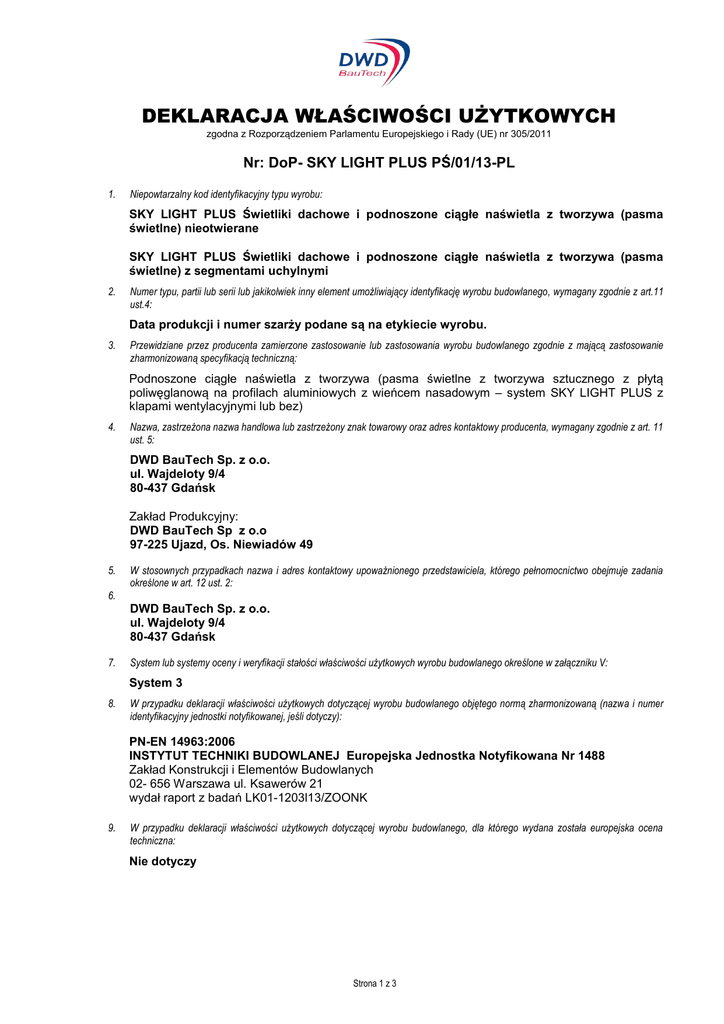 DEKLARACJA WŁAŚCIWOŚCI UŻYTKOWYCH zgodna z Rozporządzeniem Parlamentu Europejskiego i Rady (UE) nr 305/2011 Nr: DoP- SKY LIGHT PLUS PŚ/01/13-PL 1. Niepowtarzalny kod identyfikacyjny typu wyrobu: SKY LIGHT PLUS Świetliki dachowe i podnoszone ciągłe naświetla z tworzywa (pasma świetlne) nieotwierane SKY LIGHT PLUS Świetliki dachowe i podnoszone ciągłe naświetla z tworzywa (pasma świetlne) z segmentami uchylnymi 2. Numer typu, partii lub serii lub jakikolwiek inny element umożliwiający identyfikację wyrobu budowlanego, wymagany zgodnie z art.11 ust.4: Data produkcji i numer szarży podane są na etykiecie wyrobu. 3. Przewidziane przez producenta zamierzone zastosowanie lub zastosowania wyrobu budowlanego zgodnie z mającą zastosowanie zharmonizowaną specyfikacją techniczną: Podnoszone ciągłe naświetla z tworzywa (pasma świetlne z tworzywa sztucznego z płytą poliwęglanową na profilach aluminiowych z wieńcem nasadowym – system SKY LIGHT PLUS z klapami wentylacyjnymi lub bez) 4. Nazwa, zastrzeżona nazwa handlowa lub zastrzeżony znak towarowy oraz adres kontaktowy producenta, wymagany zgodnie z art. 11 ust. 5: DWD BauTech Sp. z o.o. uI. Wajdeloty 9/4 80-437 Gdańsk Zakład Produkcyjny: DWD BauTech Sp z o.o 97-225 Ujazd, Os. Niewiadów 49 5. W stosownych przypadkach nazwa i adres kontaktowy upoważnionego przedstawiciela, którego pełnomocnictwo obejmuje zadania określone w art. 12 ust. 2: 6. DWD BauTech Sp. z o.o. uI. Wajdeloty 9/4 80-437 Gdańsk 7. System lub systemy oceny i weryfikacji stałości właściwości użytkowych wyrobu budowlanego określone w załączniku V: System 3 8. W przypadku deklaracji właściwości użytkowych dotyczącej wyrobu budowlanego objętego normą zharmonizowaną (nazwa i numer identyfikacyjny jednostki notyfikowanej, jeśli dotyczy): PN-EN 14963:2006 INSTYTUT TECHNIKI BUDOWLANEJ Europejska Jednostka Notyfikowana Nr 1488 Zakład Konstrukcji i Elementów Budowlanych 02- 656 Warszawa ul. Ksawerów 21 wydał raport z badań LK01-1203l13/ZOONK 9. W przypadku deklaracji właściwości użytkowych dotyczącej wyrobu budowlanego, dla którego wydana została europejska ocena techniczna: Nie dotyczy Strona 1 z 3 DEKLARACJA WŁAŚCIWOŚCI UŻYTKOWYCH zgodna z Rozporządzeniem Parlamentu Europejskiego i Rady (UE) nr 305/2011 Nr: DoP- SKY LIGHT PLUS PŚ/01/13-PL 10. Deklarowane właściwości użytkowe: Właściwości użytkowe Zasadnicze charakterystyki Przepuszczalność powietrza Przepuszczalność powietrza Pasmo stałe (bez klap wentylacyjnych) - Z klapami wentylacyjnymi - Pasmo stałe (bez klap wentylacyjnych) Klasa 3 Z klapami wentylacyjnymi Klasa 2 Wodoszczelność Norma klasyfikacyjna PN-EN 12152:2004 PN-EN 12207:2001 + PN-EN 14963:2006 Odpornośc na obciążenia odrywające UL 3000 (3000Pa) PN-EN 14963:2006 Odpornośc na obciążenia dociskające DL 1750 (1750Pa) PN-EN 14963:2006 Odporność na uderzenia ciałem twardym + + PN-EN 14963:2006 Odporność na uderzenia ciałem miękkim-ciężkim Pozycja horyzontalna SB 1200 (1,8m) Pozycja wertykalna ”-” brak klasyfikacji, ”+” spełnione SB 1200 (2,4m) PN-EN 14963:2006 11. Właściwości użytkowe wyrobu określone w pkt 1 i 2 są zgodne z właściwościami użytkowymi deklarowanymi w pkt 9. Niniejsza deklaracja właściwości użytkowych wydana zostaje na wyłączną odpowiedzialność producenta określonego w pkt 4. W imieniu producenta podpisał: Gdańsk, 06.11.2013 r. Miejsce i data wydania Robert Mróz Prezes Zarządu Nazwisko i stanowisko Podpis Załączniki do Deklaracji Właściwości Użytkowych: 1 Informacje, o których mowa w art. 6 (5) CPR i art. 31 Rozporządzenia REACH (WE) nr 1907/2006: Nie dotyczy 2 Informacje, o których mowa w art. 6 (5) CPR i art. 33 Rozporządzenia REACH (WE) nr 1907/2006 – informacje na temat substancji wzbudzających szczególne obawy (SVHC): Nie dotyczy 3 Kopia oznakowania CE Strona 2 z 3 DEKLARACJA WŁAŚCIWOŚCI UŻYTKOWYCH zgodna z Rozporządzeniem Parlamentu Europejskiego i Rady (UE) nr 305/2011 Nr: DoP- SKY LIGHT PLUS PŚ/01/13-PL Załącznik - Kopia oznakowania CE 1488 DWD BauTech Sp. z o.o., uI. Wajdeloty 9/4, 80-437 Gdańsk 13 DoP - SKY LIGHT PLUS PŚ/01/13-PL EN 14963:2006 SKY LIGHT PLUS Podnoszone ciągłe naświetla z tworzywa (pasma świetlne z tworzywa sztucznego z płytą poliwęglanową na profilach aluminiowych z wieńcem nasadowym) Przepuszczalność powietrza Pasmo stałe (bez klap wentylacyjnych) Klasa 3 Z klapami wentylacyjnymi Klasa 2 Wodoszczelność + Odpornośc na obciążenia odrywające UL 3000 (3000Pa) Odpornośc na obciążenia dociskające DL 1750 (1750Pa) Odporność na uderzenia ciałem twardym + + Odporność na uderzenia ciałem miękkim-ciężkim Pozycja horyzontalna SB 1200 (1,8m) Pozycja wertykalna SB 1200 (2,4m) (+) spełnia wymagania Strona 3 z 3