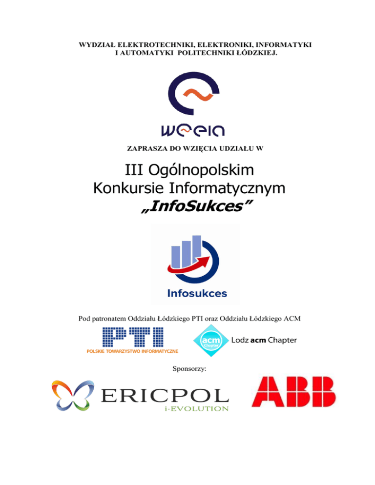 WYDZIAŁ ELEKTROTECHNIKI, ELEKTRONIKI, INFORMATYKI I AUTOMATYKI POLITECHNIKI ŁÓDZKIEJ. ZAPRASZA DO WZIĘCIA UDZIAŁU W III Ogólnopolskim Konkursie Informatycznym „InfoSukces” Pod patronatem Oddziału Łódzkiego PTI oraz Oddziału Łódzkiego ACM Sponsorzy: III Ogólnopolski Konkurs Informatyczny dla szkół gimnazjalnych i ponadgimnazjalnych InfoSukces REGULAMIN II Ogólnopolskiego Konkursu Informatycznego dla szkół gimnazjalnych i ponadgimnazjalnych „InfoSukces” §1 Cele konkursu Główne cele Konkursu „InfoSukces” to: inspirowanie młodzieży szkół gimnazjalnych oraz ponadgimnazjalnych do głębszego zainteresowania się informatyką i wykorzystywania poznanych reguł w sytuacjach typowych oraz nowych (problemowych), motywowanie uczniów do bardzo dobrego przygotowania się do egzaminu dojrzałości poprzez stworzenie możliwości ciągłego sprawdzania swojej wiedzy, propagowanie wśród uczniów nowoczesnych technik informatycznych służących rozwojowi logicznego myślenia oraz nauk ścisłych, zachęcanie szkół do wspierania i rozwijania informatycznych zainteresowań uczniów oraz do zwrócenia uwagi na możliwości wykorzystania nowoczesnych narzędzi informatycznych w procesie dydaktycznym. §2 Organizatorzy 1. Organizatorem Konkursu „InfoSukces” jest Wydział Elektrotechniki, Elektroniki, Informatyki i Automatyki Politechniki Łódzkiej. 2. Dziekan Wydziału Elektrotechniki, Elektroniki, Informatyki i Automatyki Politechniki Łódzkiej powołuje Komisję Konkursową czuwającą nad przebiegiem Konkursu. W skład Komisji Konkursowej wchodzą przedstawiciele Wydziału Elektrotechniki, Elektroniki, Informatyki i Automatyki Politechniki Łódzkiej wydelegowani przez Dziekana Wydziału oraz przedstawiciele sponsorów. §3 Uczestnicy konkursu Uczestnikiem Konkursu może być każdy uczeń szkoły gimnazjalnej oraz ponadgimnazjalnej z terenu całej Polski. Zgłoszenie Uczestnika musi spełniać następujące kryteria: 1. Uczestnik zgłosi się do Konkursu do dnia 23 grudnia 2015 poprzez wysłanie e-maila na adres: [email protected] zawierającego następujące dane: Adres email – adres email jest jednocześnie identyfikatorem, który służy do dalszej komunikacji z organizatorami Imię Nazwisko Numer PESEL Nazwa szkoły Imię i Nazwisko Opiekuna (w szkole powinien być tylko jeden koordynator – Opiekun Konkursu) http://www.weeia.p.lodz.pl/ Strona 2 z 6 III Ogólnopolski Konkurs Informatyczny dla szkół gimnazjalnych i ponadgimnazjalnych InfoSukces 2. 3. 4. 5. Numer telefonu (do wiadomości organizatorów i ułatwienia kontaktu w przypadkach wymagających bezzwłocznego kontaktu) Opiekun potwierdza rejestrację szkoły poprzez wypełnienie formularza dostępnego na stronie Konkursu. Następnie wydrukowany i podpisany przez Dyrekcję placówki formularz powinien zostać wysłany na adres organizatora podany w § 5 pkt. 1. Opiekun zbiera od uczniów oświadczenia przygotowane zgodnie ze wzorem dostępnym na stronie głównej Konkursu. Istnieje możliwość zgłoszenia więcej niż jednego uczestnika w jednym mailu, przy poddaniu adresów mailowych i pozostałych wskazanych wyżej danych wszystkich zgłaszanych osób. Szkoła, której uczniowie biorą udział w konkursie ma prawo do umieszczenia stosownych informacji oraz odpowiednich znaków graficznych Konkursu na stronie internetowej szkoły oraz w materiałach promocyjnych. §4 Harmonogram konkursu Konkurs odbywa się zgodnie z następującym harmonogramem 2 listopada 2015 – rozpoczęcie Konkursu „InfoSukces”, rozpoczęcie I etapu rywalizacji. 2 listopada 2015 – 23 grudnia 2016 - rejestracja uczestników indywidualnych 2 listopada 2015 – 23 grudnia 2016 – rejestracja szkół – przesłanie formularzy podpisanych przez Dyrekcje placówek. 10 stycznia 2016 – nadesłanie zadań konkursowych I etapu 10 lutego 2016 – ogłoszenie listy uczestników zakwalifikowanych do II etapu xxx marca 2016 – przeprowadzenie II etapu konkursu w siedzibie organizatora xxx marca 2016 – rozegranie III etapu – finału konkursu w siedzibie organizatora xxx marca 2016 – ogłoszenie wyników konkursu §5 Przebieg i zasady konkursu Konkurs składa się z 3 etapów rywalizacji, polegających na: 1. Etap I – do 10 stycznia 2016 Temat zadania etapu kwalifikacyjnego: "Jak to działa?". W ramach tego zadania należy wykonać prezentację, grę wyjaśniającą zasadę działania urządzenia technicznego (najlepiej elektrycznego, energetycznego). Zadanie polega na opracowaniu i przesłaniu na adres organizatora autorskiego projektu związanego z tematem zadania. Projekt może być wykonany dowolną techniką informatyczną z użyciem komputera. Dodatkowe punkty można zdobyć wykonując zadanie z wykorzystaniem środowiska programowania wizualnego SCRATCH (www.scratch.mit.edu). Uczniów szkół ponadgimnazjalnych obowiązuje dodatkowy warunek w postaci zastosowania w projekcie interakcji np. możliwości wyboru ścieżki, wariantów działania. Wykonaną pracę należy przesłać w terminie do 10 stycznia 2016 na adres e-mail [email protected] lub na płycie CD/DVD na adres: dr inż. Ewa Korzeniewska Wydział Elektrotechniki, Elektroniki, Informatyki Automatyki Politechniki Łódzkiej ul. Stefanowskiego 18/22, 90-924 Łódź z dopiskiem „Konkurs informatyczny InfoSukces” http://www.weeia.p.lodz.pl/ Strona 3 z 6 III Ogólnopolski Konkurs Informatyczny dla szkół gimnazjalnych i ponadgimnazjalnych InfoSukces Nadesłane prace oceniać będzie Komisja Konkursowa. Ocenie podlegać będą wysiłek programistyczny, estetyka wykonania oraz oryginalność wykonania. Do II etapu zostanie zakwalifikowanych maksymalnie 50 osób Wyniki I etapu zostaną ogłoszone w formie opublikowanego rankingu szkół na podstawie sumarycznej liczby zgłoszeń i liczby uzyskanych miejsc w II etapie, a także indywidualnie w postaci listy uczestników zakwalifikowanych do II etapu oraz w formie wiadomości email rozsyłanych do uczest