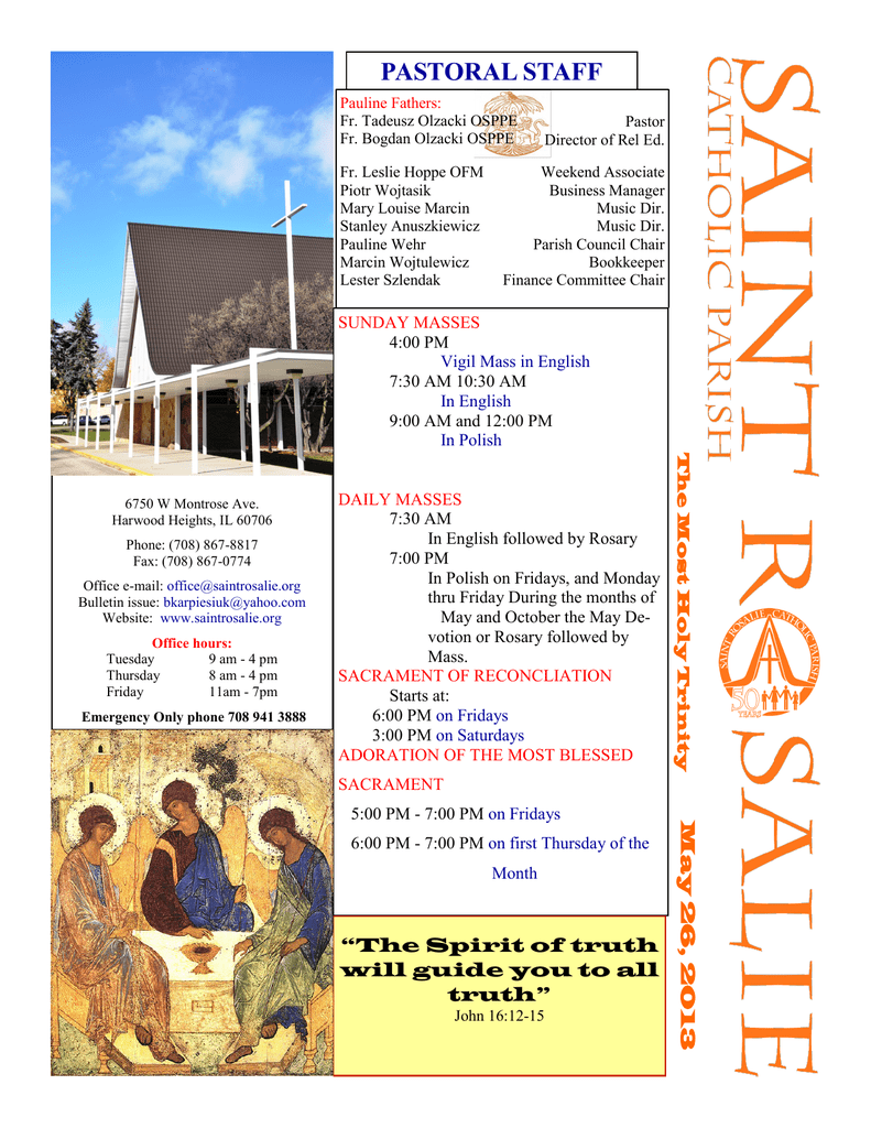 PASTORAL STAFF Pauline Fathers: Fr. Tadeusz Olzacki OSPPE Fr. Bogdan Olzacki OSPPE Fr. Leslie Hoppe OFM Piotr Wojtasik Mary Louise Marcin Stanley Anuszkiewicz Pauline Wehr Marcin Wojtulewicz Lester Szlendak Pastor Director of Rel Ed. Weekend Associate Business Manager Music Dir. Music Dir. Parish Council Chair Bookkeeper Finance Committee Chair SUNDAY MASSES 4:00 PM Vigil Mass in English 7:30 AM 10:30 AM In English 9:00 AM and 12:00 PM In Polish Phone: (708) 867-8817 Fax: (708) 867-0774 Office e-mail: [email protected] Bulletin issue: [email protected] Website: www.saintrosalie.org Office hours: Tuesday 9 am - 4 pm Thursday 8 am - 4 pm Friday 11am - 7pm Emergency Only phone 708 941 3888 DAILY MASSES 7:30 AM In English followed by Rosary 7:00 PM In Polish on Fridays, and Monday thru Friday During the months of May and October the May Devotion or Rosary followed by Mass. SACRAMENT OF RECONCLIATION Starts at: 6:00 PM on Fridays 3:00 PM on Saturdays ADORATION OF THE MOST BLESSED The Most Holy Trinity 6750 W Montrose Ave. Harwood Heights, IL 60706 SACRAMENT 6:00 PM - 7:00 PM on first Thursday of the Month “The Spirit of truth will guide you to all truth” John 16:12-15 May 26, 2013 5:00 PM - 7:00 PM on Fridays f St. Rosalie BAPTISMS: “Cast yourself in the arms of God and be very sure Our Parish celebrates that if He wants anything of you, He will fit you Baptisms on the first for the work and give you strength.” Sunday Of the month. -St Philip Neri Za tydzień, 2 czerwca -Wymiana Tajemnic Rożańcowych. Wszyscy chętni, którzy chcą dołączyć się do odmawiania Różańca proszeni są o kontakt z ojcem Bogdanem . Do You Dream of being a Teacher? St. Rosalie Religious Education is looking for dedicated adults and teens to teach and aide on Sunday mornings for Recycle, Recycle Please keep bringing your paper to the bins in the parking lot. -The Religious Ed Department Duch Święty uczy nas spoglądać oczyma Chrystusa Duch Święty prowadzi Kościół, podobnie jak każdego z nas, w poszukiwaniu prawdy. Prawda nie jest jakąś rzeczą do uchwycenia, ale konkretną osobą do spotkania: osobą samego Jezusa Chrystusa. Jedynie spotykając Jezusa, możemy poznać Prawdę. Duch Święty jest zatem Parakletem, tj. tym, „który przychodzi nam z pomocą”, by dać nam przeżyć to spotkanie i powiedzieć: „Jezus jest Panem”. W jaki sposób to czyni? Duch Święty przypomina nam słowa Jezusa i wpisuje w nasze serca prawo Ewangelii, które staje się przewodnikiem naszego życia, punktem odniesienia w naszych wyborach i postępowaniu. Co więcej, poprzez Ducha Świętego Ojciec i Syn przychodzą, by w nas zamieszkać, dzięki czemu nabywamy autentycznego „zmysłu wiary”. Duch Święty umożliwia nam – bez popełniania błędów – przylgnięcie do wiary przekazywanej i nauczanej przez Magisterium Kościoła i pozwala nam żyć jej pełnią. Na wzór Maryi Dziewicy, która tak doskonale potrafiła otworzyć swoje serce i przyjąć Życie, trzeba, abyśmy dali ogarnąć się Jego światłu, tak aby wiara w Chrystusa umarłego i zmartwychwstałego kierowała odtąd całym naszym życiem. 2 Katecheza Ojca Świętego Franciszka wygłoszona podczas cotygodniowej audiencji środowej w Watykanie 8 maja 2013 r. Parents are asked to Participate in the preparation meeting before the date is scheduled. Please call the rectory for an appointment. Required Documents: Birth certificate of the child, proof of catholic parish membership (for at least 6 months) for both parents as well as sponsors. WEDDINGS: The Archdiocese of Chicago requires arrangements for weddings be made 6 months in advanced. Please call the office for an appointment. Required Documents: Baptismal certificates for the engaged, proof of membership to a catholic parish ( for at least 6 months) for both bride and groom, proof of completion of pre-cana Program. SACRAMENT OF THE SICK Please call the office to make arrangements. Our priest visits the sick on the first Friday of the month or as needed. COMMUNION CALLS Please call the office or emergency phone number to make arrangements to receive communion at home or a hospital Volunteers in the parish office DYŻURY woluntariuszy w biurze parafialnym W poniedziałek od 10 rano -12 00 woluntariusz (angielskopolski ) oraz od 12:00-14:00 (tylko po angielsku). W środy od 10:00- 14:00 (tylko angielsko-hiszpanski ). Archdiocese Celebrating Memorial Day at the Catholic Cemeteries Memorial Day Mass will be celebrated on Monday, May 27, 2013 at 10:30 a.m. at all of our major cemeteries, along with our parish cemetery Masses. Please check Catholic New World and local newspapers for the list of major cemeteries, parish cemeteries and celebrants near you. Sunday Mass schedule from Memorial Day until Labor Day: Saturday 4:00 PM English Sunday 7:30 AM English Sunday 9:00 AM Polish Sunday 10:30 AM English Sunday 12:00 Noon Polish Monday Sir 17:20-24 Ps 32:1-2, 5-7 Mk 10:17-27 Tuesday Sir 35:1-12 Ps 50:5-8, 14, 23 Mk 10:28-31 Wednesday Sir 36:1, 4-5a, 10-17 Ps 79:8-9, 11, 13 Mk 10:32-45 Thursday Sir 42:15-25 Ps 33:2-9 Mk 10:46-52 Friday Zep 3:14-18a or Rom 12:9-16 Is 12:2-3, 4bcd-6 Lk 1:39-56 Saturday Sir 51:12cd-20 Ps 19:8-11 Mk 11:27-33 Sunday Gn 14:18-20 Ps 110:1-4 1 Cor 11:23-26 Lk 9:11b-17 Please pray for your Parish St. Rosalie On Mondays the office will be open from 10 am- 2 pm; On Wednesdays the office will be open from 10am to 2pm ( Spanish /English speaking volunteer) READINGS FOR THE WEEK Have you ever thought about a vocation to priesthood or reliWakacyjny rozkład niedzielnych mszy sw. od Memorial gious life? For information about Day do Labor Day the priesthood in the ArchdioSobota 4:00 PM w jęz. angielskim cese of Chicago, contact Fr. Niedziela 7:30 AM w jęz. angielskim Brian Welter at 312-534-8298 or Niedziela 9:00 AM w jęz. polskim [email protected]. For Niedziela 10:30 AM w jęz. angielskim information about religious life Niedziela 12:00 w jęz. polskim contact Sr. Elyse 