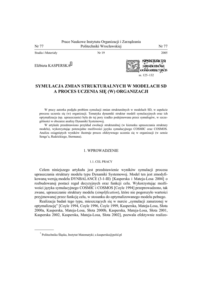 Nr 77 Prace Naukowe Instytutu Organizacji i Zarządzania Politechniki Wrocławskiej Studia i Materiały Nr 19 Nr 77 2005 Elżbieta KASPERSKA* ss. 125–132 SYMULACJA ZMIAN STRUKTURALNYCH W MODELACH SD A PROCES UCZENIA SIĘ (W) ORGANIZACJI W pracy autorka podjęła problem symulacji zmian strukturalnych w modelach SD, w aspekcie procesu uczenia się (w) organizacji. Tematyka dynamiki struktur modeli symulacyjnych oraz ich optymalizacja (np. upraszczanie) była do tej pory rzadko podejmowana przez symulogów, w szczególności w obszarze analizy Dynamiki Systemowej. W artykule przedstawiono przykład ewolucji strukturalnej (w kierunku upraszczania struktury modelu), wykorzystując potencjalne możliwości języka symulacyjnego COSMIC oraz COSMOS. Analiza osiągniętych wyników ilustruje proces efektywnego uczenia się w organizacji (w sensie Senge’a, Radzickiego, Stermana). 1. WPROWADZENIE 1.1. CEL PRACY Celem niniejszego artykułu jest przedstawienie wyników symulacji procesu upraszczania struktury modelu typu Dynamiki Systemowej. Model ten jest zmodyfikowaną wersją modelu DYNBALANCE (3-1-III) [Kasperska i Mateja-Losa 2004] o rozbudowanej postaci reguł decyzyjnych oraz funkcji celu. Wykorzystując możliwości języka symulacyjnego COSMIC i COSMOS [Coyle 1994] przeprowadzono, tak zwane, upraszczanie struktury modelu (simplification), które nie pogorszyło wartości przyjmowanej przez funkcję celu, w stosunku do optymalizowanego modelu pełnego. Realizacja badań tego typu, mieszczących się w nurcie „symulacji zanurzonej w optymalizację” [Coyle 1994, Coyle 1996, Coyle 1999, Kasperska, Mateja-Losa, Słota 2000a, Kasperska, Mateja-Losa, Słota 2000b, Kasperska, Mateja-Losa, Słota 2001, Kasperska 2002, Kasperska, Mateja-Losa, Słota 2002], pozwala efektywnie realizo__________ * Politechnika Śląska, Instytut Matematyki; [email protected] 126 Elżbieta Kasperska wać proces uczenia się (w) [2003], Stermana [2000]. organizacji, w sensie Senge’a [1998], Radzickiego 1.2. PROBLEM UCZENIA SIĘ (W) ORGANIZACJI A ZAGADNIENIE EWOLUCJI STRUKTURALNEJ MODELI TYPU SD W jednej ze swoich prac Sterman [2000] przedstawił wyidealizowany proces uczenia się w złożonych systemach. Przedstawia go rysunek 1. (tłumaczenie autorki). Świat rzeczywisty • nieznana struktura • dynamiczna złożoność • opóźnienia czasowe • niemożliwość prowadzenia kontrolowanych eksperymentów Świat wirtualny • znana struktura • zmienny poziom złożoności • kontrolowane eksperymenty DECYZJE Świat realny Świat wirtualny • doskonałe wdrożenie • zgodne bodźce • zgodne zastosowanie reguł decyzyjnych • uczenie się jest celem • porażka wdrożenia • udawanie • sprzeczność • celem jest zachowanie Strategia, struktura, reguły decyzyjne • użycie symulacji w celu wnioskowania o dynamice modeli myślowych INFORMACYJNE SPRZĘŻENIE ZWROTNE Świat wirtualny • pełność • dokładność • natychmiastowe sprzężenie zwrotne Świat rzeczywisty • wybiórcza percepcja • przerywane sprzężenie zwrotne • opóźnienia • odchylenie, zniekształcenie, błąd • niejednoznaczność Modele myślowe • odwzorowanie struktury sprzężeń • zastosowanie wnioskowania naukowego • zachowanie obronne Rys. 1. Wyidealizowany proces uczenia się. Efektywne uczenie się pociąga za sobą ciągłe eksperymentowanie zarówno w świecie wirtualnym, jak i rzeczywistym. Sprzężenia z obu tych światów „informują” rozwój modeli myślowych, modeli formalnych i projekt eksperymentów dla następnej iteracji Według [Sterman 2000; str. 34], tłumaczenie autorki. Symulacja zmian strukturalnych w modelach SD a proces uczenia się (w) organizacji 127 Koncepcja ewolucyjnych zmian Hamiltona [Radzicki 2003], może być odniesiona do Dynamiki Systemowej, na trzech poziomach: • Procesu uczenia się w trzech pętlach sprzężeń zwrotnych. • Procesu modelowania jako takiego. • Procesu symulacji dynamiki. Gdy proces modelowania trwa dostatecznie długo, może wystąpić wiele zmian (w świecie rzeczywistym oraz w modelu): • Struktura świata rzeczywistego może się zmieniać. • Zachowanie świata rzeczywistego może ulegać zmianom. • Cel budowy modelu może ulegać zmianie. • Model może ulegać zmianom. Klasyczna Dynamika Systemowa zakłada, iż podczas symulacji (w całym horyzoncie symulacji) struktura modelu (dana a priori) pozostaje niezmieniona. Idea Radzickiego [Radzicki 2003], tak zwanego procesu uczenia się w trzech pętlach sprzężeń zwrotnych, pokazuje, że w trakcie procesu modelowania i symulacji (w szczególności na modelach „własnych” (tzw. self-made models) realizuje się efektywne uczenie (w) organizacji. Dotyczy to, najbardziej, trzeciej pętli, tak zwanych zmian ewolucyjnych (rys. 2). Zostanie to pokazane w następnym rozdziale. Rzeczywisty system Decyzje pętla 1 Informacje pętla 2 Reguły decyzyjne(polityki) warunkowane przez struktury instytucjonalne, strategie organizacyjne, normy kulturowe pętla 3 Modele Myślowe i Teoria Rys. 2. Ewolucja jako proces uczenia się w trzech pętlach sprzężeń wg Radzickiego [2003] 128 Elżbieta Kasperska tau frd ard rpr poziom zapasu produktu ( lin ) rm1 tasmo tpr tchn1 irm1 rrm rm2 poziom produktu ( lmt ) podczas transformacji tchn2 zródlo 2 tprice rsl irm2 bilans surowca irm3 tchn3 rm3 fprice cena popyt ( rd ) zródlo 1 cost2 cost1 desir zródlo 3 incost dod (zysk) rlopr rm1 rm2 rm3 penal1 suma strat zysku ( lopr ) g1, g2, g3 rcrm suma kosztów surowców (scrm) penalty penal2 rcpr suma kosztów produkcji (scpr) maxfo fob cofprk Rys. 3. Struktura modelu DYNBALANCE (3-1-III-α) 2. PRZYKŁAD SYMULACJI NA MODELU O ZMIENNEJ STRUKTURZE – MODEL DYNABALANCE (3-1-III-α) 2.1 STRUKTURA MODELU Strukturę modelu w konwencji Łukaszewicza DYNBALANCE (3-1-III-α) przedstawia rysunek 3. Szczególną uwagę należy zwrócić na parametry: α, β , γ. Ich opcjonalny charakter ma znaczenie przy wyborze wartości 