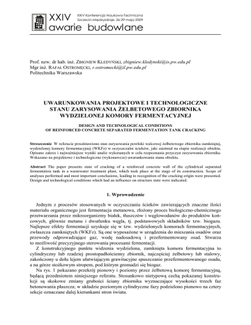 XXIV awarie budowlane XXIV Konferencja Naukowo-Techniczna Szczecin-Międzyzdroje, 26-29 maja 2009 Prof. nzw. dr hab. inŜ. ZBIGNIEW KLEDYŃSKI, [email protected] Mgr inŜ. RAFAŁ OSTROMĘCKI, [email protected] Politechnika Warszawska UWARUNKOWANIA PROJEKTOWE I TECHNOLOGICZNE STANU ZARYSOWANIA śELBETOWEGO ZBIORNIKA WYDZIELONEJ KOMORY FERMENTACYJNEJ DESIGN AND TECHNOLOGICAL CONDITIONS OF REINFORCED CONCRETE SEPARATED FERMENTATION TANK CRACKING Streszczenie W referacie przedstawiono stan zarysowania powłoki walcowej Ŝelbetowego zbiornika zamkniętej, wydzielonej komory fermentacyjnej (WKFz) w oczyszczalni ścieków, jaki zaistniał na etapie realizacji obiektu. Opisano zakres i najwaŜniejsze wyniki analiz wykonanych w celu rozpoznania przyczyn zarysowania zbiornika. Wskazano na projektowe i technologiczne (wykonawcze) uwarunkowania stanu obiektu. Abstract The paper presents state of cracking of a reinforced concrete wall of the cylindrical separated fermentation tank in a wastewater treatment plant, which took place at the stage of its construction. Scope of analyses performed and most important conclusions, leading to recognition of the cracking origin were presented. Design and technological conditions which had an influence on structure state were indicated. 1. Wprowadzenie Jednym z procesów stosowanych w oczyszczaniu ścieków zawierających znaczne ilości materiału organicznego jest fermentacja metanowa, złoŜony proces biologiczno-chemicznego przetwarzania przez mikroorganizmy białek, tłuszczów i węglowodanów do produktów końcowych, głównie metanu i dwutlenku węgla, tj. podstawowych składników tzw. biogazu. Najlepsze efekty fermentacji uzyskuje się w tzw. wydzielonych komorach fermentacyjnych, zwłaszcza zamkniętych (WKFz). Są one wyposaŜone w urządzenia do mieszania osadów oraz przewody odprowadzające gaz, wodę nadosadową i przefermentowany osad. Stwarza to moŜliwość precyzyjnego sterowania procesami fermentacji. Z konstrukcyjnego punktu widzenia wydzielona, zamknięta komora fermentacyjna to cylindryczny lub rzadziej prostopadłościenny zbiornik, najczęściej Ŝelbetowy lub stalowy, zakończony u dołu lejem ułatwiającym grawitacyjne spuszczanie przefermentowanego osadu, a na górze stoŜkowym stropem, pod którym gromadzi się biogaz. Na rys. 1 pokazano przekrój pionowy i poziomy przez Ŝelbetową komorę fermentacyjną, będącą przedmiotem niniejszego referatu. Stosunkowo nietypową cechą pokazanej konstrukcji są skokowe zmiany grubości ściany zbiornika wyznaczające wysokości trzech faz betonowania płaszcza; w układzie poziomym cylindryczne fazy podzielono pionowo na cztery sekcje oznaczane dalej kierunkami stron świata. Konstrukcje Ŝelbetowe 230 30 30 30 40 50 616 60 410 2100 90 500 100 40 410 30 80 632 R1 11 0 60 0 05 R1 R1 14 0 90 130 50 180 180 193 0 09 R1 Rys. 1. Charakterystyczne przekroje zbiornika 2. Stan obiektu i jego historia Stan zbiornika w dniu oględzin (jesień 2007 r.) przedstawiał się następująco. Na ścianach zewnętrznych widoczne były nieliczne ślady przeciekania oraz wycieki iniektu w miejscach wykonywania prac uszczelniających (rys. 2) oraz przecieki spod pierścienia górnego (od strony północnej) i zacieki z nieszczelności w dwóch niŜszych, poziomych szwach betonowania. Ściany były gładkie, z pewną liczbą otwartych pęcherzy powietrznych; nie stwierdzono niekontrolowanych szwów roboczych i miejsc Ŝwirowych (tzw. raki). Stan zarysowania płaszcza pokazano schematycznie na rys. 3. Pierwsze rysy (w fazie I) o rozwartości do 0,15 mm zauwaŜono po 3÷4 tygodniach od zabetonowania; rysy w fazach II i III ujawniły się dopiero po napełnieniu zbiornika wodą. W trakcie napełniania zbiornika wystąpiły takŜe przecieki przez poziome szwy betonowania i wówczas wykonano iniekcję tych szwów przez umieszczone w nich wcześniej węŜyki iniekcyjne (w trzech poziomych szwach płaszcza, tj. między ławą i fazą I oraz między fazami I i II oraz II i III, węŜyk iniekcyjny zdublowano wkładką z taśmy bentonitowej). Iniekcja dała efekty umiarkowanie zadawalające, ale przerwała drenowanie nieszczelności szwu przez węŜyk i zlikwidowała rozpływanie się wody wzdłuŜ szwów. Pierwszemu napełnieniu zbiornika (próba wodna) towarzyszyły pomiary geodezyjne osiadań obiektu. Ich wyniki wskazują na równomierne i stosunkowo niewielkie osiadania zbiornika. Świadczy to dobrze o jakości posadowienia i wyklucza ewentualne róŜnice osiadań jako potencjalną przyczynę zarysowań. Z uzyskanych danych wynikało, Ŝe względem Specyfikacji Technicznych Wykonania i Odbioru Robót Budowlanych obiektu, za zgodą Inwestora i Projektanta, zmieniono stal zbrojeniową z 18G2 (A-II) na BSt 500 (A-IIIN) – bez zmiany ilości i rozmieszczenia – oraz cement z portlandzkiego CEM I 52,5 NA na hutniczy CEM III/A 32,5 N – LH/HSR/NA. Zastąpiono takŜe część grysów bazaltowych Ŝwirem i uŜyto superplastyfikatora polimerowego. W Specyfikacji nie limitowano skurczu betonu ani temperatury mieszanki betonowej lub przyrostu tej wielkości. 770 Kledyński Z. i inni: Uwarunkowania projektowe i technologiczne stanu zarysowania… Rys. 2. Widok zarysowań płaszcza zbiornika w trakcie prac iniekcyjnych Z Pd W Pn III II I Rys. 3. Stan zarysowania płaszcza zbiornika – ściana w rozwinięciu, z podziałem na fazy i sekcje betonowania Realizacyjny podział płaszcza zbiornika na fazy i sekcje betonowania sprowadził się do wykonania: – na pierścieniowej ławie fazy I o wysokości 5 m, podzielonej na cztery sekcje o długości około 17,4 m kaŜda; najpierw wykonano sekcje nieparzyste, a później parzyste, – wyŜej leŜącej fazy II o wysokości 4,1 m, podzielonej w planie jak faza I (bez przesunięcia), – fazy III o wysokości 4,1 m i podzielonej jak wyŜej, – pierścienia górnego ze stoŜkiem górnym zbiornika. Dni i miesiące betonowania poszczególnych sekcji podano na rys. 4, na którym pokazano