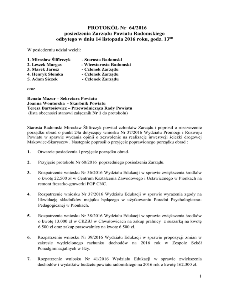 PROTOKÓŁ Nr 64/2016 posiedzenia Zarządu Powiatu Radomskiego odbytego w dniu 14 listopada 2016 roku, godz. 1300 W posiedzeniu udział wzięli: 1. Mirosław Ślifirczyk 2. Leszek Margas 3. Marek Jarosz 4. Henryk Słomka 5. Adam Siczek - Starosta Radomski - Wicestarosta Radomski - Członek Zarządu - Członek Zarządu - Członek Zarządu oraz Renata Mazur – Sekretarz Powiatu Joanna Wontorska - Skarbnik Powiatu Teresa Bartosiewicz – Przewodnicząca Rady Powiatu (lista obecności stanowi załącznik Nr 1 do protokołu) Starosta Radomski Mirosław Ślifirczyk powitał członków Zarządu i poprosił o rozszerzenie porządku obrad o punkt 24a dotyczący wniosku Nr 37/2016 Wydziału Promocji i Rozwoju Powiatu w sprawie wydania opinii o zezwolenie na realizację inwestycji ścieżki drogowej Makowiec-Skaryszew . Następnie poprosił o przyjęcie poprawionego porządku obrad : 1. Otwarcie posiedzenia i przyjęcie porządku obrad. 2. Przyjęcie protokołu Nr 60/2016 poprzedniego posiedzenia Zarządu. 3. Rozpatrzenie wniosku Nr 36/2016 Wydziału Edukacji w sprawie zwiększenia środków o kwotę 22.500 zł w Centrum Kształcenia Zawodowego i Ustawicznego w Pionkach na remont frezarko-grawerki FGP CNC. 4. Rozpatrzenie wniosku Nr 37/2016 Wydziału Edukacji w sprawie wyrażenia zgody na likwidację składników majątku będącego w użytkowaniu Poradni PsychologicznoPedagogicznej w Pionkach. 5. Rozpatrzenie wniosku Nr 38/2016 Wydziału Edukacji w sprawie zwiększenia środków o kwotę 13.000 zł w CKZiU w Chwałowicach na zakup pralnicy z suszarką na kwotę 6.500 zł oraz zakup prasowalnicy na kwotę 6.500 zł. 6. Rozpatrzenie wniosku Nr 39/2016 Wydziału Edukacji w sprawie propozycji zmian w zakresie wydzielonego rachunku dochodów na 2016 rok w Zespole Szkół Ponadgimnazjalnych w Iłży. 7. Rozpatrzenie wniosku Nr 41/2016 Wydziału Edukacji w sprawie zwiększenia dochodów i wydatków budżetu powiatu radomskiego na 2016 rok o kwotę 162.300 zł. 1 8. Rozpatrzenie wniosku Nr 32/2016 Powiatowego Zarządu Dróg Publicznych w sprawie wyrażenia zgody na likwidację środków trwałych i pozostałych środków trwałych stanowiących własność Powiatu Radomskiego będących w użytkowaniu PZDP w Radomiu. 9. Rozpatrzenie wniosku Nr 33/2016 Powiatowego Zarządu Dróg Publicznych w Radomiu w sprawie dokonania zmian w budżecie powiatu polegających na zmniejszeniu dochodów budżetu powiatu na 2016 rok w dziale 600 rozdział o kwotę 10.295,00 zł z jednoczesnym zmniejszeniem wydatków budżetu powiatu na 2016 rok o w/w kwotę na zadaniu inwestycyjnym Radom –Dąbrówka –Podłężna. 10. Rozpatrzenie wniosku Nr 34/2016 Powiatowego Zarządu Dróg Publicznych w Radomiu w sprawie dokonania zmian w budżecie powiatu polegających na zwiększeniu dochodów budżetu powiatu na 2016 rok o kwotę 907.158,00 z jednoczesnym zwiększeniem wydatków budżetu powiatu na 2016 rok w PZDP w w/w kwotę na zadaniu inwestycyjnym Zalesice-przebudowa drogi Gmina Wierzbica. 11. Rozpatrzenie wniosku Nr 35/2016 Powiatowego Zarządu Dróg Publicznych w Radomiu w sprawie dokonania zmian w budżecie polegających na przeniesieniu wydatków między rozdziałami. 12. Rozpatrzenie wniosku Nr 26/2016 Wydziału Zdrowia i Spraw Społecznych w sprawie ustalenia rozkładu godzin pracy aptek ogólnodostępnych na terenie Powiatu Radomskiego na 2017 rok. 13. Rozpatrzenie wniosku Nr 27/2016 Wydziału Zdrowia i Spraw Społecznych w sprawie zmian w budżecie powiatu radomskiego na 2016 r. w Starostwie Powiatowym w Radomiu. 14. Rozpatrzenie wniosku Nr 36/2016 Wydziału Promocji i Rozwoju Powiatu w sprawie uchwalenia rocznego programu współpracy z organizacjami pozarządowymi oraz innymi podmiotami prowadzącymi działalność pożytku publicznego w 2017 roku. 15. Rozpatrzenie wniosku Nr 4/2016 Powiatowego Zespołu ds. Orzekania Niepełnosprawności w sprawie dokonania zmian w budżecie powiatu na 2016 rok. 16. Rozpatrzenie wniosku Nr 48/2016 Powiatowego Centrum Pomocy Rodzinie w Radomiu w sprawie wyrażenia zgody na dokonanie przeniesień w planie wydatków DPS Jedlanka. 17. Rozpatrzenie wniosku Nr 49/2016 Powiatowego Centrum Pomocy Rodzinie w Radomiu w sprawie dokonania zmian w Uchwale Nr 131/XIV/2016 Rady Powiatu w Radomiu z dnia 18 marca 2016 r w sprawie określenia zadań na 2016 roku, na które przeznacza się przyznane według algorytmu środki PFRON. o 2 18. Rozpatrzenie wniosku Nr 50/2016 Powiatowego Centrum Pomocy Rodzinie w Radomiu w sprawie wyrażenia zgody na dokonanie przeniesień w planie wydatków w ŚDS w Jedlance. 19. Rozpatrzenie wniosku Nr 51/2016 Powiatowego Centrum Pomocy Rodzinie w Radomiu w sprawie dokonania zmian w Wykazie Przedsięwzięć do Wieloletniej Prognozy Finansowej. 20. Rozpatrzenie wniosku Nr 7/2016 Wydziału Geodezji, Kartografii, Katastru i Nieruchomości dotyczący decyzji Zarządu Powiatu w sprawie przekazania trwałego zarządu między jednostkami organizacyjnymi Powiatu Radomskiego. 21. Rozpatrzenie wniosku Nr 8/2016 Wydziału Geodezji, Kartografii, Katastru i Nieruchomości w sprawie zasad nabycia nieruchomości rolnej oznaczonej jako działka ewidencyjna nr 113, położonej w mieście Iłża. 21a Rozpatrzenie wniosku Nr 8/2016 Wydziału Organizacji i Nadzoru w sprawie zwiększenia wydatków w Dziale 700 – wydatki na zakupy inwestycyjne jednostek budżetowych o kwotę 109.000,00 zł z przeznaczeniem na wprowadzenie nowego zadania pn. ‘Nabycie prawa własności nieruchomości rolnej położonej w Iłży przy ul.dr. Anki , oznaczonej jako dz. Ew. nr 113”. 22. Rozpatrzenie wniosku Nr 4 /2016 Biura ds. Funduszy przyjęcie Informacji o wynikach monitoringu Strategii Zrównoważonego Rozwoju Powiatu Radomskiego do 2020 r. analiza porównawcza 2007 - 2015 (w związku z okresową oceną przebiegu wdrażania Strategii) oraz przedłożenie jej Radzie Powiatu. 23. Rozpatrzenie wniosku Nr 8/2016 Wydziału Rolnictwa, Leśnictwa, Ochrony Środowiska i Gospodarki Wodnej w sprawie zaopiniowania „