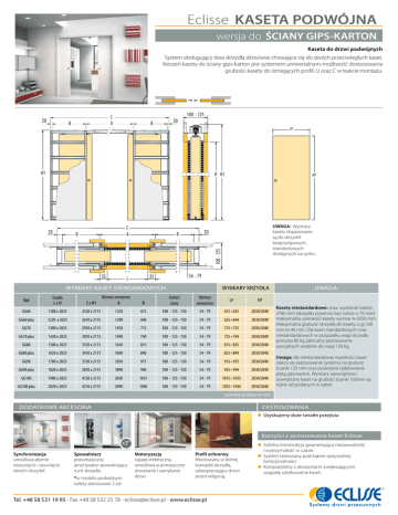 Eclisse KASETA PODWÓJNA wersja do ŚCIANY GIPS-KARTON Kaseta do drzwi podwójnych System obsługujący dwa skrzydła drzwiowe chowające się do dwóch przeciwległych kaset. Kieszeń kasety do ściany gips-karton jest systemem uniwersalnym-możliwość dostosowania grubości kasety do istniejących profili U oraz C w trakcie montażu. 20 100 - 125 C A B 20 B LP H1 H H1 20 C A UWAGA: Wymiary kasety dopasowane są do skrzydeł bezprzylgowych, standardowych dostępnych na rynku. 20 B 100 - 125 B HP 35 54 - 79 35 L WYMIARY KASET STANDARDOWYCH Wymiary zewnętrzne WYMIARY KRZYDŁA LxH C x H1 A B Grubość ściany Wymiary wewnętrzne LP HP GG60 1180 x 2025 2520 x 2115 1250 615 100 - 125 - 150 54 - 79 615÷635 2030/2040 GG60 plus 1220 x 2025 2610 x 2115 1290 640 100 - 125 - 150 54 - 79 625÷644 2030/2040 GG70 1380 x 2025 2920 x 2115 1450 715 100 - 125 - 150 54 - 79 715÷735 2030/2040 Kod Światło GG70 plus 1420 x 2025 3010 x 2115 1490 740 100 - 125 - 150 54 - 79 725÷744 2030/2040 GG80 1580 x 2025 3320 x 2115 1650 815 100 - 125 - 150 54 - 79 815÷835 2030/2040 GG80 plus 1620 x 2025 3410 x 2115 1690 840 100 - 125 - 150 54 - 79 825÷844 2030/2040 GG90 1780 x 2025 3720 x 2115 1850 915 100 - 125 - 150 54 - 79 915÷935 2030/2040 GG90 plus 1820 x 2025 3810 x 2115 1890 940 100 - 125 - 150 54 - 79 925÷944 2030/2040 GG100 1980 x 2025 4120 x 2115 2050 1015 100 - 125 - 150 54 - 79 1015÷1035 2030/2040 GG100 plus 2020 x 2025 4210 x 2115 2090 1040 100 - 125 - 150 54 - 79 1025÷1044 2030/2040 Uwaga: Kasety niestandardowe: max. wysokość kasety 2785 mm (skrzydło powinno być niższe o 75 mm) maksymalna szerokość kasety wymiar A-3050 mm. Maksymalna grubość skrzydła do kasety o gr.100 mm to 40 mm. Dla kaset standardowych oraz niestandardowych w przypadku wagi skrzydła powyżej 80 kg zalecamy zastosowanie specjalnych wózków do wagi 120 kg. Uwaga: dla niestandardowej wysokości kaset zaleca się zastosowanie systemu na grubość ścianki 125 mm oraz podwójne opłytowanie płytą gips-karton. Wymiary wewnętrzne i zewnętrzne kaset na grubość ścianki 150mm są różne od podanych w tabeli. wymiary podano w mm. Dodatkowe akcesoria Zastosowania Uzyskujemy duże światło przejścia Korzyści z zastosowania kaset Eclisse x 2* Synchronizacja umożliwia płynne rozsunięcie i zasunięcie dwóch skrzydeł Spowalniacz pneumatyczny amortyzator spowalniający ruch skrzydła. *w modelu podwójnym należy zastosować 2 szt. Motoryzacja napęd elektryczny, umożliwia automatyczne otwieranie i zamykanie drzwi. Profil ochronny Montowany w dolnej krawędzi skrzydła, zabezpieczający drzwi przed wilgocią. Tel. +48 58 531 19 95 - Fax +48 58 532 25 78 - [email protected] - www.eclisse.pl Solidna konstrukcja gwarantująca niezawodność I wytrzymałość w czasie. System testowany pod kątem optymalnej funkcjonalności Kompatybilny z akcesoriami zwiększającymi wygodę użytkowania kaset. Systemy drzwi przesuwnych