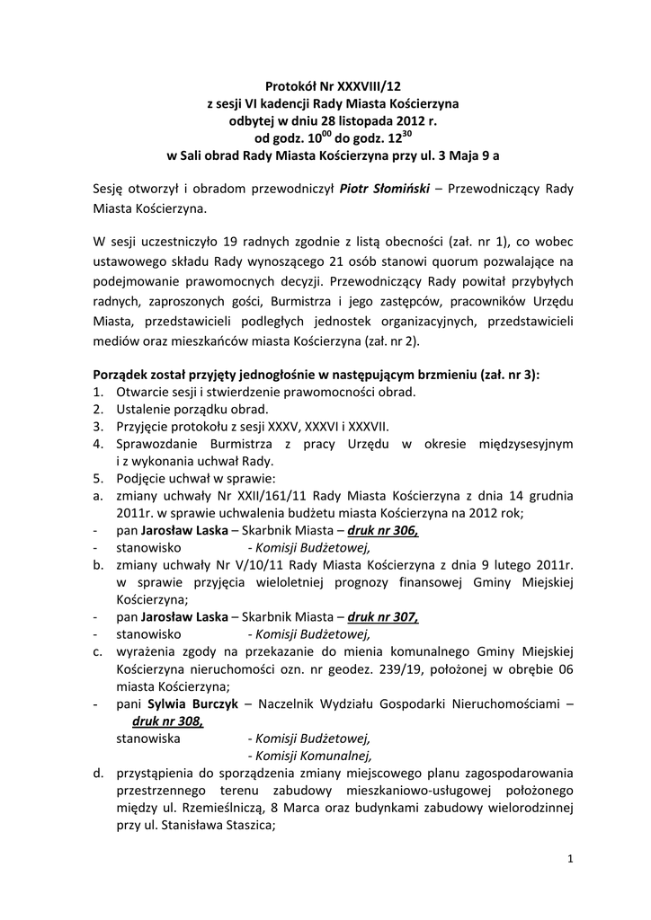 Protokół Nr XXXVIII/12 z sesji VI kadencji Rady Miasta Kościerzyna odbytej w dniu 28 listopada 2012 r. od godz. 1000 do godz. 1230 w Sali obrad Rady Miasta Kościerzyna przy ul. 3 Maja 9 a Sesję otworzył i obradom przewodniczył Piotr Słomiński – Przewodniczący Rady Miasta Kościerzyna. W sesji uczestniczyło 19 radnych zgodnie z listą obecności (zał. nr 1), co wobec ustawowego składu Rady wynoszącego 21 osób stanowi quorum pozwalające na podejmowanie prawomocnych decyzji. Przewodniczący Rady powitał przybyłych radnych, zaproszonych gości, Burmistrza i jego zastępców, pracowników Urzędu Miasta, przedstawicieli podległych jednostek organizacyjnych, przedstawicieli mediów oraz mieszkańców miasta Kościerzyna (zał. nr 2). Porządek został przyjęty jednogłośnie w następującym brzmieniu (zał. nr 3): 1. Otwarcie sesji i stwierdzenie prawomocności obrad. 2. Ustalenie porządku obrad. 3. Przyjęcie protokołu z sesji XXXV, XXXVI i XXXVII. 4. Sprawozdanie Burmistrza z pracy Urzędu w okresie międzysesyjnym i z wykonania uchwał Rady. 5. Podjęcie uchwał w sprawie: a. zmiany uchwały Nr XXII/161/11 Rady Miasta Kościerzyna z dnia 14 grudnia 2011r. w sprawie uchwalenia budżetu miasta Kościerzyna na 2012 rok; - pan Jarosław Laska – Skarbnik Miasta – druk nr 306, - stanowisko - Komisji Budżetowej, b. zmiany uchwały Nr V/10/11 Rady Miasta Kościerzyna z dnia 9 lutego 2011r. w sprawie przyjęcia wieloletniej prognozy finansowej Gminy Miejskiej Kościerzyna; - pan Jarosław Laska – Skarbnik Miasta – druk nr 307, - stanowisko - Komisji Budżetowej, c. wyrażenia zgody na przekazanie do mienia komunalnego Gminy Miejskiej Kościerzyna nieruchomości ozn. nr geodez. 239/19, położonej w obrębie 06 miasta Kościerzyna; - pani Sylwia Burczyk – Naczelnik Wydziału Gospodarki Nieruchomościami – druk nr 308, stanowiska - Komisji Budżetowej, - Komisji Komunalnej, d. przystąpienia do sporządzenia zmiany miejscowego planu zagospodarowania przestrzennego terenu zabudowy mieszkaniowo-usługowej położonego między ul. Rzemieślniczą, 8 Marca oraz budynkami zabudowy wielorodzinnej przy ul. Stanisława Staszica; 1 e. - f. g. h. i. 6. 7. 8. 9. 10. pani Sylwia Burczyk – Naczelnik Wydziału Gospodarki Nieruchomościami – druk nr 309, stanowisko - Komisji Komunalnej, wyrażenia zgody na sprzedaż niezabudowanych działek gruntu położonych przy ul. Stanisława Moniuszki, w obrębie geodezyjnym nr 06 na terenie miasta Kościerzyna; pani Sylwia Burczyk – Naczelnik Wydziału Gospodarki Nieruchomościami – druk nr 310, stanowiska - Komisji Budżetowej, - Komisji Komunalnej, przyjęcia regulaminu utrzymania czystości i porządku na terenie Gminy Miejskiej Kościerzyna; pan Bartosz Borkowski – Naczelnik Wydziału Infrastruktury i Środowiska – druk nr 311, stanowiska - Komisji Porządku Publicznego i Spraw Społecznych, - Komisji Komunalnej, uchylenia uchwały Nr XXVII/224/12 Rady Miasta Kościerzyna z dnia 25 kwietnia 2012 r. w sprawie zmiany uchwały Nr L/381/09 Rady Miasta Kościerzyna z dnia 25 listopada 2009 roku w sprawie przyjęcia regulaminów targowisk miejskich w Kościerzynie oraz zmiany uchwały Nr L/381/09 Rady Miasta Kościerzyna z dnia 25 listopada 2009 roku w sprawie przyjęcia regulaminów targowisk miejskich w Kościerzynie; pan Tomasz Smuczyński – Komendant Straży Miejskiej – druk nr 312, stanowiska - Komisji Porządku Publicznego i Spraw Społecznych, - Komisji Komunalnej, przyjęcia Regulaminu Targowiska Miejskiego „Mój Rynek” w Kościerzynie; pan Tomasz Smuczyński – Komendant Straży Miejskiej – druk nr 313, stanowiska - Komisji Porządku Publicznego i Spraw Społecznych, - Komisji Komunalnej, wyznaczenia dodatkowych przedstawicieli Gminy Miejskiej Kościerzyna do Zgromadzenia Związku Gmin Wierzyca; pan Zdzisław Czucha – Burmistrz Miasta – druk nr 314. Przygotowanie miasta do sezonu zimowego; pan Jan Dittrich – Dyrektor Centrum Kultury i Sportu. Informacja z wykonania zadań oświatowych za rok szkolmy 2011/2012 z uwzględnieniem Strategii Rozwoju Edukacji Miasta Kościerzyna na lata 2011 – 2020; pani Alicja Kirstein – Dyrektor Biura Obsługi Placówek Oświatowych. Informacja na temat podjętych działań w związku z inicjatywą Radnych Rady Miasta Kościerzyna dotyczącą prowadzenia rutynowych szczepień przeciw HPV; pani Alicja Kirstein – Dyrektor Biura Obsługi Placówek Oświatowych. Interpelacje i zapytania radnych. Wolne wnioski i informacje. 2 11. Zakończenie sesji. Piotr Słomiński – zapytał, czy są uwagi do protokołów z XXXV, XXXVI i XXXVII sesji. W związku z ich brakiem przystąpił do głosowania. 18 radnych głosowało za nikt się nie sprzeciwił nikt się nie wstrzymał Protokoły zostały przyjęte. Zdzisław Czucha – przedstawił sprawozdanie Burmistrza z pracy Urzędu w okresie międzysesyjnym i z wykonania uchwał Rady Miasta oraz prezentację multimedialną (zał. nr 4 i 5). Piotr Słomiński – otworzył dyskusję. Jerzy Jańczak – zapytał, czy w okresie międzysesyjnym zajmowano się sprawą, którą wielokrotnie zgłaszał na sesji, a mianowicie bezpiecznym dojściem dzieci z Wierzyska do szkół miejskich. Dodał, że według prognoz długoterminowych nadchodzi fala obfitych opadów śniegu, mróz, a jakie warunki w tamtym rejonie są wszyscy już wiedzą. Tomasz Dargacz – powiedział, że w lipcu tego roku dwukrotnie na ul. Klasztornej doszło do oberwania dużej skarpy a tam przechodzi codziennie kilkadziesiąt dzieci, dorosłych i trudno sobie wyobrazić co by się stało, gdyby część spadającej skarpy spadła na dziecko. Zapytał, czy w związku z tym nie czas zająć się drugą częścią ulicy Wejhera, zabezpieczyć skarpę, bo w dalszej perspektywie może dojść do jakiejś tragedii. Teresa Preis – zapytała, czy nie można na Wierzysku przy ul. Wejhera zrobić takiego umocowania jak jest na ul. Strzeleckiej przy wlocie do ul. Kopernika. Miesz