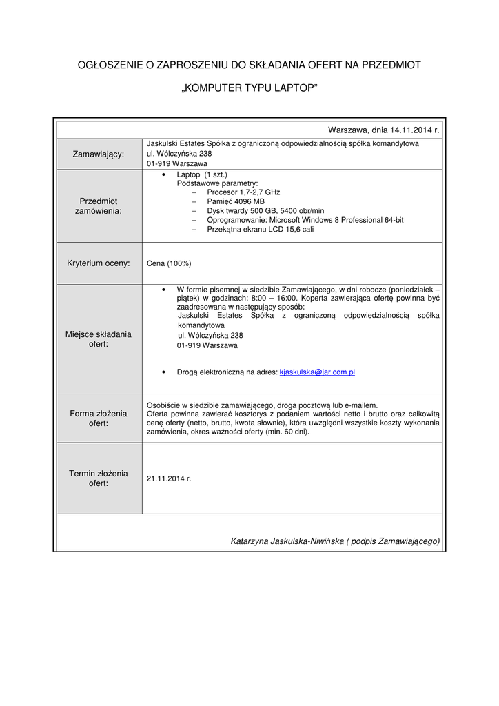 OGŁOSZENIE O ZAPROSZENIU DO SKŁADANIA OFERT NA PRZEDMIOT „KOMPUTER TYPU LAPTOP” Warszawa, dnia 14.11.2014 r. Zamawiający: Przedmiot zamówienia: Kryterium oceny: Jaskulski Estates Spółka z ograniczoną odpowiedzialnością spółka komandytowa ul. Wólczyńska 238 01-919 Warszawa • Laptop (1 szt.) Podstawowe parametry: − Procesor 1,7-2,7 GHz − Pamięć 4096 MB − Dysk twardy 500 GB, 5400 obr/min − Oprogramowanie: Microsoft Windows 8 Professional 64-bit − Przekątna ekranu LCD 15,6 cali Cena (100%) • W formie pisemnej w siedzibie Zamawiającego, w dni robocze (poniedziałek – piątek) w godzinach: 8:00 – 16:00. Koperta zawierająca ofertę powinna być zaadresowana w następujący sposób: Jaskulski Estates Spółka z ograniczoną odpowiedzialnością spółka komandytowa ul. Wólczyńska 238 01-919 Warszawa • Drogą elektroniczną na adres: [email protected] Miejsce składania ofert: Forma złożenia ofert: Osobiście w siedzibie zamawiającego, droga pocztową lub e-mailem. Oferta powinna zawierać kosztorys z podaniem wartości netto i brutto oraz całkowitą cenę oferty (netto, brutto, kwota słownie), która uwzględni wszystkie koszty wykonania zamówienia, okres ważności oferty (min. 60 dni). Termin złożenia ofert: 21.11.2014 r. Katarzyna Jaskulska-Niwińska ( podpis Zamawiającego)