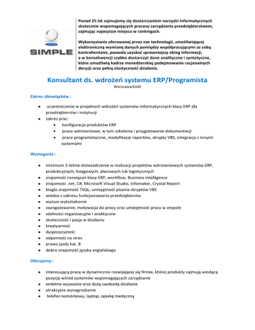 Ponad 25 lat zajmujemy się dostarczaniem narzędzi informatycznych skutecznie wspomagających procesy zarządzania przedsiębiorstwem, zajmując najwyższe miejsca w rankingach. Wykorzystanie oferowanej przez nas technologii, umożliwiającej elektroniczną wymianę danych pomiędzy współpracującymi ze sobą kontrahentami, pozwala uzyskad sprawniejszy obieg informacji, a w konsekwencji szybko dostarczyd dane analityczne i syntetyczne, które umożliwią kadrze menedżerskiej podejmowanie racjonalnych decyzji oraz pełną elastycznośd działania. Konsultant ds. wdrożeo systemu ERP/Programista Warszawa/Łódź Zakres obowiązków : ● ● uczestniczenie w projektach wdrożeo systemów informatycznych klasy ERP dla przedsiębiorstw i instytucji zakres prac:  konfiguracja produktów ERP  prace wdrożeniowe, w tym szkolenia i przygotowanie dokumentacji  prace programistyczne, modyfikacje raportów, skrypty VBS, integracja z innymi systemami Wymagania : ● ● ● ● ● ● ● ● ● ● ● ● ● ● minimum 2-letnie doświadczenie w realizacji projektów wdrożeniowych systemów ERP, produkcyjnych, księgowych, płacowych lub logistycznych znajomośd rozwiązao klasy ERP, workflow, Business Intelligence znajomośd .net, C#, Microsoft Visual Studio, Infomaker, Crystal Report biegła znajomośd TSQL, umiejętnośd pisania skryptów VBS wiedza z zakresu funkcjonowania przedsiębiorstw wyższe wykształcenie zaangażowanie, motywacja do pracy oraz umiejętnośd pracy w zespole zdolności organizacyjne i analityczne skutecznośd i pasja w działaniu kreatywnośd dyspozycyjnośd odpornośd na stres prawo jazdy kat. B dobra znajomośd języka angielskiego Oferujemy : ● ● ● ● interesującą pracę w dynamicznie rozwijającej się firmie, której produkty zajmują wiodącą pozycję wśród systemów wspomagających zarządzanie ambitne wyzwania oraz dużą swobodę działania atrakcyjne wynagrodzenie telefon komórkowy, laptop, opiekę medyczną Zainteresowane osoby, które spełniają powyższe wymagania, prosimy o nadsyłanie oznaczonego nazwiskiem CV w języku polskim, z podaniem nazwy stanowiska w nagłówku wiadomości, na adres e-mail: [email protected] Prosimy o dopisanie następującej klauzuli: "Wyrażam zgodę na przetwarzanie moich danych osobowych zawartych w ofercie pracy dla potrzeb procesu rekrutacji zgodnie z ustawą z dnia 27.08.1997r. Dz. U. z 2002 r., Nr 101, poz. 923 ze zm.". Informujemy, że skontaktujemy się jedynie z wybranymi kandydatami.