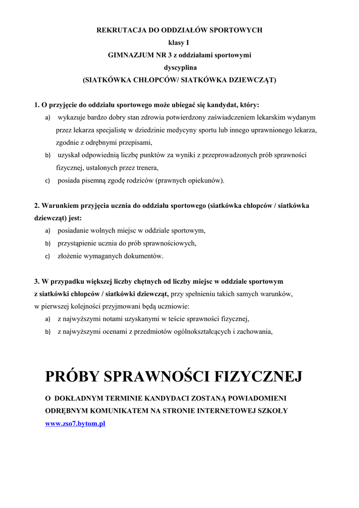 REKRUTACJA DO ODDZIAŁÓW SPORTOWYCH klasy I GIMNAZJUM NR 3 z oddziałami sportowymi dyscyplina (SIATKÓWKA CHŁOPCÓW/ SIATKÓWKA DZIEWCZĄT) 1. O przyjęcie do oddziału sportowego może ubiegać się kandydat, który: a) wykazuje bardzo dobry stan zdrowia potwierdzony zaświadczeniem lekarskim wydanym przez lekarza specjalistę w dziedzinie medycyny sportu lub innego uprawnionego lekarza, zgodnie z odrębnymi przepisami, b) uzyskał odpowiednią liczbę punktów za wyniki z przeprowadzonych prób sprawności fizycznej, ustalonych przez trenera, c) posiada pisemną zgodę rodziców (prawnych opiekunów). 2. Warunkiem przyjęcia ucznia do oddziału sportowego (siatkówka chłopców / siatkówka dziewcząt) jest: a) posiadanie wolnych miejsc w oddziale sportowym, b) przystąpienie ucznia do prób sprawnościowych, c) złożenie wymaganych dokumentów. 3. W przypadku większej liczby chętnych od liczby miejsc w oddziale sportowym z siatkówki chłopców / siatkówki dziewcząt, przy spełnieniu takich samych warunków, w pierwszej kolejności przyjmowani będą uczniowie: a) z najwyższymi notami uzyskanymi w teście sprawności fizycznej, b) z najwyższymi ocenami z przedmiotów ogólnokształcących i zachowania, PRÓBY SPRAWNOŚCI FIZYCZNEJ O DOKŁADNYM TERMINIE KANDYDACI ZOSTANĄ POWIADOMIENI ODRĘBNYM KOMUNIKATEM NA STRONIE INTERNETOWEJ SZKOŁY www.zso7.bytom.pl
