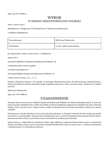 Sygn. akt VII U 888/15 WYROK W IMIENIU RZECZYPOSPOLITEJ POLSKIEJ Dnia 11 marca 2016 r. Sąd Rejonowy w Bydgoszczy VII Wydział Pracy i Ubezpieczeń Społecznych w składzie następującym: Przewodniczący: SSR Iwona Wiśniewska Protokolant: st. sekr. sądowy Beata Górska po rozpoznaniu w dniu 11 marca 2016 r. w Bydgoszczy sprawy M. P. przeciwko Zakładowi Ubezpieczeń Społecznych Oddział w B. o odszkodowanie z tytułu wypadku na skutek odwołania M. P. od decyzji Zakładu Ubezpieczeń Społecznych Oddział w B. z dnia 5 czerwca 2015 r. nr (...)- (...) zmienia zaskarżoną decyzję w ten sposób, że przyznaje ubezpieczonej prawo do jednorazowego odszkodowania z tytułu uszczerbku na zdrowiu spowodowanego wypadkiem przy pracy z dnia 1 stycznia 2015r. wysokości 10 % (jeden procent). SSR Iwona Wiśniewska Sygn. akt. VII U 888/15 UZASADNIENIE Decyzją z dnia 5 czerwca 2015 r. Zakład Ubezpieczeń Społecznych Oddział w B. odmówił ubezpieczonej M. P. prawa do jednorazowego odszkodowania z tytułu uszczerbku na zdrowiu będącego następstwem wypadku przy pracy, któremu uległa w dniu 1 stycznia 2015 r. Organ rentowy ustalił, że ubezpieczona nie doznała uszczerbku na zdrowiu na skutek wypadku. Ubezpieczona wniosła odwołanie od powyższej decyzji podnosząc, że Komisja Lekarska ZUS źle oceniła uszczerbek procentowy w jej przypadku. Doznany przez ubezpieczoną uraz w postaci dwumiejscowego złamania dwóch żeber z przemieszczeniem stanowi z pewnością wyższy uszczerbek niż ustalony przez Komisję Organ rentowy w odpowiedzi na odwołanie wniósł o jego oddalenie i podtrzymał stanowisko zawarte w zaskarżonej decyzji, powołując się przy tym na orzeczenie komisji lekarskiej ZUS z dnia 29 maja 2015 r., w którym stwierdzono u ubezpieczonej 0 % uszczerbku na zdrowiu. Sąd ustalił, co następuje: Ubezpieczona M. P. w dniu 1 stycznia 2015 r. będąc zatrudnioną w Szpitalu (...) im. dr L. B. w I. jako pielęgniarka, uległa wypadkowi przy pracy. okoliczność bezsporna Tego dnia ok. godz. 12.00 otrzymała od lekarza polecenie, aby przygotować pacjentkę do badania EKG. Pacjentka była z podejrzeniem udaru mózgu, bez kontaktu. Ubezpieczona ułożyła pacjentkę na wznak i opuściła segment wezgłowia łóżka na pozycję płaską. Po wykonaniu tego pozycja pacjentki wymagała poprawy i przesunięcia w kierunku przedniej części wózka. Stanęła w okolicach głowy pacjentki i chwyciła obiema rękami prześcieradło, na którym leżała pacjentka, prawą nogą zaparła się o podstawę wózka i rozpoczęła przesuwanie chorej. Czynność tę wykonywała w pozycji lekko pochylonej, prawy bok ciała znajdował się przy metalowej krawędzi wezgłowia. Podczas przesuwania pacjentki, nagły nieskoordynowany ruch ciała chorej spowodował naciśnięcie blokady wezgłowia, która w postaci dźwigni umieszczona jest pod płytą wózka. Wskutek tego nastąpił minimalny skok wezgłowia do góry. Zewnętrzna krawędź uderzyła poszkodowaną w prawy bok klatki piersiowej, która była jednocześnie obciążona wysiłkiem użytym do przesunięcia ciała pacjentki. Ubezpieczona poczuła silny ból w prawym boku klatki piersiowej. dowód: protokół powypadkowy k.3-5 akt ZUS Pracodawca uznał zdarzenie za wypadek przy pracy. dowód: protokół powypadkowy k.3-5 akt ZUS Na skutek opisanego powyższej wypadku przy pracy ubezpieczona doznała złamania dwóch żeber: II i IV po stronie prawej klatki piersiowej, w tym żebra drugiego w dwóch miejscach. Leczona była przez 3 miesiące. Obecnie występuje zniekształcenie żeber po stronie prawej poniżej łopatki. W wyniku wypadku ubezpieczona doznała trwałego uszczerbku na zdrowiu w wysokości 10 %. dowód: opinia biegłego sądowego k. 17-18 akt sprawy Sąd zważył, co następuje: Przedstawiony stan faktyczny Sąd ustalił na podstawie powołanych wyżej dokumentów, których autentyczności strony nie kwestionowały, a także w oparciu o opinię biegłego sądowego którą Sąd podzielił w pełni. Zważyć należy, że zgodnie z art. 3 ustawy z dnia 30 października 2002 r. o ubezpieczeniu społecznym z tytułu wypadków przy pracy i chorób zawodowych (tekst jedn. Dz. U. z 2009 r. Nr 167 poz. 1322 ze zm.; dalej ustawa wypadkowa) za wypadek przy pracy uważa się nagłe zdarzenie wywołane przyczyną zewnętrzną powodujące uraz lub śmierć, które nastąpiło w związku z pracą podczas lub w związku z wykonywaniem przez pracownika zwykłych czynności lub poleceń przełożonych; podczas lub w związku z wykonywaniem przez pracownika czynności na rzecz pracodawcy, nawet bez polecenia albo w czasie pozostawania pracownika w dyspozycji pracodawcy w drodze między siedzibą pracodawcy a miejscem wykonywania obowiązku wynikającego ze stosunku pracy. Okoliczności wypadku i w konsekwencji kwestia uznania zdarzenia za wypadek przy pracy, w myśl powołanego wyżej przepisu, nie były między stronami sporne. Spornym okazało się natomiast ustalenie procentowego stałego lub długotrwałego uszczerbku na zdrowiu ubezpieczonej wskutek doznanego urazu. Ubezpieczonemu, który wskutek wypadku przy pracy lub choroby zawodowej doznał stałego lub długotrwałego uszczerbku na zdrowiu, przysługuje jednorazowe odszkodowanie (art. 11 ust. 1 ustawy wypadkowej). Za stały uszczerbek na zdrowiu uważa się takie naruszenie sprawności organizmu, które powoduje upośledzenie czynności organizmu nierokujące poprawy (ust. 2). Natomiast za długotrwały uszczerbek na zdrowiu uważa się takie naruszenie sprawności organizmu, które powoduje upośledzenie czynności organizmu na okres przekraczający 6 miesięcy, mogące ulec poprawie (ust. 3). Oceny stopnia uszczerbku na zdrowiu oraz jego związku z wypadkiem przy pracy lub chorobą zawodową dokonuje się po zakończeniu leczenia i rehabilitacji (ust. 4). Stały lub długotrwały uszczerbek na zdrowiu oraz jego związek z wypadkiem przy pracy lub chorobą zawodową ustala lekarz orzecznik 