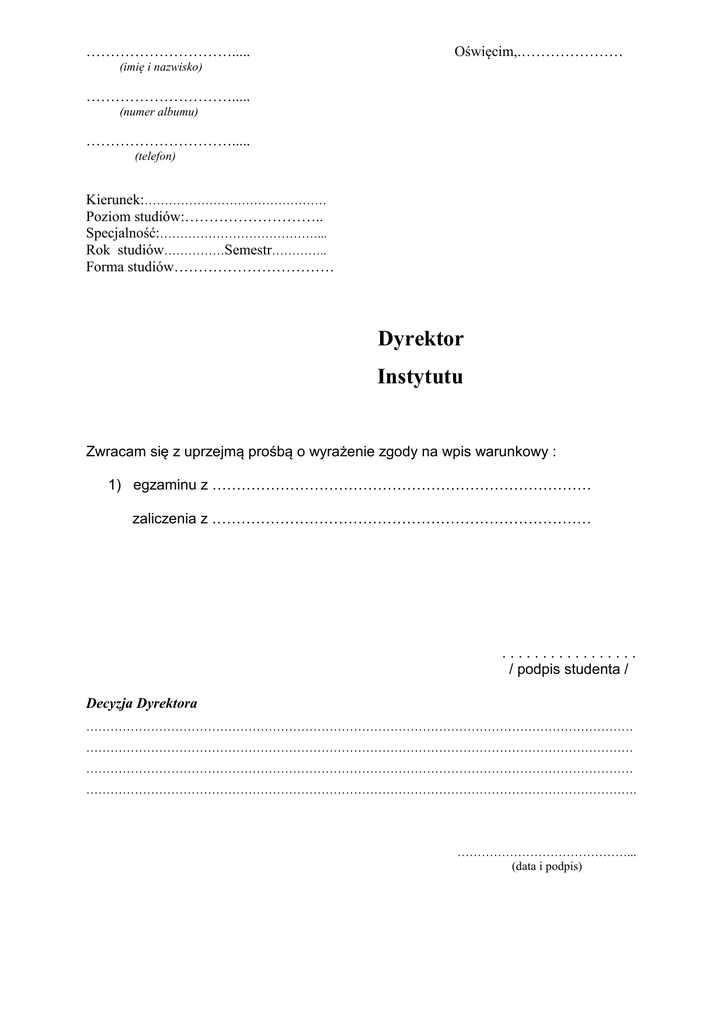 …………………………..... Oświęcim,.………………… (imię i nazwisko) …………………………..... (numer albumu) …………………………..... (telefon) Kierunek:……………………………………… Poziom studiów:……………………….. Specjalność:…………………………………... Rok studiów……………Semestr………….. Forma studiów…………………………… Dyrektor Instytutu Zwracam się z uprzejmą prośbą o wyrażenie zgody na wpis warunkowy : 1) egzaminu z …………………………………………………………………… zaliczenia z …………………………………………………………………… ................. / podpis studenta / Decyzja Dyrektora ……………………………………………………………………………………………………………………… ……………………………………………………………………………………………………………………… ……………………………………………………………………………………………………………………… ………………………………………………………………………………………………………………………. ……………………………………... (data i podpis)