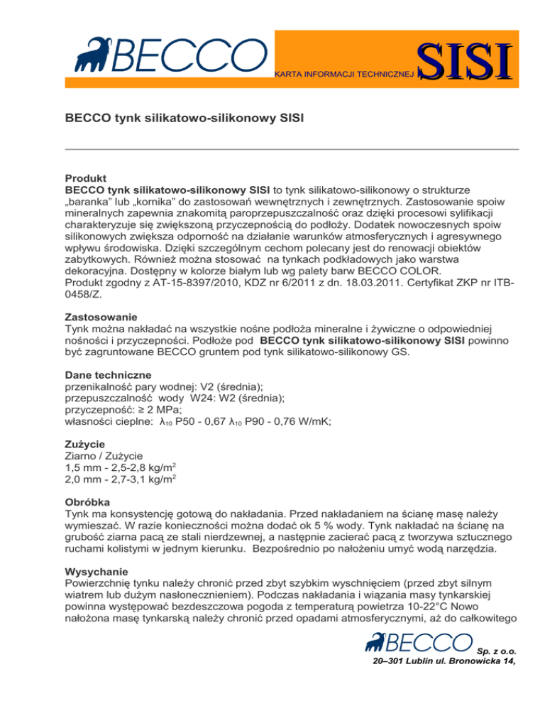 KARTA INFORMACJI TECHNICZNEJ SISI BECCO tynk silikatowo-silikonowy SISI Produkt BECCO tynk silikatowo-silikonowy SISI to tynk silikatowo-silikonowy o strukturze „baranka” lub „kornika” do zastosowań wewnętrznych i zewnętrznych. Zastosowanie spoiw mineralnych zapewnia znakomitą paroprzepuszczalność oraz dzięki procesowi sylifikacji charakteryzuje się zwiększoną przyczepnością do podłoży. Dodatek nowoczesnych spoiw silikonowych zwiększa odporność na działanie warunków atmosferycznych i agresywnego wpływu środowiska. Dzięki szczególnym cechom polecany jest do renowacji obiektów zabytkowych. Również można stosować na tynkach podkładowych jako warstwa dekoracyjna. Dostępny w kolorze białym lub wg palety barw BECCO COLOR. Produkt zgodny z AT-15-8397/2010, KDZ nr 6/2011 z dn. 18.03.2011. Certyfikat ZKP nr ITB0458/Z. Zastosowanie Tynk można nakładać na wszystkie nośne podłoża mineralne i żywiczne o odpowiedniej nośności i przyczepności. Podłoże pod BECCO tynk silikatowo-silikonowy SISI powinno być zagruntowane BECCO gruntem pod tynk silikatowo-silikonowy GS. Dane techniczne przenikalność pary wodnej: V2 (średnia); przepuszczalność wody W24: W2 (średnia); przyczepność: ≥ 2 MPa; własności cieplne: λ10 P50 - 0,67 λ10 P90 - 0,76 W/mK; Zużycie Ziarno / Zużycie 1,5 mm - 2,5-2,8 kg/m2 2,0 mm - 2,7-3,1 kg/m2 Obróbka Tynk ma konsystencję gotową do nakładania. Przed nakładaniem na ścianę masę należy wymieszać. W razie konieczności można dodać ok 5 % wody. Tynk nakładać na ścianę na grubość ziarna pacą ze stali nierdzewnej, a następnie zacierać pacą z tworzywa sztucznego ruchami kolistymi w jednym kierunku. Bezpośrednio po nałożeniu umyć wodą narzędzia. Wysychanie Powierzchnię tynku należy chronić przed zbyt szybkim wyschnięciem (przed zbyt silnym wiatrem lub dużym nasłonecznieniem). Podczas nakładania i wiązania masy tynkarskiej powinna występować bezdeszczowa pogoda z temperaturą powietrza 10-22°C Nowo nałożona masę tynkarską należy chronić przed opadami atmosferycznymi, aż do całkowitego Sp. z o.o. 20–301 Lublin ul. Bronowicka 14, KARTA INFORMACJI TECHNICZNEJ SISI utwardzenia. Przy temperaturze ok 20°C i wilgotności powietrza ok 65% czas całkowitego wysychania wynosi ok 24 godzin. Większa wilgotność i niższa temperatura wydłużają czas schnięcia. Pomieszczenia zamknięte po otynkowaniu należy wietrzyć aż do zaniku charakterystycznego zapachu. Uwaga! W przypadku barwienia tynku na kolor z palety BECCO COLOR należy zwrócić uwagę na zgodność barwy z wzorcem oraz zgodność barwy we wszystkich opakowaniach. Temperatura stosowania +10 do +22°C. Opakowanie BECCO tynk silikatowo-silikonowy SISI dostępny jest w jednorazowych plastikowych opakowaniach o pojemności 25 kg. Opakowanie po dokładnym opróżnieniu można traktować jak odpady gospodarcze. Składowanie Należy chronić przed wilgocią i przechowywać w suchym miejscu na paletach w oryginalnych opakowaniach. Otwarte opakowania należy szczelnie zamknąć. Czas składowania: 24 miesięcy – zalecane zużycie w ciągu 12 miesięcy. Nadzór Oprócz bieżących kontroli zewnętrznych zaprawa jest kontrolowana przez wyspecjalizowane laboratorium. Stan: 01/2011 Podane wyżej informacje zostały zestawione na podstawia doświadczeń, zebranych w praktyce i uzyskanych w wyniku starannych prób przeprowadzonych zgodnie z najlepszą wiedzą przez specjalistyczne Laboratorium Rozwojowo – Badawcze. Mają one służyć użytkownikowi jako źródło informacji i doradztwa. Jednak ze względu na różnorodność podłoży i rozmaitość zakresów stosowania, a także sposób wykonania, na które nie mamy wpływu, mają one charakter informacyjny i nie mogą stanowić podstawy do roszczeń prawnych. Każdemu użytkownikowi radzimy wykonanie własnych prób przydatności naszego produktu do własnych celów w znanych mu warunkach. Informacja ta traci ważność z chwilą ukazania się nowej. Sp. z o.o. 20–301 Lublin ul. Bronowicka 14,