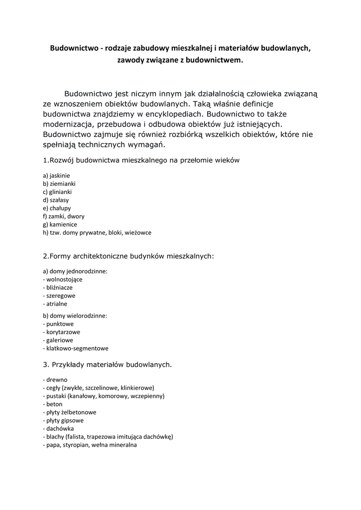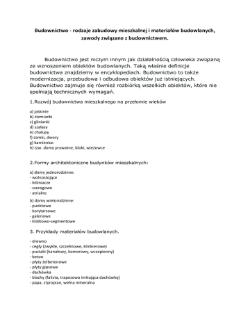 Budownictwo - rodzaje zabudowy mieszkalnej i materiałów budowlanych, zawody związane z budownictwem. Budownictwo jest niczym innym jak działalnością człowieka związaną ze wznoszeniem obiektów budowlanych. Taką właśnie definicje budownictwa znajdziemy w encyklopediach. Budownictwo to także modernizacja, przebudowa i odbudowa obiektów już istniejących. Budownictwo zajmuje się również rozbiórką wszelkich obiektów, które nie spełniają technicznych wymagań. 1.Rozwój budownictwa mieszkalnego na przełomie wieków a) jaskinie b) ziemianki c) glinianki d) szałasy e) chałupy f) zamki, dwory g) kamienice h) tzw. domy prywatne, bloki, wieżowce 2.Formy architektoniczne budynków mieszkalnych: a) domy jednorodzinne: - wolnostojące - bliźniacze - szeregowe - atrialne b) domy wielorodzinne: - punktowe - korytarzowe - galeriowe - klatkowo-segmentowe 3. Przykłady materiałów budowlanych. - drewno - cegły (zwykłe, szczelinowe, klinkierowe) - pustaki (kanałowy, komorowy, wczepienny) - beton - płyty żelbetonowe - płyty gipsowe - dachówka - blachy (falista, trapezowa imitująca dachówkę) - papa, styropian, wełna mineralna W budownictwie pracują ludzie z ponad dwudziestu zawodów. Zawody związane z budownictwem to m.in.: -architekt - współtwórca kultury przez projektowanie architektoniczne obiektów budowlanych, ich przestrzennego otoczenia oraz ich realizację, nadzoruje procesem ich powstawania - projektant - osoba zajmująca się projektowaniem obiektów budowlanych - inżynier.- planuje, budowę i eksploatację obiektów budowlanych. -konstruktor- osoba, najczęściej inżynier, zajmująca się projektowaniem budynków instalacji przemysłowych lub innych obiektów inżynierskich, jak również sporządzaniem modeli konstrukcji i ich badaniem. Jest to człowiek wykonujący wszelką dokumentację rysunkową -geodeta - nazwa zawodu, osoba zajmująca się geodezją.- pomiarami. -urbanista - urbanista (architekt miast) -murarz – to zawód polegający na wykonywanie prac związanych z wznoszeniem budowli kamiennych lub ceglanych, gdzie czynnikiem wiążącym te materiały jest zaprawa murarska. -malarz – wykonuje prace malarskie -tynkarz – wykonuje zaprawy tynkarskie z różnych materiałów -cieśla zawód związany z obróbką drewna. Polega na wykonywaniu elementów konstrukcji, części wyposażenia oraz detali z drewna. W potocznym rozumieniu cieśla to (stolarz budowlany) -dekarz - zajmujący się pokrywaniem i naprawianiem dachów materiałami dekarskimi tj.: dachówkami, blachodachówkamiitp. -instalator – instaluje urządzenia -dekorator wnętrz – projektuje wygląd poszczególnych wnętrz -elektryk - zawód związany z montażem i naprawą instalacji elektrycznych oraz konserwacyjnonaprawczych instalacji zalicznikowych. -hydraulik - zawód związany z montażem, instalacją i naprawą instalacji wodociągowej, kanalizacyjnej i centralnego ogrzewania