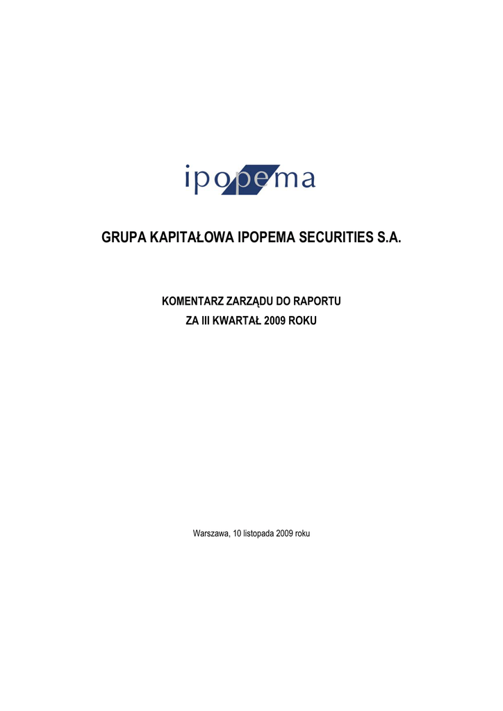 GRUPA KAPITAŁOWA IPOPEMA SECURITIES S.A. KOMENTARZ ZARZĄDU DO RAPORTU ZA III KWARTAŁ 2009 ROKU Warszawa, 10 listopada 2009 roku Komentarz Zarządu do raportu za trzeci kwartał 2009 roku Grupa Kapitałowa IPOPEMA Securities S.A. SPIS TREŚCI CZĘŚĆ I................................................................................................................................................................................. 2 1. Wynik finansowy .......................................................................................................................................................... 2 2. Istotne zdarzenia i czynniki, które miały wpływ na osiągnięte wyniki finansowe ......................................................... 4 3. Czynniki mogące mieć wpływ na wyniki w IV kwartale 2009 roku ............................................................................... 5 4. Realizacja prognoz ...................................................................................................................................................... 6 CZĘŚĆ II................................................................................................................................................................................ 7 1. Struktura organizacyjna grupy kapitałowej IPOPEMA Securities S.A. ........................................................................ 7 2. Zmiany w strukturze organizacyjnej Grupy Kapitałowej IPOPEMA Securities S.A...................................................... 7 3. Akcjonariat IPOPEMA Securities S.A. ......................................................................................................................... 8 4. Zmiana liczby posiadanych akcji przez osoby zarządzające lub nadzorujące............................................................. 8 5. Informacje dotyczącą emisji, wykupu i spłaty nieudziałowych i kapitałowych papierów wartościowych...................... 9 6. Udzielone poręczenia .................................................................................................................................................. 9 7. Istotne zdarzenia w III kwartale 2009 roku................................................................................................................... 9 8. Postępowania sądowe............................................................................................................................................... 10 9. Transakcje z podmiotami powiązanymi ..................................................................................................................... 10 10. Istotne zdarzenia po dacie sporządzenia sprawozdania finansowego ...................................................................... 10 1 Komentarz Zarządu do raportu za trzeci kwartał 2009 roku Grupa Kapitałowa IPOPEMA Securities S.A. CZĘŚĆ I 1. Wynik finansowy Przychody W III kwartale 2009 roku Grupa odnotowała istotny wzrost przychodów w porównaniu z I i II kwartałem 2009 roku. Przychody Grupy w III kwartale wyniosły 18.582 tys. zł i stanowiły 75% wartości przychodów osiągniętych łącznie w okresie dwóch pierwszych kwartałów 2009 roku (24.927 tys. zł). Porównując III kwartał 2009 roku do III kwartału 2008 roku Grupa odnotowała 49% wzrost przychodów (12.446 tys. zł w III kwartale 2008 roku). Istotne znaczenie w poprawie wysokości przychodów miały następujące czynniki: (i) poprawa w obszarze usług bankowości inwestycyjnej – przychody z tytułu usług bankowości inwestycyjnej w III kwartale 2009 roku wyniosły 3.607 tys. zł (19% łącznych przychodów Grupy w III kwartale), wobec 408 tys. zł w III kwartale roku 2008. Dysproporcja ta jest wynikiem nagłego pogorszenia sytuacji rynkowej mającej miejsce w II połowie ubiegłego roku, co spowodowała wstrzymanie transakcji publicznych, których realizacja zaplanowana była w tym okresie. W konsekwencji zaistniałej sytuacji większy nacisk położono na dywersyfikację usług, czego efektem jest rozpoczęcie oferowania usług z obszaru restrukturyzacji finansowej przedsiębiorstw, co istotnie wpłynęło na przychody okresu objętego sprawozdaniem. (ii) rozwój działalności w segmencie funduszy inwestycyjnych – w III kwartale 2009 roku wystąpiła wysoka (ponad 1,5krotna) w porównaniu z III kwartałem 2008 r. dynamika przychodów z tytułu obsługi funduszy inwestycyjnych – z poziomu 844 tys. zł w III kwartale 2008 roku do 2.150 tys. zł (12% łącznych przychodów Grupy) w III kwartale roku bieżącego. Taka tendencja jest następstwem wzrostu liczby zarządzanych funduszy, a także zgromadzonych w nich aktywów. W szczególności, na dzień 30 września br. IPOPEMA Towarzystwo Funduszy Inwestycyjnych („IPOPEMA TFI”) obsługiwało 42 fundusze inwestycyjne, w których zgromadzone były aktywa o łącznej wartości 1,9 mld zł, podczas gdy na koniec roku 2008 wartość aktywów wynosiła ok. 1 mld zł. Co istotne, na powyższy wzrost miały wpływ nie tylko fundusze dedykowane indywidualnym inwestorom, ale również fundusze aktywnie zarządzane takie jak ALIOR SFIO i TOTAL FIZ. W efekcie nastąpił wzrost przychodów powtarzalnych z tytułu opłat za zarządzanie funduszami, które wyniosły 1,8 mln zł w III kwartale 2009 r. wobec 623 tys. zł w III kwartale 2008 roku. Natomiast wraz z osiąganiem dojrzałości biznesowej maleje znaczenie opłat typu „upfront” w przychodach Towarzystwa, niemniej w III kwartale 2009 roku przychody z tytułu tworzenia funduszy wyniosły 170 tys. zł. Przychody osiągnięte przez TFI w III kwartale 2009 roku stanowią 74% przychodów za kwartał I i II 2009 roku łącznie. (iii) rozpoczęcie działalności przez spółkę IPOPEMA Business Consulting sp. z o.o. („IBC”) – spółka rozpoczęła działalność operacyjną od stycznia 2009 roku i w III kwartale osiągnęła 2.330 tys. zł przychodów, co stanowi 13% łącznych przychodó
