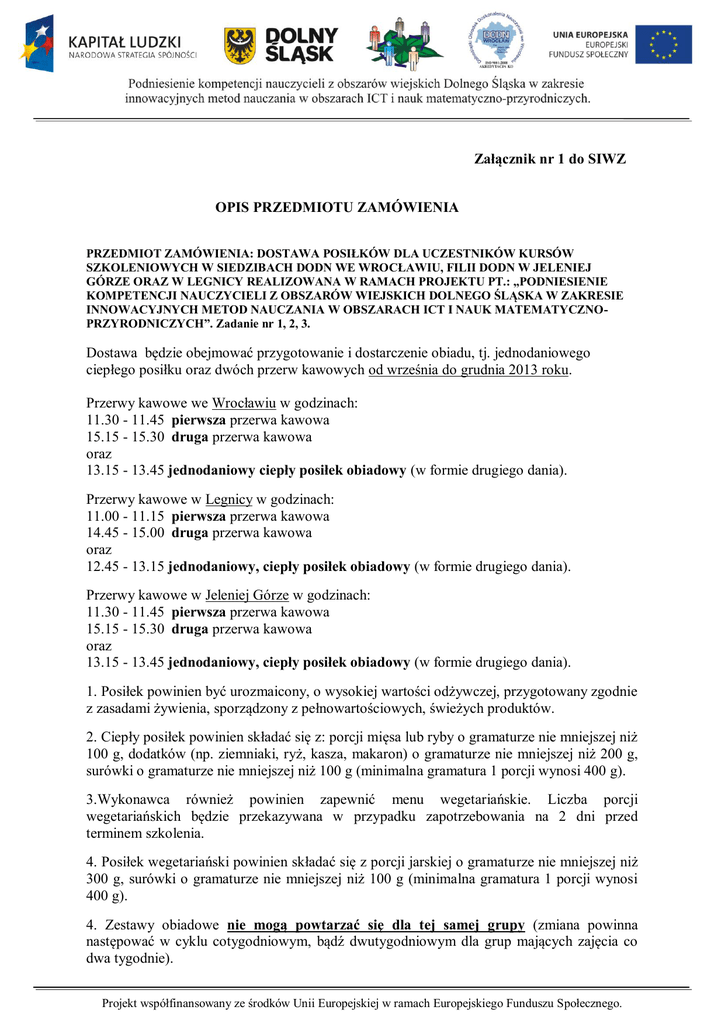 Załącznik nr 1 do SIWZ OPIS PRZEDMIOTU ZAMÓWIENIA PRZEDMIOT ZAMÓWIENIA: DOSTAWA POSIŁKÓW DLA UCZESTNIKÓW KURSÓW SZKOLENIOWYCH W SIEDZIBACH DODN WE WROCŁAWIU, FILII DODN W JELENIEJ GÓRZE ORAZ W LEGNICY REALIZOWANA W RAMACH PROJEKTU PT.: „PODNIESIENIE KOMPETENCJI NAUCZYCIELI Z OBSZARÓW WIEJSKICH DOLNEGO ŚLĄSKA W ZAKRESIE INNOWACYJNYCH METOD NAUCZANIA W OBSZARACH ICT I NAUK MATEMATYCZNOPRZYRODNICZYCH”. Zadanie nr 1, 2, 3. Dostawa będzie obejmować przygotowanie i dostarczenie obiadu, tj. jednodaniowego ciepłego posiłku oraz dwóch przerw kawowych od września do grudnia 2013 roku. Przerwy kawowe we Wrocławiu w godzinach: 11.30 - 11.45 pierwsza przerwa kawowa 15.15 - 15.30 druga przerwa kawowa oraz 13.15 - 13.45 jednodaniowy ciepły posiłek obiadowy (w formie drugiego dania). Przerwy kawowe w Legnicy w godzinach: 11.00 - 11.15 pierwsza przerwa kawowa 14.45 - 15.00 druga przerwa kawowa oraz 12.45 - 13.15 jednodaniowy, ciepły posiłek obiadowy (w formie drugiego dania). Przerwy kawowe w Jeleniej Górze w godzinach: 11.30 - 11.45 pierwsza przerwa kawowa 15.15 - 15.30 druga przerwa kawowa oraz 13.15 - 13.45 jednodaniowy, ciepły posiłek obiadowy (w formie drugiego dania). 1. Posiłek powinien być urozmaicony, o wysokiej wartości odżywczej, przygotowany zgodnie z zasadami żywienia, sporządzony z pełnowartościowych, świeżych produktów. 2. Ciepły posiłek powinien składać się z: porcji mięsa lub ryby o gramaturze nie mniejszej niż 100 g, dodatków (np. ziemniaki, ryż, kasza, makaron) o gramaturze nie mniejszej niż 200 g, surówki o gramaturze nie mniejszej niż 100 g (minimalna gramatura 1 porcji wynosi 400 g). 3.Wykonawca również powinien zapewnić menu wegetariańskie. Liczba porcji wegetariańskich będzie przekazywana w przypadku zapotrzebowania na 2 dni przed terminem szkolenia. 4. Posiłek wegetariański powinien składać się z porcji jarskiej o gramaturze nie mniejszej niż 300 g, surówki o gramaturze nie mniejszej niż 100 g (minimalna gramatura 1 porcji wynosi 400 g). 4. Zestawy obiadowe nie mogą powtarzać się dla tej samej grupy (zmiana powinna następować w cyklu cotygodniowym, bądź dwutygodniowym dla grup mających zajęcia co dwa tygodnie). Projekt współfinansowany ze środków Unii Europejskiej w ramach Europejskiego Funduszu Społecznego. 5. Minimalny zakres poczęstunku podczas przerw kawowych: kawa rozpuszczalna i mielona – b/o (wrzątek dozowany z warnika / zaparzacza), herbata ekspresowa typu „Lipton” (min. 3 rodzaje w równych porcjach: czarna, zielona, owocowa) – 5 saszetek/osoba, cukier, mix ciastek kruchych 50 g/os., mleko naturalne - b/o 6. Posiłki będą dostarczane wraz z serwetkami i kompletem jednorazowych sztućców w jednorazowych opakowaniach gwarantujących utrzymanie odpowiedniej temperatury oraz jakości przewożonych potraw. 7. W ramach zamówienia Wykonawca przygotuje i dostarczy posiłki o wyznaczonych godzinach do miejsc określonych w opisach poszczególnych zadań. 8. Zamawiający zastrzega sobie prawo określenia na 2 dni przed terminem szkolenia dokładnej liczby uczestników kursu danej grupy z możliwością zwiększenia lub zmniejszenia o maksymalnie 4 osoby. 9. Zamawiający rezerwuje sobie prawo skontrolowania jakości posiłków poprzez zamówienie raz w miesiącu jednej, dodatkowej porcji obiadowej. 10. Zamawiający zastrzega sobie prawo do zmiany terminów realizacji kursów w terminach podstawowych w przypadku trudności realizacji szkoleń. O zmianie terminów Zamawiający zawiadomi Wykonawcę przynajmniej 1 tydzień przed wyznaczonym podstawowym terminem rozpoczęcia zajęć dla poszczególnych grup. 11. Za wykonaną usługę w miesiącu grudniu Wykonawca dostarczy Zamawiającemu prawidłowo wystawioną fakturę nie później niż do 18 grudnia 2013 r. Wnioskodawca winien dołączyć do oferty 3 przykładowe menu na trzy kolejne tygodnie (jedno menu na jeden tydzień) wraz z informacją dotyczącą średniej gramatury oferowanych posiłków. Harmonogram zajęć ZADANIE NR 1 DODN we Wrocławiu, ul. Komuny Paryskiej 19a Łączna liczba posiłków – 1 088 Zadanie 1. Harmonogram dostawy we Wrocławiu w 2013 r. Lp. 1 Liczba zjazdów/dzień tygodnia dla poszczególnych grup 6 / poniedziałek Termin szkoleń 23.09.2013 r. 07.10.2013 r. 21.10.2013 r. 04.11.2013 r. 18.11.2013 r. 02.12.2013 r. Numer grupy G 25-60W Liczba osób w grupie 16 (+/- 20%) Projekt współfinansowany ze środków Unii Europejskiej w ramach Europejskiego Funduszu Społecznego. 2 10 / wtorek 3 10 / środa 4 10 / czwartek 5 6 / piątek 6 6 / piątek 7 10 / sobota 17.09.2013 r. 01.10.2013 r. 08.10.2013 r. 15.10.2013 r. 22.10.2013 r. 29.10.2013 r. 05.11.2013 r. 19.11.2013 r. 26.11.2013 r. 03.12.2013 r. 25.09.2013 r. 02.10.2013 r. 09.10.2013 r. 16.10.2013 r. 23.10.2013 r. 30.10.2013 r. 06.11.2013 r. 20.11.2013 r. 27.11.2013 r. 04.12.2013 r. 26.09.2013 r. 10.10.2013 r. 17.10.2013 r. 24.10.2013 r. 07.11.2013 r. 14.11.2013 r. 21.11.2013 r. 28.11.2013 r. 05.12.2013 r. 12.12.2013 r. 20.09.2013 r. 27.09.2013 r. 04.10.2013 r. 11.10.2013 r. 18.10.2013 r. 25.10.2013 r. 11.10.2013 r. 25.10.2013 r. 15.11.2013 r. 22.11.2013 r. 06.12.2013 r. 13.12.2013 r. 21.09.2013 r. 28.09.2013 r. 05.10.2013 r. 12.10.2013 r. 19.10.2013 r. 26.10.2013 r. 16.11.2013 r. 23.11.2013 r. 30.11.2013 r. 07.12.2013 r. G07-100W 20 (+/- 20%) G 09-100W 20 (+/- 20%) G 11-100W 20 (+/- 20%) G29-60W 16 (+/- 20%) G30-60W 16 (+/- 20%) G 12-100W 20 (+/- 20%) Projekt współfinansowany ze środków Unii Europejskiej w ramach Europejskiego Funduszu Społecznego. ZADANIE NR 2 Filia DODN w Legnicy, ul. Skarbowa 5 Łączna liczba posiłków – 712 Zadanie 2. Harmonogram dostawy w Legnicy w 2013 r. Lp. 1 2 3 4 5 6 Liczba zjazdów/dzień Termin szkoleń tygodnia dla poszczególnych grup 4 / poniedziałek 21.10.2013 r. 04.11.2013 r. 18.11.2013 r. 02.12.2013 r. 8 / wtorek 08.10.2013 r. 15.10.2013 r. 22.10.2013 r. 29.10.2013 r. 05.11.2013 r. 19.11.2013 r. 26.11.2013 r. 03.12.2013 