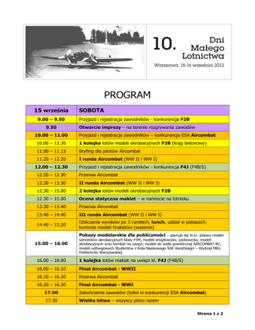 PROGRAM 15 września 9.00 – 9.50 9.50 10.00 – 11.00 SOBOTA Przyjazd i rejestracja zawodników - konkurencja F2B Otwarcie imprezy – na terenie rozgrywania zawodów Przyjazd i rejestracja zawodników – konkurencja ESA Aircombat 10.00 – 12.30 1 kolejka lotów modeli akrobacyjnych F2B (krąg betonowy) 11.00 – 11.15 Bryfing dla pilotów Aircombat 11.20 – 12.20 I runda Aircombat (WW II i WW I) 12.00 – 12.30 Przyjazd i rejestracja zawodników - konkurencja F4J (F4B/S) 12.20 – 12.30 Przerwa Aircombat 12.30 – 13.30 II runda Aircombat (WW II i WW I) 12.30 – 15.00 2 kolejka lotów modeli akrobacyjnych F2B 12.30 – 15.00 Ocena statyczna makiet – w namiocie na lotnisku 13.30 – 13.40 Przerwa Aircombat 13.40 – 14.40 III runda Aircombat (WW II i WW I) 14.40 – 15.20 Obliczanie wyników po 3 rundach, lunch, udział w pokazach, kontrola modeli finalistów (waŜenie) 15.00 – 16.00 Pokazy modelarskie dla publiczności – planuje się m.in. pokazy modeli samolotów akrobacyjnych klasy F3M, modeli śmigłowców, szybowców, modeli akrobacyjnych oraz kombat na uwięzi, modeli do walki powietrznej AIRCOMBAT RC, modeli udźwigowych Studentów z Koła Naukowego SAE AeroDesign – Wydział MEiL Politechniki Warszawskiej 16.00 – 18.00 1 kolejka lotów makiet na uwięzi kl. F4J (F4B/S) 16.00 – 16.10 Finał Aircombat - WWII 16.10 – 16.20 Przerwa Aircombat 16.20 – 16.30 Finał Aircombat - WWI 17.00 Zakończenie zawodów (tylko w konkurencji ESA Aircombat) 17.30 Wielka bitwa – wszyscy piloci razem Strona 1 z 2 19.00 16 września Spotkanie integracyjne NIEDZIELA 9.00 – 11.00 2 kolejka lotów makiet na uwięzi kl. F4J (F4B/S) 9.00 – 11.00 Indywidualne loty treningowe F2B (teren trawiasty odsunięty od kręgu betonowego) 11.00 - 13.00 3 kolejka lotów modeli akrobacyjnych F2B 13.00 – 15.00 3 kolejka lotów makiet na uwięzi kl. F4J (F4B/S) 15.00 - 16.00 Pokazy modelarskie dla publiczności – planuje się m.in. pokazy modeli samolotów akrobacyjnych klasy F3M, modeli śmigłowców, szybowców, modeli akrobacyjnych oraz kombat na uwięzi, modeli do walki powietrznej AIRCOMBAT RC, modeli udźwigowych Studentów z Koła Naukowego SAE AeroDesign – Wydział MEiL Politechniki Warszawskiej 16.00 Zakończenie Dni Małego Lotnictwa (na starcie) 16.15 Wyjazd uczestników Uwaga: organizatorzy zastrzegają sobie moŜliwość zmiany programu dla sprawnego przebiegu zawodów. Więcej informacji na temat zawodów i moŜna znaleźć na stronie organizatora: www.artbem.pl/aeromodelklub Kontakt: Aeromodelklub Artbem, Bogdan Wierzba – tel. (22) 532-04-24 w godz. 9-17. Strona 2 z 2