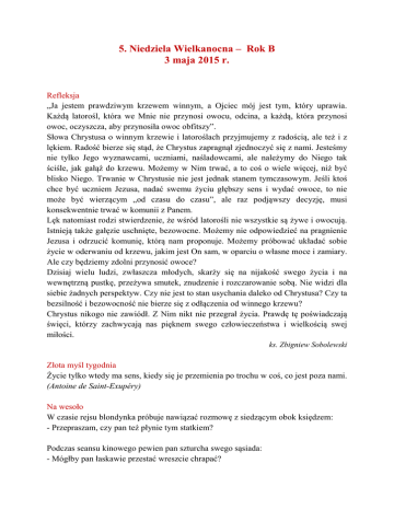 5. Niedziela Wielkanocna – Rok B 3 maja 2015 r. Refleksja „Ja jestem prawdziwym krzewem winnym, a Ojciec mój jest tym, który uprawia. Każdą latorośl, która we Mnie nie przynosi owocu, odcina, a każdą, która przynosi owoc, oczyszcza, aby przynosiła owoc obfitszy”. Słowa Chrystusa o winnym krzewie i latoroślach przyjmujemy z radością, ale też i z lękiem. Radość bierze się stąd, że Chrystus zapragnął zjednoczyć się z nami. Jesteśmy nie tylko Jego wyznawcami, uczniami, naśladowcami, ale należymy do Niego tak ściśle, jak gałąź do krzewu. Możemy w Nim trwać, a to coś o wiele więcej, niż być blisko Niego. Trwanie w Chrystusie nie jest jednak stanem tymczasowym. Jeśli ktoś chce być uczniem Jezusa, nadać swemu życiu głębszy sens i wydać owoce, to nie może być wierzącym „od czasu do czasu”, ale raz podjąwszy decyzję, musi konsekwentnie trwać w komunii z Panem. Lęk natomiast rodzi stwierdzenie, że wśród latorośli nie wszystkie są żywe i owocują. Istnieją także gałęzie uschnięte, bezowocne. Możemy nie odpowiedzieć na pragnienie Jezusa i odrzucić komunię, którą nam proponuje. Możemy próbować układać sobie życie w oderwaniu od krzewu, jakim jest On sam, w oparciu o własne moce i zamiary. Ale czy będziemy zdolni przynosić owoce? Dzisiaj wielu ludzi, zwłaszcza młodych, skarży się na nijakość swego życia i na wewnętrzną pustkę, przeżywa smutek, znudzenie i rozczarowanie sobą. Nie widzi dla siebie żadnych perspektyw. Czy nie jest to stan usychania daleko od Chrystusa? Czy ta bezsilność i bezowocność nie bierze się z odłączenia od winnego krzewu? Chrystus nikogo nie zawiódł. Z Nim nikt nie przegrał życia. Prawdę tę poświadczają święci, którzy zachwycają nas pięknem swego człowieczeństwa i wielkością swej miłości. ks. Zbigniew Sobolewski Złota myśl tygodnia Życie tylko wtedy ma sens, kiedy się je przemienia po trochu w coś, co jest poza nami. (Antoine de Saint-Exupéry) Na wesoło W czasie rejsu blondynka próbuje nawiązać rozmowę z siedzącym obok księdzem: - Przepraszam, czy pan też płynie tym statkiem? Podczas seansu kinowego pewien pan szturcha swego sąsiada: - Mógłby pan łaskawie przestać wreszcie chrapać? - Hmm. Ten film jest taki nudny, niech mi pan nie mówi, że się panu podoba... - Nie nie, ale przez pana nie mogę spać! Patron tygodnia – bł. Gizela, ksieni – 7 maja Gizela Bawarska urodziła się w 985 r. w okolicach Ratyzbony. Jej ojcem był Henryk II, książę Bawarii, a matką - Gizela Burgundzka. Była siostrą cesarza, św. Henryka II. W dzieciństwie była prawdopodobnie uczennicą św. Wolfganga z Ratyzbony, który wcześniej był misjonarzem na terenie Węgier i miał namawiać Gizelę do wyjazdu na dwór w Ostrzychomiu, by przypieczętować pokój między Niemcami i Węgrami. Miała zaledwie 10 lat, kiedy ówczesnym zwyczajem została zaręczona ze św. Stefanem, późniejszym królem Węgier. Ślub odbył się nieco. Orędownikiem tego małżeństwa był podobno św. Wojciech, który ochrzcił (lub bierzmował) św. Stefana. W tym świętym małżeństwie urodziło się prawdopodobnie czworo dzieci, z których dwoje zmarło zaraz po urodzeniu. Znamy imiona dwóch synów: Otto i Emeryk. Obaj z ojcem zostali ogłoszeni świętymi. Według świadectw kronik Gizela była nie tylko kochaną małżonką św. Stefana, ale także mądrą współrządzącą państwem, które dopiero dźwigało się z pogaństwa. Korzystając z tego, że święty małżonek zajęty sprawami politycznymi dał jej wolną rękę w czynieniu dobra, była szczodrą w rozdawaniu jałmużny i ofiar na cele kościelne. Ufundowała kilka klasztorów i kościołów, przez co wielce się przysłużyła utrwaleniu chrześcijaństwa na ziemi węgierskiej. Jej staraniom przypisuje się wystawienie katedry w Veszprem (gdzie obecnie znajduje się część jej relikwii). Uposażyła również wiele kościołów w sprzęty i paramenty liturgiczne. Po śmierci św. Stefana w 1038 r. Gizela musiała przejść cały szereg udręk i prześladowań ze strony pretendentów do tronu, którzy chcieli przywrócić na Węgrzech pogaństwo. Przy pomocy brata, Henryka II, powróciła w 1045 r. do Niemiec, do Niederburga w pobliżu Pasawy, gdzie wstąpiła do benedyktynek, by tam dopełnić lat swojego życia. Zmarła jako ksieni tego opactwa w 75. roku życia w 1060 r. Zachował się do dziś jej oryginalny grobowiec z XI stulecia. Błogosławioną została ogłoszona przez bł. Pawła VI w 1975 roku. Opowiadanie Punkt widzenia Dwa wróble siedziały zgodnie wśród gałęzi wierzby. Jeden usadowił się na czubku drzewa, drugi umieścił się dużo niżej, w zacisznym rozwidleniu gałązek. Po pewnym czasie wróbelek siedzący na górze, chcąc zawrzeć znajomość z drugim, powiedział: - Och, jakie piękne są te zielone liście! Wróbelek z dołu uznał to za prowokację i odparł sucho: - Czy jesteś ślepy? Nie widzisz, że te liście są białe? Ten z góry krzyknął zdenerwowany: - Sam jesteś ślepy! Liście są zielone! Wróbel siedzący na dole uniósł dziób i stwierdził: - Założę się o pióra z mojego ogona, że te liście są białe. A ty nic nie rozumiesz. Głupi jesteś! W tym momencie wróbelek z góry poczuł, że krew się w nim gotuje i nie namyślając się długo, sfrunął ku swemu przeciwnikowi, aby dać mu nauczkę. Ten zaś nawet nie drgnął. Kiedy tak dwa wróbelki siedziały naprzeciwko siebie, z piórami nastroszonymi ze złości, przed rozpoczęciem pojedynku miały jeszcze tyle rozsądku, by spojrzeć w górę. Wróbelek, który sfrunął ze szczytu wierzby, zawołał ze zdziwieniem: - Och! Zobacz, te liście naprawdę są białe! Polećmy tam, gdzie siedziałem przedtem! Oba wróble zgodnie orzekły: - Te liście są zielone! Nie osądzaj nikogo, jeżeli przedtem nie maszerowałeś przez godzinę w jego butach Św. Jan Paweł II o życiu konsekrowanym 