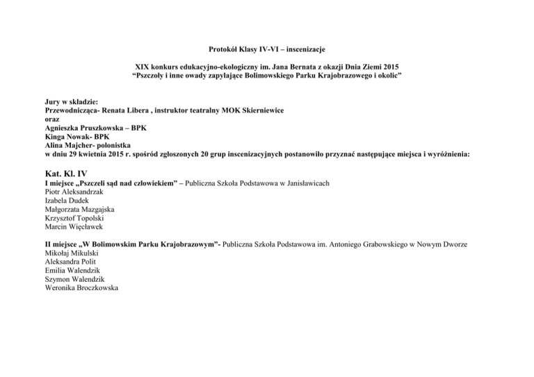 Protokół Klasy IV-VI – inscenizacje XIX konkurs edukacyjno-ekologiczny im. Jana Bernata z okazji Dnia Ziemi 2015 “Pszczoły i inne owady zapylające Bolimowskiego Parku Krajobrazowego i okolic” Jury w składzie: Przewodnicząca- Renata Libera , instruktor teatralny MOK Skierniewice oraz Agnieszka Pruszkowska – BPK Kinga Nowak- BPK Alina Majcher- polonistka w dniu 29 kwietnia 2015 r. spośród zgłoszonych 20 grup inscenizacyjnych postanowiło przyznać następujące miejsca i wyróżnienia: Kat. Kl. IV I miejsce „Pszczeli sąd nad człowiekiem” – Publiczna Szkoła Podstawowa w Janisławicach Piotr Aleksandrzak Izabela Dudek Małgorzata Mazgajska Krzysztof Topolski Marcin Więcławek II miejsce „W Bolimowskim Parku Krajobrazowym”- Publiczna Szkoła Podstawowa im. Antoniego Grabowskiego w Nowym Dworze Mikołaj Mikulski Aleksandra Polit Emilia Walendzik Szymon Walendzik Weronika Broczkowska III miejsce „Nasi przyjaciele- owady”- Szkoła Podstawowa im. ks. Konarskiego w Skierniewicach Julia Górska Natalia Górska Marta Skrzypek Zofia Soska Weronika Zwierz Wyróżnienie „Wojna domowa” Gminny Ośrodek Kultury w Nieborowie Angelika Kubiszewska Amelia Kłosowska Zuzanna Gasińska Maria Gać Julia Nowak Kat. Kl. V I miejsce „”Motyle” Szkoła Podstawowa nr 5 Skierniewice Karolina Orłowska Natalia Tałataj Agata Krupińska Dawid Lange Julia Kucharska II miejsce „Straj spod plastra miodu” -Gminny Ośrodek Kultury w Nieborowie Lidia Kuś Marta Sułtan Natalia Sobieraj Ewa Kozioł Weronika Fiutkowska III miejsce „Katechizm małego bączka” - Młodzieżowy Ośrodek Socjoterapii w Kiernozi Kamil Czubiński Paweł Troć Krystian Grabarz Michał Załęcki Krystian Woźniak Wyróżnienie kat. kl. V „Nowe zwyczaje pszczół”- Szkoła Podstawowa w Słomkowie Daria Ambroziak Zuzanna Bolimowska Ewa Grochala Julia Sut Wiktor Foks Wyróżnienie kat. kl. V „O kwiatku, który chciał być jabłkiem” Szkoła Podstawowa w Bolimowie Wiktoria Milner Zuzanna Maluchnik Kinga Żakowska Izabela Tarczyk Weronika Kozieł Wyróżnienie kat. kl. V „Państwo pszczół”- Szkoła Podstawowa Stary Waliszew (Nagroda Starostwa Powiatowego w Łowiczu) Amelia Latosiewicz Aleksandra Olejniczak Marta Wielemborek Małgorzata Kamińska Emanuel Dałek Kategoria kl. VI I miejsce „Rozprawa sądowa” Szkoła Podstawowa w Słomkowie Karolina Maszkowska Karolina Rosińska Sandra Korbeń Amelia Janus Natalia świderek II miejsce „Pszczoły i inne owady zapylające” Szkoła Podstawowa w Dzierzgówku Gabriela Barlak Martyna Stefańska Weronika Stefańska Marta Bartosiewicz Michalina Żaczek III miejsce „Sen o pszczołach” Szkoła Podstawowa w Białyninie Agata Gronowska Izabela Klemba Weronika Wojciechowska Mateusz Lesiak Mateusz Kotynia W kategorii klas VI wyróżnień nie przyznano. Podpisy jury: 1. Renata Libera ……………………………………………… 2. Agnieszka Pruszkowska ………………………………….. . 3. Kinga Nowak …………………………………………….. 4. Alina Majcher …………………………………………….. Protokół sporządziła: Krystyna Piotrowicz