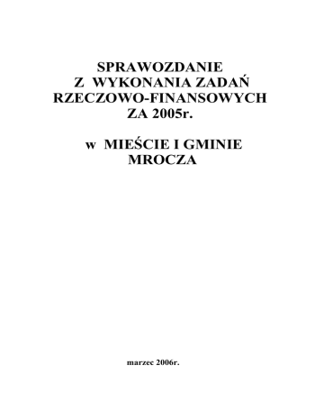 SPRAWOZDANIE Z WYKONANIA ZADAŃ RZECZOWO-FINANSOWYCH ZA 2005r. w MIEŚCIE I GMINIE MROCZA marzec 2006r. Spis treści I. Ogólna charakterystyka Miasta i Gminy Mrocza ........................... 4 II. Rolnictwo, Ochr. Środowiska, Leśnictwo, Gosp. Gruntami ........... 6 III. Gospodarka Komunalna .................................................................. 11 IV. Kultura, Sport, Rekreacja ................................................................. 23 V. Oświata .............................................................................................33 VI. Bezpieczeństwo publiczne ................................................................47 - ochrona ppoż. ......................................................... 49 VII. Opieka społeczna .............................................................................. 52 VIII. Samorząd Miasta i Gminy ................................................................. 60 - Urząd Miasta i Gminy ........................................... 61 IX. Budżet Miasta i Gminy ...................................................................... 81 2 WSTĘP Sprawozdanie z wykonania zadań rzeczowo-finansowych obejmuje informacje z realizacji zadań własnych, zleconych i powierzonych Gminie Mrocza w roku 2004. Dane zawarte w niniejszym sprawozdaniu oparte są na informacjach złożonych przez poszczególne stanowiska w Urzędzie Miasta i Gminy Mrocza, jednostki organizacyjne i pomocnicze Gminy oraz działające organizacje pozarządowe. W opracowaniu informacyjnie scharakteryzowano Miasto i Gminę Mrocza, co ma niewątpliwy wpływ na wykonawstwo zadań rzeczowo-finansowych przez organy Gminy. 3 I. OGÓLNA CHARAKTERYSTYKA MIASTA I GMINY 1. Krótka informacja Miasto i Gmina Mrocza w obecnym kształcie powstała 1 stycznia 1973r. Powierzchnia Gminy wraz z miastem Mrocza – 150,71 km2, w tym teren miejski – 4,32 km2, a teren wiejski – 146,39 km2. Gmina Mrocza leży w powiecie nakielskim, w woj. kujawsko – pomorskim. Gmina podzielona jest na 15 sołectw. SOŁECTWO 1. BIAŁOWIEŻA 2.DRĄŻNO 3. DRZEWIANOWO 4. IZABELA 5. JEZIORKI ZABARTOWSKIE 6. KAŹMIERZEWO 7. KOSOWO 8. KRUKÓWKO 9. MATYLDZIN 10. OSTROWO 11. ROŚCIMIN 12. SAMSIECZYNEK 13. WIELE 14. WITOSŁAW 15. WYRZA MIEJSCOWOŚĆ Białowieża Orlinek Jadwigowo Drążno Drążonek Drzewianowo Izabela Podgórz Zdrogowo Jeziorki Zabartowskie Rajgród Kaźmierzewo Orzelski Młyn Kosowo Kozia Góra Modrkowo Krukówko Matyldzin Ostrowo Chwałka Słupówko Rościmin Samsieczynek Wiele Konstantowo Dąbrowice Witosław Orle Wyrza 4 POW. w ha LICZBA MIESZKAŃCÓW 829 307 819 315 890 286 789 194 482 217 604 191 881 455 649 203 497 280 1234 343 1039 279 325 213 2757 525 1634 878 1085 352 Na terenie Gminy znajdują się następujące miejscowości: 1. miasto Mrocza 2. Białowieża 3. Chwałka 4. Leś. Dąbrowice 5. Drążno 6. Drążonek 7. Drzewianowo 8. Izabela 9. Jadwigowo 10. Jeziorki Zabartowskie 11. Kaźmierzewo 12. Kosowo 13. Kozia Góra Krajeńska 14.Konstantowo 15. Krukówko 16. Matyldzin 17. Modrakowo 18. Orle 19. Orlinek 20. Ostrowo 21. Orzelski Młyn 22. Podgórz 23. Rajgród 24. Rościmin 25. Samsieczynek 26. Słupówko 27. Wiele 28. Witosław 29. Wyrza 30. Zdrogowo 16.2. Struktura użytkowania gruntów Miasta i Gminy Mrocza Wyszczególnienie Powierzchnia w ha Udział w % 1. Użytki rolne 11 041 73,2 - w tym grunty orne 2. Lasy i tereny leśne 9 933 2 181 89,9 14,5 3. Pozostałe grunty 1 849 12,4 15071 100 Razem 3. LUDNOŚĆ Miasto i Gminę Mrocza zamieszkuje ogółem 9249 mieszkańców (stan na dzień 31.12.2005r.). 3.1. Statystyka stałych mieszkańców wg wieku i płci w gminie Mrocza – wieś Wiek 0-7 8-15 16-18 19-65 19-60 pow.60 pow.65 Płeć M K M K M K M K K M Liczba 271 248 352 334 127 121 1631 1401 351 182 Razem M K 2563 2455 M+K 5018 3.2. Statystyka stałych mieszkańców wg wieku i płci w mieście Mrocza Wiek 0-7 8-15 16-18 19-65 19-60 pow.60 pow.65 Płeć M K M K M K M K K M Liczba 215 187 265 233 107 96 1398 1293 305 132 5 Razem M K 2117 2114 M+K 4231 II. ROLNICTWO, OCHRONA ŚRODOWISKA, LEŚNICTWO, GOSPODARKA GRUNTAMI Dział ten obejmuje wykonanie zadań z zakresu: Rolnictwa Melioracji Ochrony Środowiska Infrastruktury terenów Gospodarki nieruchomościami Leśnictwa I. Rolnictwo 1. Pobrano i przebadano 218 próbek glebowych w sołectwie Krukówko. 2. Zorganizowano cztery szkolenia rolnicze w zakresie wprowadzenia przepisów UE. 3. Dokonano przeglądu 7 punktów kopulacyjnych celem przygotowania wypłat dotacji (zakup paszy). 4. Wydano 2 decyzje na uprawę 1,0 ha maku i przeprowadzono zgodnie z ustawą o przeciwdziałaniu narkomanii dwie kontrole na terenie zasianych plantacji. 5. Wydano 26 upomnień o likwidacji chwastów zgodnie z ustawą o ochronie gruntów rolnych i leśnych. 6. Zawarto umowę z Przedsiębiorstwem Produkcyjno – Handlowym „HETMAN” na bezpłatny odbiór i utylizacje padłych zwierząt z terenu gminy Mrocza. 7. Dokonano kontroli 5 gospodarstw prowadzących hodowle bydła mlecznego celem wypłaty dotacji (obory są pod kontrolą użytkowości mlecznej). 8. Komisja Gminna ds. oszacowania szkód w wyniku klęski suszy w dniach od 26 lipca 2005r. do 05 sierpnia 2005r. dokonała szacowania wysokości doznanych szkód w 252 gospodarstwach, co stanowi 71% ogółu gospodarstw. Straty stwierdzono na powierzchni 9073,33 ha. Średnie straty w uprawach: Żyto – 36,95% Pszenica – 35,50% Jęczmień – 38,33% Rzepak – 30,87 % Kukurydza – 40,41% Ziemniaki – 36,26% Buraki cukrowe – 43,1% Trawy – 50% 9. Wykonano konserwację rowów melioracyjnych w sołectwach: Drzewianowo, Ostrowo, Białowieża, Kaźmierzewo, Wyrza, Krukówko, Wiele poprzez: - wykoszenie porostów ze skarp - 110527 m2 - usuniecie namułu z dna rowu – 24553 mb - usuniecie namułu z wylotów – 55 szt. - usuniecie namułu z przepustów – 243 mb - usuniecie namułu ze studzien – 95 szt. oraz na terenie miasta Mrocza i na rzece Rokitce: - ułożenie opaski faszynowej