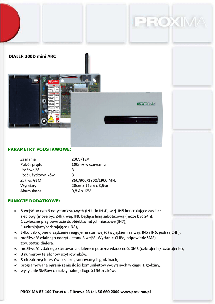 DIALER 300D mini ARC PARAMETRY PODSTAWOWE: Zasilanie Pobór prądu Ilość wejść Ilość użytkowników Zakres GSM Wymiary Akumulator 230V/12V 100mA w czuwaniu 8 8 850/900/1800/1900 MHz 20cm x 12cm x 3,5cm 0,8 Ah 12V FUNKCJE DODATKOWE: • • • • • • • • 8 wejść, w tym 6 natychmiastowych (IN1-do IN 4), wej. IN5 kontrolujące zasilacz sieciowy (może być 24h), wej. IN6 będące linią sabotażową (może być 24h), 1 zwłoczne przy powrocie doobiektu/natychmiastowe (IN7), 1 uzbrajające/rozbrajające (IN8), tylko uzbrojone urządzenie reaguje na stan wejść (wyjątkiem są wej. IN5 i IN6, jeśli są 24h), możliwość zdalnego odczytu stanu 8 wejść (Wysłanie CLIPa, odpowiedź SMS), tzw. status dialera, możliwość zdalnego sterowania dialerem poprzez wiadomość SMS (uzbrojenie/rozbrojenie), 8 numerów telefonów użytkowników, 8 niezależnych testów o zaprogramowanych godzinach, programowane ograniczenie ilości komunikatów wysyłanych w ciągu 1 godziny, wysyłanie SMSów o maksymalnej długości 56 znaków. PROXIMA 87-100 Toruń ul. Filtrowa 23 tel. 56 660 2000 www.proxima.pl