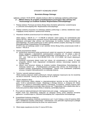 OTWARTY KONKURS OFERT Burmistrz Brzegu Dolnego ogłasza z dniem 10.03.2016r. otwarty konkurs ofert na realizację zadania publicznego pn. „Wkład własny do projektu przedsięwzięcia promujące ideę odnowy wsi finansowego ze środków budżetu Województwa Dolnośląskiego” 1. Rodzaj zadania: Promocja wsi Gminy Brzeg Dolny formalnie zgłoszonej i uczestniczącej w „Odnowie Dolnośląskiej Wsi” Województwa Dolnośląskiego. 2. Dotacja zostanie przyznana na realizację zadania publicznego z zakresu działalności wspomagającej rozwój wspólnot i społeczności lokalnej. 3. Wysokość środków przeznaczonych do realizacji tego zadania: wkład własny 1 166,55 zł x 7 = 8 165,85 zł (słownie: osiem tysięcy sto sześćdziesiąt pięć złotych 85/100). Maksymalna wysokość pomocy stanowiącej wkład własny do projektu przedsięwzięcia promujące ideę odnowy wsi finansowego ze środków budżetu Województwa Dolnośląskiego, nie może przekroczyć 21,00% ogólnej wartości projektu złożonego do Urzędu Marszałkowskiego Województwa Dolnośląskiego. W 2015 roku na realizację zadań w tym zakresie Gmina Brzeg Dolny przeznaczyła środki w kwocie 1 165,50 zł. 4. Zasady przyznawania dotacji: a) powierzenie wykonania wyżej wymienionych zadań lub wsparcie ich realizacji i udzielenie dotacji następuje z odpowiednim zastosowaniem przepisów art. 16 ustawy z dnia 24 kwietnia 2003 r. o działalności pożytku publicznego i wolontariacie (t.j. dz. U. z 2010 r. Nr 234 , poz. 1536 ze zm.); Dz.U.08.209.1316 z dn. 01.01.2009r. lub innych właściwych przepisów. b) wysokość przyznanej dotacji może być niższa, niż wnioskowana w ofercie. W takim przypadku oferent może negocjować zmniejszenie zakresu rzeczowego zadania lub wycofać ofertę. c) oferent musi otrzymać dotację ze środków budżetu Województwa Dolnośląskiego na realizację zadania pn. „Przedsięwzięcia promujące ideę odnowy wsi finansowego ze środków budżetu Województwa Dolnośląskiego”. Oferent musi przedstawić podpisaną umową z Urzędem Marszałkowskim na realizację zadania. 5. Terminy i warunki realizacji zadania. Oferty powinny dotyczyć zadań publicznych, których realizacja rozpoczyna się nie wcześniej niż dnia 01.09.2016r. i kończy się nie później niż 16.12.2016r. 6. Termin składania oferty Oferty konkursowe należy składać w nieprzekraczalnym terminie do dnia 30.03.2016r. do godz. 12.00 w sekretariacie Urzędu Miejskiego w Brzegu Dolnym, ul. Kolejowa 29. Oferta powinna być złożona w zamkniętej kopercie z adnotacją na kopercie: „Otwarty konkurs ofert 2016 r – „Przedsięwzięcia promujące ideę odnowy wsi”. Organizacja, która składa kilka ofert w konkursie powinna złożyć każda ofertę w odrębnej, zamkniętej kopercie. 7. Przy wyborze najkorzystniejszych ofert będą brane pod uwagę - następujące kryteria: Projekt może być realizowany wyłącznie na obszarze Gminy przez sołectwa formalnie zgłoszone i uczestniczące w „Odnowie Dolnośląskiej Wsi” województwa dolnośląskiego. 8. Uczestnikami konkursu mogą być : Organizacje pozarządowe, podmioty wymienione w art. 3 ust.3 Ustawy z dnia 24 kwietnia 2003 roku o działalności pożytku publicznego i wolontariacie, oraz jednostki organizacyjne podległe organom administracji publicznej lub przez nie nadzorowane. 9. Oferty będą rozpatrzone do dnia 31 marca 2016 roku. 1 10. Wymagane załączniki do oferty: a. ksero wniosku złożonego do Urzędu Marszałkowskiego Województwa Dolnośląskiego, b. oświadczenia o (na jednym formularzu) – Oświadczenie 1 - zobowiązaniu do utrzymania wskazanego w ofercie rachunku bankowego nie krócej niż do chwili dokonania ostatecznych rozliczeń z Gminą Brzeg Dolny, - nie zaleganiu z płatnościami wobec Gminy Brzeg Dolny, organów podatkowych i ZUS, - zapoznaniu się z treścią ogłoszenia konkursowego, posiadaniu uprawnień i kwalifikacji niezbędnych do realizacji zleconego zadania publicznego, - zapewnieniu lokalu do realizacji zadania (np. umowy najmu, dzierżawy, użyczenia). c. oświadczenie (na jednym formularzu) – Oświadczenie 2. - nie ubieganiu się o środki finansowe z innych źródeł gminnych na to samo zadanie, - nie prowadzeniu przeciwko podmiotowi ubiegającemu się o udzielenie dotacji egzekucji na podstawie przepisów prawa cywilnego i administracyjnego. d. aktualny odpis lub wyciąg z właściwego rejestru - ksero, e. aktualny statut - ksero, f. wstępny harmonogram realizacji zadania – Harmonogram g. pełnomocnictwa do działania w imieniu organizacji (w przypadku, gdy umowę podpisują osoby inne niż umocowane do reprezentacji zgodnie z rejestrem). 11. Oferta konkursowa. Oferty należy składać zgodnie ze wzorem określonym w Rozporządzeniu Ministra Pracy i Polityki Społecznej z dnia 27 grudnia 2005r. w sprawie wzoru oferty realizacji zadania publicznego, ramowego wzoru umowy o wykonanie zadania publicznego i wzoru sprawozdania z wykonania tego zadania (Dz. U. Nr 264, poz. 2207) znajdujących się na stronie internetowej Urzędu Miejskiego www.bip.brzegdolny.pl – organizacje pozarządowe.Druki można także pobrać w Urzędzie Miejskim w Brzegu Dolnym. Burmistrz Stanisław Jastrzębski 2