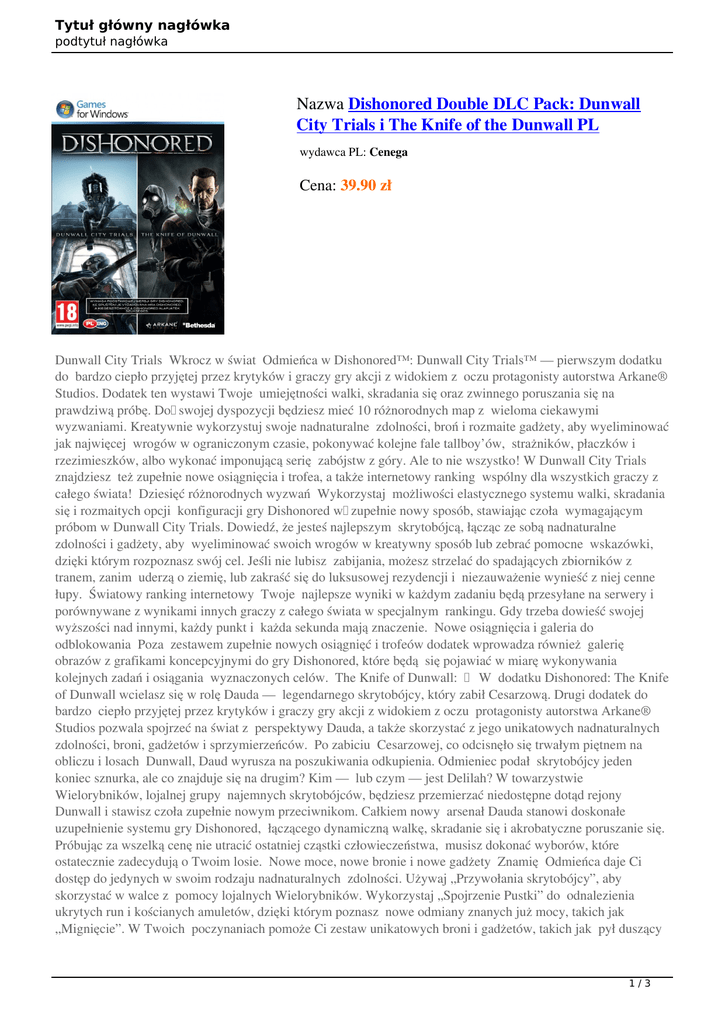 Tytuł główny nagłówka podtytuł nagłówka Nazwa Dishonored Double DLC Pack: Dunwall City Trials i The Knife of the Dunwall PL wydawca PL: Cenega Cena: 39.90 zł Dunwall City Trials Wkrocz w świat Odmieńca w Dishonored™: Dunwall City Trials™ — pierwszym dodatku do bardzo ciepło przyjętej przez krytyków i graczy gry akcji z widokiem z oczu protagonisty autorstwa Arkane® Studios. Dodatek ten wystawi Twoje umiejętności walki, skradania się oraz zwinnego poruszania się na prawdziwą próbę. Do swojej dyspozycji będziesz mieć 10 różnorodnych map z wieloma ciekawymi wyzwaniami. Kreatywnie wykorzystuj swoje nadnaturalne zdolności, broń i rozmaite gadżety, aby wyeliminować jak najwięcej wrogów w ograniczonym czasie, pokonywać kolejne fale tallboy’ów, strażników, płaczków i rzezimieszków, albo wykonać imponującą serię zabójstw z góry. Ale to nie wszystko! W Dunwall City Trials znajdziesz też zupełnie nowe osiągnięcia i trofea, a także internetowy ranking wspólny dla wszystkich graczy z całego świata! Dziesięć różnorodnych wyzwań Wykorzystaj możliwości elastycznego systemu walki, skradania się i rozmaitych opcji konfiguracji gry Dishonored w zupełnie nowy sposób, stawiając czoła wymagającym próbom w Dunwall City Trials. Dowiedź, że jesteś najlepszym skrytobójcą, łącząc ze sobą nadnaturalne zdolności i gadżety, aby wyeliminować swoich wrogów w kreatywny sposób lub zebrać pomocne wskazówki, dzięki którym rozpoznasz swój cel. Jeśli nie lubisz zabijania, możesz strzelać do spadających zbiorników z tranem, zanim uderzą o ziemię, lub zakraść się do luksusowej rezydencji i niezauważenie wynieść z niej cenne łupy. Światowy ranking internetowy Twoje najlepsze wyniki w każdym zadaniu będą przesyłane na serwery i porównywane z wynikami innych graczy z całego świata w specjalnym rankingu. Gdy trzeba dowieść swojej wyższości nad innymi, każdy punkt i każda sekunda mają znaczenie. Nowe osiągnięcia i galeria do odblokowania Poza zestawem zupełnie nowych osiągnięć i trofeów dodatek wprowadza również galerię obrazów z grafikami koncepcyjnymi do gry Dishonored, które będą się pojawiać w miarę wykonywania kolejnych zadań i osiągania wyznaczonych celów. The Knife of Dunwall: W dodatku Dishonored: The Knife of Dunwall wcielasz się w rolę Dauda — legendarnego skrytobójcy, który zabił Cesarzową. Drugi dodatek do bardzo ciepło przyjętej przez krytyków i graczy gry akcji z widokiem z oczu protagonisty autorstwa Arkane® Studios pozwala spojrzeć na świat z perspektywy Dauda, a także skorzystać z jego unikatowych nadnaturalnych zdolności, broni, gadżetów i sprzymierzeńców. Po zabiciu Cesarzowej, co odcisnęło się trwałym piętnem na obliczu i losach Dunwall, Daud wyrusza na poszukiwania odkupienia. Odmieniec podał skrytobójcy jeden koniec sznurka, ale co znajduje się na drugim? Kim — lub czym — jest Delilah? W towarzystwie Wielorybników, lojalnej grupy najemnych skrytobójców, będziesz przemierzać niedostępne dotąd rejony Dunwall i stawisz czoła zupełnie nowym przeciwnikom. Całkiem nowy arsenał Dauda stanowi doskonałe uzupełnienie systemu gry Dishonored, łączącego dynamiczną walkę, skradanie się i akrobatyczne poruszanie się. Próbując za wszelką cenę nie utracić ostatniej cząstki człowieczeństwa, musisz dokonać wyborów, które ostatecznie zadecydują o Twoim losie. Nowe moce, nowe bronie i nowe gadżety Znamię Odmieńca daje Ci dostęp do jedynych w swoim rodzaju nadnaturalnych zdolności. Używaj „Przywołania skrytobójcy”, aby skorzystać w walce z pomocy lojalnych Wielorybników. Wykorzystaj „Spojrzenie Pustki” do odnalezienia ukrytych run i kościanych amuletów, dzięki którym poznasz nowe odmiany znanych już mocy, takich jak „Mignięcie”. W Twoich poczynaniach pomoże Ci zestaw unikatowych broni i gadżetów, takich jak pył duszący 1/3 Tytuł główny nagłówka podtytuł nagłówka czy zasilane tranem miny ogłuszające, które pozwalają oszałamiać wrogów, a także ukryta pod rękawem minikusza do wystrzeliwania strzałek usypiających i bełtów wybuchowych. Poznaj nowe zakamarki Dunwall Przemierzaj zaułki Dzielnicy Prawników i zakradnij się do Rzeźni Rothwilda — spowitej kłębami pary przetwórni wypełnionej ogromnymi truchłami wielorybów i potężnymi rzeźnikami. Odwiedź ponownie znaną z podstawowej gry rozpadającą się Zatopioną Dzielnicę, w której znajduje się ukryta baza Dauda. Spójrz na zdarzenia znane z gry Dishonored — w tym na pamiętny moment wyznaczający początek przygód Corvo — z zupełnie nowej perspektywy. Wybierz swoją drogę Wykonuj kolejne misje w poszukiwaniu odpowiedzi na dręczące Dauda pytania w dowolnie wybranym stylu. Twoje odkupienie — lub rzucenie się w objęcia ciemności — zależy od Twoich umiejętności i podejmowanych decyzji. Odkryj tajemnicę Delili w tym samodzielnym dodatku, aby następnie doprowadzić historię Dauda do końca w następnym dodatku — The Brigmore Witches. 2/3 Tytuł główny nagłówka podtytuł nagłówka Nazwa Wartość Wydawca PL Cenega Poland Data premiery 12-go lipca 2013 Producent Tryb gry Kategoria wiekowa Wersja językowa Wymagania sprzętowe Format Arkane Studios Single Player 18+ PL (napisy) Quad Core i5 2.4 GHz, 4 GB RAM, karta grafiki 768 MB (G DVD 3/3