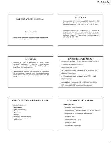 2016-04-28 ZALECENIA ZATOROWOŚĆ PŁUCNA • Konstantinides S, Torbicki A, Agnelli G et al. „2014 ESC Guidelines on the diagnosis and management of acute pulmonary embolism.” Eur Heart J 2014: 35; 3033-3080. Marcin Grabicki Katedra i Klinika Pulmonologii, Alergologii i Onkologii Pulmonologicznej Uniwersytetu Medycznego im. K. Marcinkowskiego w Poznaniu ZALECENIA • Zawilska K, Bała M, Błędowski P i wsp. „Polskie wytyczne profilaktyki i leczenia żylnej choroby zakrzepowo-zatorowej - aktualizacja 2012.” Medycyna Praktyczna, wyd. specjalne 2012. • „Antithrombotic Therapy and Prevention of Thrombosis, 9th ed: American College of Chest Physicians EvidenceBased Clinical Practice Guidelines.” Chest 2012; 141: 1Se801S. • Dąbrowska-Kugacka A; Grochowicz U, Bednarz B, Filipiak KJ, Kurzyna M. „Wytyczne ESC dotyczące rozpoznawania i postępowania w ostrej zatorowości płucnej w 2014 roku.” – tłumaczenie. Kardiologia Polska 2014; 72, 11: 997–1053 EPIDEMIOLOGIA ŻChZZ • zapadalność: ŻChZZ 1-2/1000 osób rocznie, ZP 0,5/1000 • 3. choroba sercowo-naczyniowa • śmiertelność ZP: 7-10% • 50% pacjentów z ZŻG ma cechy ZP w TK, często bez objawów klinicznych • u 70% pacjentów z ZP występują cechy ZŻG w bad. diagnostycznych • epizod ZP po 1. epizodzie: ZP vs ZŻG (60% vs 20%) • 30% przypadków ZP samoistnej/idiopatycznej PRZYCZYNY BEZPOŚREDNIE ŻChZZ Materiał zatorowy: • skrzeplina • płyn owodniowy • powietrze • tłuszcz • komórki nowotworowe • ciało obce CZYNNIKI RYZYKA ŻChZZ • Silne (OR>10): – złamanie kończyny dolnej – hospitalizacja z powodu NS lub MP/TP (ost. 3 m-ce) – aloplastyka st. biodrowego, kolanowego – poważny uraz – zawał serca (ost. 3 m-ce) – przebyta ŻChZZ – uraz rdzenia kręgowego 1 2016-04-28 CZYNNIKI RYZYKA ŻChZZ Umiarkowane (OR 2-9): – artroskopowy zabieg kolana – cewnik centralny – nowotwory złośliwe – chemioterapia – PNS lub PNO – HTZ, doustna antykoncepcja – udar mózgu z porażeniem – choroba zapalna jelit – połóg – trombofilia – choroby autoimmunologiczne – przetoczenie krwi – stymulacja erytropoezy – zapłodnienie in vitro – zakażenia (płuc, dróg moczowych, HIV) – zakrzepica żył powierzchownych RYZYKO - CHOROBA NOWOTWOROWA • Ryzyko wystąpienia ŻChZZ jest 4-krotnie wyższe niż w populacji ogólnej. • Chorzy poddani chemioterapii charakteryzują się 6-krotnie wyższym skorygowanym ryzykiem wystąpienia ŻChZZ w porównaniu ze zdrową populacją. Profilaktyczne leczenie przeciwkrzepliwe nie jest rutynowo zalecane podczas ambulatoryjnej chemioterapii. • Ryzyko ŻChZZ wzrasta ponad 90-krotnie w ciągu pierwszych 6 tygodni po operacji nowotworu w porównaniu z osobami zdrowymi , pozostaje podwyższone (maksymalnie 30-krotnie) między 4. a 12. miesiącem po zabiegu. CZYNNIKI RYZYKA ŻChZZ • Słabe (OR < 2): – – – – – – – – – OBJAWY KLINICZNE • Objawy podmiotowe: pozycja leżąca > 3 dni wielogodzinna pozycja siedząca wiek zabiegi laparoskopowe (np. cholecystektomia) otyłość cukrzyca nadciśnienie tętnicze ciąża żylaki – duszność 80% – ból opłucnowy 52% – kaszel 20% – utrata przytomności 19% – ból zamostkowy 12% – krwioplucie 11% RÓŻNICOWANIE OBJAWY KLINICZNE • zapalenie płuc i opłucnej • Objawy przedmiotowe: • POChP - zaostrzenia – tachypnoe (> 20/min.) 70% – tachykardia (> 100/min.) 26% – objawy ZŻG 15% – sinica 11% – gorączka (> 38,5oC) 7% • ostre zapalenie oskrzeli • OZW, tętniak aorty piersiowej • neuralgia międzyżebrowa • kurcz przełyku • pierwotne nadciśnienie płucne • napady lęku 2 2016-04-28 OCENA RYZYKA (CIĘŻKOŚCI) OCENA RYZYKA (CIĘŻKOŚCI) • indywidualna ocena ryzyka wczesnego zgonu z powodu ZP (wewnątrzszpitalny lub < 30 dni) Podejrzenie ZP • stratyfikacja na podstawie markerów ryzyka: Wstrząs lub hipotensja – ZP: Wysokiego ryzyka – ZP: Nie - wysokiego ryzyka TAK NIE Wysokie ryzyko zgonu Nie-wysokie ryzyko zgonu • odejście od terminów: masywna, submasywna, niemasywna ZP OCENA RYZYKA (CIĘŻKOŚCI) WSTĘPNE DZIAŁANIA • Markery kliniczne: • ZP wysokiego ryzyka: – wstrząs – hipotensja: obniżenie skurczowego ciśnienia tętniczego krwi < 90 mmHg lub o co najmniej 40 mmHg w stosunku do wartości wyjściowej, utrzymujące się ponad 15 min., jeśli nie są spowodowane nową arytmią, hipowolemią lub posocznicą – terapia hipoksemii, wstrząsu, hipotensji – badania: morfologia krwi, gr. krwi, APTT, INR, kreatynina, gazometria • ZP nie-wysokiego ryzyka: – badania: morfologia krwi, gr. krwi, APTT, INR, kreatynina, gazometria – D-dimer DIAGNOSTYKA DIAGNOSTYKA Podejrzenie ZP Wysokiego ryzyka zgonu HNF i.v. - jeśli brak p-wsk. do lecz. p-krzepliwego • Ocena prawdopodobieństwa klinicznego ZP Skala Wells’a: Szybka dostępność TK NIE TAK TK dostępna lub pacjent stabilny ECHO SERCA: przeciążenie PK NIE Inne przyczyny TAK Inne testy niedostępne lub pacjent niestabilny > Dodatnia > Leczenie: tromboliza (gdy brak p-wsk.) TK Ujemna Inne przyczyny – – – – – – – wywiad ŻChZZ operacja lub unieruchomienie nowotwór złośliwy krwioplucie HR > 100/min. objawy klin. ZŻG inne rozpozn. mało prawdopod. 1,5 1,5 1 1 1,5 3 3 lub embolektomia 3 2016-04-28 DIAGNOSTYKA DIAGNOSTYKA • Prawdopodobieństwo kliniczne – skala Wells’a: – niskie – pośrednie – wysokie 0-1 2-6 >6 • Prawdopodobieństwo kliniczne – skala Wells’a (2 kategorie): – mało prawdopodobna – prawdopodobna 0–4 >4 • Ocena prawdopodobieństwa klinicznego ZP Skala Wells’a uproszczona: – – – – – – – DIAGNOSTYKA 1 1 1 1 1 1 1 DIAGNOSTYKA • Prawdopodobieństwo kliniczne – skala Wells’a uproszczona: – mało prawdopodobna – prawdopodobna wcześniejsza ZP lub ZŻG niedawna operacja lub unieruchomienie rak krwioplucie HR > 100/min. kliniczne objawy ZŻG inne rozpoznanie niż ZP mniej prawdopod. 0–1 >1 