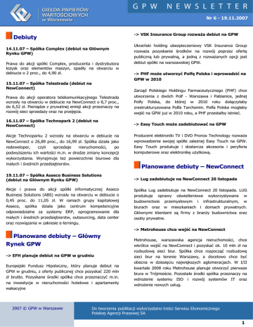 Nr 6 - 19.11.2007 -> VSK Insurance Group rozwaŜa debiut na GPW Debiuty 14.11.07 – Spółka Complex (debiut na Głównym Rynku GPW) Prawa do akcji spółki Complex, producenta i dystrybutora łoŜysk oraz elementów maszyn, spadły na otwarciu w debiucie o 2 proc., do 4,90 zł. 15.11.07 – Spółka Telestrada (debiut na NewConnect) Ukraiński holding ubezpieczeniowy VSK Insurance Group rozwaŜa pozyskanie środków na rozwój poprzez ofertę publiczną lub prywatną, a jedną z rozwaŜanych opcji jest debiut spółki na warszawskiej GPW. -> PHF moŜe utworzyć Polfę Polska i wprowadzić na GPW w 2010 Prawa do akcji operatora telekomunikacyjnego Telestrada wzrosły na otwarciu w debiucie na NewConnect o 8,7 proc., do 6,52 zł. Pieniądze z prywatnej emisji akcji przeznaczy na rozwój sieci sprzedaŜy oraz na przejęcia. Zarząd Polskiego Holdingu Farmaceutycznego (PHF) chce utworzenia z dwóch Polf - Warszawa i Pabianice, jednej Polfy Polska, do której w 2010 roku dołączyłaby zrestrukturyzowana Polfa Tarchomin. Polfa Polska mogłaby wejść na GPW juŜ w 2010 roku, a PHF przestałby istnieć. 16.11.07 – Spółka Technopark 2 (debiut na NewConnect) -> Easy Touch moŜe zadebiutować na GPW Akcje Technoparku 2 wzrosły na otwarciu w debiucie na NewConnect o 26,89 proc., do 16,99 zł. Spółka działa jako redeweloper, czyli sprzedaje nieruchomości, po podwyŜszeniu ich wartości m.in. w drodze zmiany koncepcji wykorzystania. Wynajmuje teŜ powierzchnie biurowe dla małych i średnich przedsiębiorstw. Producent elektroniki TV i DVD Pronox Technology rozwaŜa wprowadzenie swojej spółki zaleŜnej Easy Touch na GPW. Easy Touch produkuje i dostarcza akcesoria i peryferia komputerowe oraz elektronikę uŜytkową. Planowane debiuty – NewConnect 19.11.07 – Spółka Asseco Business Solutions (debiut na Głównym Rynku GPW) -> Lug zadebiutuje na NewConnect 20 listopada Akcje i prawa do akcji spółki informatycznej Asseco Business Solutions (ABS) wzrosły na otwarciu w debiucie o 0,45 proc. do 11,05 zł. W ramach grupy kapitałowej Asseco, spółka działa jako centrum kompetencyjne odpowiedzialne za systemy ERP, oprogramowanie dla małych i średnich przedsiębiorstw, outsourcing, data center oraz rozwiązania w zakresie e-lerningu. Spółka Lug zadebiutuje na NewConnect 20 listopada. LUG produkuje oprawy oświetleniowe wykorzystywane w budownictwie przemysłowym i infrastrukturalnym, w biurach oraz w mieszkaniach i domach prywatnych. Głównymi klientami są firmy z branŜy budownictwa oraz osoby prywatne. -> Metrohouse chce wejść na NewConnect Planowane debiuty – Główny Rynek GPW -> EFH planuje debiut na GPW w grudniu Europejski Fundusz Hipoteczny, który planuje debiut na GPW w grudniu, z oferty publicznej chce pozyskać 220 mln zł brutto. Pozyskane środki spółka chce przeznaczyć m.in. na inwestycje w nieruchomości hotelowe i apartamenty wakacyjne 2007 © GPW w Warszawie Metrohouse, warszawska agencja nieruchomości, chce wkrótce wejść na NewConnect i pozyskać ok. 10 mln zł na rozbudowę sieci biur. Spółka chce rozpocząć rozbudowę sieci biur na terenie Warszawy, a docelowo chce być obecna w dziesięciu największych aglomeracjach. W I/II kwartale 2008 roku Metrohouse planuje otworzyć pierwsze biura w Trójmieście. Pozostałe środki spółka przeznaczy na wdroŜenie systemu ISO i rozwój systemów IT oraz wdroŜenie nowych usług. Do tworzenia publikacji wykorzystano treści Serwisu Ekonomicznego Polskiej Agencji Prasowej SA 1 Nr 6 - 19.11.2007 NajwyŜsze tygodniowe zmiany kursów : -> Makolab zadebiutuje na NewConnect w 2007 MakoLab, dostawca rozwiązań biznesowych i usług outsourcingu technologicznego, zadebiutuje na NewConnect jeszcze w tym roku. Spółka chce podwoić sprzedaŜ w 2008 roku. Akcje SIMPLE LSISOFT LDASA QUMAKSEK 05VICT Kurs z 09-11-07 10,00 9,51 1,05 13,04 1,93 Kurs z 16-11-07 11,50 10,80 1,15 14,18 2,08 Zmiana (%) 15,00 13,56 9,52 8,74 7,77 Wszystkie branŜe miały ujemną stopę zwrotu. Najmniej traciły spółki z branŜy paliwowej (spadek o 0,52 proc.) i medialnej (spadek o 0,68 proc.), najwięcej zaś traciły spółki z branŜy spoŜywczej (spadek o 8,49%). Tydzień na rynku W tygodniu 12.11-16.11.2007 indeksy: GPW • • • • • • • • • • WIG20 osiągnął na koniec tygodnia poziom 3.494,30 pkt (spadek w porównaniu z poprzednim tygodniem o 3,11 proc.); średnia wartość obrotów (na sesję) wyniosła 1.082 mln zł; zawarto przeciętnie (na sesję) 14.584 transakcji - średnia wartość 1 transakcji to 37.092 zł; mWIG40 osiągnął na koniec tygodnia poziom 3.967,31 pkt (spadek w porównaniu z poprzednim tygodniem o 6,82 proc.); średnia wartość obrotów (na sesję) wyniosła 322 mln zł; zawarto przeciętnie (na sesję) 10.696 transakcji – średnia wartość 1 transakcji to 15.061 zł; sWIG80 osiągnął na koniec tygodnia poziom 15.232,53 pkt (spadek w porównaniu z poprzednim tygodniem o 8,19 proc.); średnia wartość obrotów (na sesję) wyniosła 240 mln zł; zawarto przeciętnie (na sesję) 17.747 transakcji – średnia wartość 1 transakcji to 6.749 zł; NCIndex osiągnął na koniec tygodnia 90,25 pkt (wzrost w porównaniu z poprzednim tygodniem o 2,16 proc.) w porównaniu do wartości 88,34 na zamknięcie poprzedniego tygodnia. 2007 © GPW w Warszawie 31.10.07 – Podpisanie aneksu do umowy z ING Securities GPW podpisała aneks do "Umowy o dostęp do systemów informatycznych Giełdy" z ING Securities w sprawie specjalnej zniŜki w opłatach za dane giełdowe udostępniane tzw. agentom firm inwestycyjnych, czyli osobom współpracującym z m.in. domami maklerskimi w pozyskiwaniu nowych inwestorów i w upowszechnianiu usług maklerskich. Zarząd Giełdy zdecydował o wprowadzeniu zniŜki w celu ułatwienia Członkom Giełdy działań zmierzających do aktywizacji oraz zwiększania liczby inwestorów poprzez tworzenie i rozwój sieci sprzedaŜy. 9.11.07 – Podpisanie umowy kolporterskiej z GL Trad