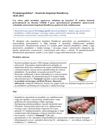 Produktopodobne? - Kontrola Inspekcji Handlowej 18.01.2011 Czy wiesz, jakie produkty spożywcze wkładasz do koszyka? W trakcie kontroli prowadzonych na zlecenie UOKiK 5 proc. sprawdzonych produktów spożywczych wzbudziło zastrzeżenia Inspekcji Handlowej, ponieważ były zafałszowane Skontrolowano prawie 5,5 tysiąca partii różnych produktów: mleka i jego przetworów, produktów z mleka koziego i owczego, mięsa i przetworów mięsnych, jaj, miodu, przetworów owocowych i warzywnych oraz oliwy z oliwek W ubiegłym roku inspektorzy Inspekcji Handlowej sprawdzali, czy przedsiębiorcy nie wprowadzają konsumentów w błąd oferując w sprzedaży zafałszowane produkty żywnościowe. Skontrolowano prawie 5,5 tysiąca partii różnych produktów: mleka i jego przetworów, produktów z mleka koziego i owczego, mięsa i przetworów mięsnych, jaj, miodu, przetworów owocowych i warzywnych oraz oliwy z oliwek. W specjalistycznych laboratoriach sprawdzono ponad 1,2 tys. partii z czego zakwestionowano 5 proc. Produkty mleczne Kontroli poddano łącznie 1580 różnego rodzaju przetworów mlecznych. Najczęstsze nieprawidłowości polegały na dodawaniu tłuszczów roślinnych do masła, nieinformowaniu o konserwantach, użyciu nazwy nieadekwatnej do wykazu składników. Na przykład: ser gouda zawierał 91 proc. tłuszczów roślinnych, a deser czekoladowy w rzeczywistości nie miał czekolady. Na skontrolowanych 314 partii masła zakwestionowano 21. Pamiętaj! Zgodnie z prawem masło to produkt zawierający od 80 do 90 proc. tłuszczów mlecznych i żadnych roślinnych. Nazwy ser, jogurt, kefir czy śmietana mogą być używane do produktów pochodzących wyłącznie z mleka krowiego. Jaja Inspektorzy sprawdzali na przykład, czy zadeklarowana waga jest zgodna z rzeczywistą, oznakowanie i szata graficzna nie wprowadzają w błąd, sugerując ekologiczną metodę produkcji. Łącznie skontrolowano 268 partii. Zastrzeżenia dotyczyły m.in. deklarowania wyższej, więc i droższej klasy wagowej (34,3 proc. spośród 137 zbadanych partii), wprowadzającego w błąd oznakowania informującego o lepszej metodzie chowu kur (4 partie, 1,4 proc.). Pamiętaj! Tylko jaja sprzedawane w tzw. sprzedaży bezpośredniej nie muszą mieć oznakowanych skorupek informujących o m.in.: metodzie chowu kur (0 – ekologiczny, 1 – na wolnym wybiegu, 2 – ściółkowy, 3 – klatkowy). Mięso i jego przetwory Pod kątem zafałszowań skontrolowano łącznie 700 partii mięsa i 966 partii jego przetworów. W laboratorium zbadano 133 partie mięsa (zakwestionowano 10,5 proc.), 8 partii przetworów (zakwestionowano 3,3 proc.). Najczęstszą nieprawidłowością było dodawanie innego składnika – do mięsa mielonego wołowego tańszej wieprzowiny, a parówki cielęce zamiast cielęciny zawierały drób. Inne to zastosowanie nazw, które nie były adekwatne do informacji zamieszczonych w wykazach składników (w schabie w majeranku producent deklarował mięso z kurczaka, a w pasztecie grzybowym nie zadeklarowano grzybów). Pamiętaj! Prawo nie określa minimalnych wymagań jakościowych dla przetworów mięsnych. To producent deklaruje na opakowaniu skład np. dla wędlin. Oznacza to, że konsument chcący porównać tę samą wędlinę pochodzącą od różnych producentów, powinien wiedzieć, że ich skład, mimo tej samej nazwy, może znacznie się różnić. Nie jest to niezgodne z prawem. Nieprawidłowością będzie jednak, gdy deklaracja producenta nie będzie zgodna z rzeczywistym składem produktu. W wyniku kontroli nałożono kary w łącznej wysokości 232 794 zł. Wycofano 65 partii zafałszowanych produktów, dodatkowo nakazano przedsiębiorcom prawidłowe oznakowanie 77 partii Działania Zgodnie z prawem, na przedsiębiorcę, który wprowadza do obrotu zafałszowane produkty Inspekcja Handlowa może nałożyć maksymalną karę do 10 proc. ubiegłorocznego przychodu. W wyniku ostatniej kontroli nałożono kary w łącznej wysokości 232 794 zł. Wycofano 65 partii zafałszowanych produktów, dodatkowo nakazano przedsiębiorcom prawidłowe oznakowanie 77 partii. Prawa konsumentów Urząd Ochrony Konkurencji i Konsumentów przypomina konsumentom o określonych terminach reklamacji nieświeżej czy przeterminowanej żywności: paczkowanej – w terminie 3 dni od chwili otwarcia, sprzedawanej luzem – 3 dni od momentu zakupu. Warto dodać, że towary kupione w promocji, a będące niezgodne z umową również podlegają reklamacji. Wszelkie zastrzeżenia dotyczące oznakowania, jakości i bezpieczeństwa produktów można zgłaszać w wojewódzkich inspektoratach Inspekcji Handlowej. Ponadto bezpłatną pomoc w dochodzeniu swoich praw uzyskamy od powiatowych lub miejskich rzeczników konsumentów.