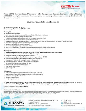 Firma ELPRO Sp. z o.o. Oddział Warszawa – jako Autoryzowane Centrum Szkoleniowe i Certyfikacyjne AUTODESK w związku z rozwojem firmy oraz poszerzaniem usług szkoleniowych poszukuje kandydatów/ki do pracy na stanowisku: Stażysta/ka ds. Szkoleń i Promocji Nr Referencyjny: P/01/W/2016 Miejsce pracy: Warszawa, ul. Mińska 63A Obowiązki: budowa bazy klientów aktywne pozyskiwanie uczestników szkoleń (telefoniczne i mailowe) przygotowywanie korespondencji seryjnej redagowanie ogłoszeń o szkoleniach na portalach internetowych kolportaż plakatów i ulotek na wyższych uczelniach organizacja i opieka nad szkoleniami (w dalszej perspektywie - uczestniczenie w wyjazdach szkoleniowych) wsparcie w przygotowaniu wydarzeń promocyjnych dbanie o utrzymanie czystości w biurze budowanie pozytywnego wizerunku Firmy bieżące raportowanie przełożonym z wykonywania powierzonych obowiązków Wymagania: statusu osoby poszukującej pracy, zarejestrowanej w Urzędzie Pracy m.st. Warszawy wykształcenie wyższe lub w trakcie studiów zaocznych doświadczenie w sprzedaży i obsłudze szkoleń bardzo dobra znajomość obsługi komputera, w tym pakietu MS Office bardzo dobra umiejętność obsługi aplikacji internetowych umiejętność budowania trwałych relacji z klientami komunikatywność, łatwość nawiązywania kontaktów skrupulatność, uparcie w dążeniu do celu gotowość do wyjazdów służbowych pozytywne nastawienie dyspozycyjność Oferujemy: pracę w Autoryzowanym Centrum Szkoleniowym Autodesk odpowiednie narzędzia pracy (komputer, telefon służbowy) zdobycie cennego doświadczenia stabilne zatrudnienie przyjazną atmosferę CV wraz z listem motywacyjnym prosimy przesyłać na adres mailowy: [email protected], podając w temacie wiadomości nr ref.: P/01/W/2016. Informujemy, że skontaktujemy się tylko z wybranymi kandydatami. Termin nadsyłania ofert: 30.07.2016 r. Prosimy o dodanie klauzuli: „Wyrażam zgodę na przetwarzanie moich danych osobowych przez firmę ELPRO Sp. z o. o. dla potrzeb niezbędnych do realizacji procesu rekrutacyjnego, zgodnie z ustawą z dnia 29.08.1997 r. o Ochronie Danych Osobowych (Dz. U. z 2002 r. Nr 1001, poz. 926 z póź. zm.). Przyjmuję do wiadomości, że przysługuje mi prawo wglądu do treści moich danych oraz ich poprawiania”.