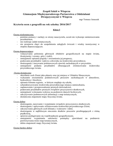 Zespół Szkół w Wieprzu Gimnazjum Międzynarodowego Partnerstwa z Oddziałami Dwujęzycznymi w Wieprzu mgr Tomasz Juraszek Kryteria ocen z geografii na rok szkolny 2016/2017 Klasa I Ocena niedostateczna: - pomimo pomocy i zachęty ze strony nauczyciela, uczeń nie wykazuje zainteresowania przedmiotem, - nie realizuje zadań tematycznych, - nie przejawia chęci do uzupełnienia zaległych ćwiczeń i wiedzy teoretycznej w stopniu dopuszczającym. Ocena dopuszczająca: - wskazywanie położenia głównych obiektów geograficznych na mapie świata, (kontynenty i oceany, góry i rzeki), - umiejętność opisania pogody i zrozumienia jej prognozy, - podawanie przykładów wpływu człowieka na środowisko przyrodnicze, - dostrzeganie i nazywanie podstawowych zjawisk zachodzących w przyrodzie, - umiejętność podania przykładów obrazujących zróżnicowanie środowiska przyrodniczego świata. Ocena dostateczna: - określanie cech Ziemi jako planety oraz jej miejsca w Układzie Słonecznym, - wykazanie zrozumienia podstawowych procesów zachodzących w atmosferze, hydrosferze i litosferze, - opisanie klimatu regionu , w którym znajduje się szkoła, - scharakteryzowanie środowiska przyrodniczego miejsca zamieszkania, - zaplanowanie i przeprowadzenie prostych doświadczeń, - podawanie przykładów prostych związków przyczynowo-skutkowych, - umiejętność wykonania wykresu na podstawie danych liczbowych, - odczytywanie podstawowych informacji z map tematycznych, - dostateczna znajomość mapy fizycznej świata. Ocena dobra: - dostrzeganie, nazywanie i wyjaśnianie związków przyczynowo-skutkowych, - dostrzeganie i opisywanie zróżnicowania środowiska przyrodniczego Ziemi, - odczytywanie głównych cech klimatu z wykresów i tabel, - dostrzeganie w najbliższym otoczeniu skutków procesów przebiegających z różną prędkością, - sprawne posługiwanie się współrzędnymi geograficznymi, - umiejętność wyjaśniania zależności pomiędzy zjawiskami na podstawie porównywania treści map tematycznych, - dobra znajomość mapy fizycznej świata. Ocena bardzo dobra: - umiejętność samodzielnego planowania i przeprowadzania obserwacji meteorologicznych i astronomicznych, bardzo dobra znajomość mapy fizycznej świata, umiejętność scharakteryzowania środowiska przyrodniczego dowolnego obszaru na podstawie map i innych źródeł, umiejętność oceny wpływu człowieka na środowisko przyrodnicze, umiejętność wyjaśniania przyczyn zróżnicowania środowiska przyrodniczego Ziemi. Ocena celująca: - uczeń posiada wiedzę i umiejętności wykraczające poza program nauczania, - biegle posługuje się wiadomościami związanymi z programem nauczania geografii w klasie I, - potrafi samodzielnie zdobywać wiedzę z różnych źródeł i korzystać z własnego doświadczenia, potrafi planować i organizować swoją pracę, - rozwiązuje samodzielnie problemy teoretyczne i praktyczne oraz wykazuje własną inicjatywę w ich rozwiązywaniu, - jego wypowiedzi są logiczne i charakteryzują się wzorowym językiem, na lekcjach jest bardzo aktywny, - bierze czynny udział w zajęciach dodatkowych związanych z przedmiotem, samodzielnie rozwija swoje zainteresowania w kierunku nauk geograficznych, - uczeń osiąga sukcesy w konkursach i olimpiadach przedmiotowych na szczeblu co najmniej powiatowym. Klasa II Ocena niedostateczna: - pomimo pomocy i zachęty ze strony nauczyciela, uczeń nie wykazuje zainteresowania przedmiotem, - nie realizuje zadań tematycznych, - nie przejawia chęci do uzupełnienia zaległych ćwiczeń i wiedzy teoretycznej w stopniu dopuszczającym. Ocena dopuszczająca: - umiejętność wyliczenia głównych problemów współczesnego świata, - ogólna orientacja w zróżnicowaniu poziomu rozwoju społeczno-gospodarczego świata - wskazanie położenia najbogatszych krajów świata na mapie politycznej, - rozumienie pojęcia integracji politycznej i gospodarczej, - wskazanie głównych celów integracji politycznej i gospodarczej. Ocena dostateczna: - umiejętność ogólnego scharakteryzowania najważniejszych problemów społecznych i gospodarczych świata, - wskazanie na mapie politycznej i gospodarczej świata oraz poszczególnych kontynentów obszarów o szybkim tempie wzrostu liczby ludności, obszarów niedoboru żywności i miejsc konfliktów zbrojnych, - odczytywanie z map tematycznych informacji o zróżnicowaniu poziomu rozwoju społeczno-gospodarczego krajów, - umiejętność wykazania znaczenia międzynarodowej wymiany towarów i informacji, wyjaśnienie pojęcia „gospodarka światowa”. umiejętność wykorzystania mapy jako źródła informacji, dostateczna znajomość map fizycznych poszczególnych kontynentów. Ocena dobra: - umiejętność podania przykładów wskazujących współzależność środowiska przyrodniczego i sposobów gospodarowania, - umiejętność dynamicznego ujmowania zjawisk na podstawie serii danych statystycznych, - umiejętność scharakteryzowania istoty i zróżnicowania przestrzennego omawianych problemów społecznych i gospodarczych, - wskazanie krajów o największym znaczeniu w gospodarce światowej. - odczytywanie z map tematycznych informacji o zróżnicowaniu poziomu rozwoju społeczno-gospodarczego krajów, - dobra znajomość map fizycznych poszczególnych kontynentów. Ocena bardzo dobra: - znajomość procesów prowadzących do globalizacji gospodarki, wskazanie krajów pełniących różną rolę w międzynarodowym podziale pracy, - dostrzeganie pozytywnych i negatywnych skutków globalizacji. - umiejętność porównywania cech społeczno-gospodarczych regionów na podstawie danych statystycznych i map, - samodzielne wyszukiwanie danych statystycznych, - umiejętność przewidywania przebiegu zjawisk w najbliższej przyszłości na podstawie analizy dynamiki zjawisk, - bardzo dobra znajomość map fizycznych poszczególnych kontynentów. Ocena celująca: - uczeń posiada wiedzę i umiejętności wyk