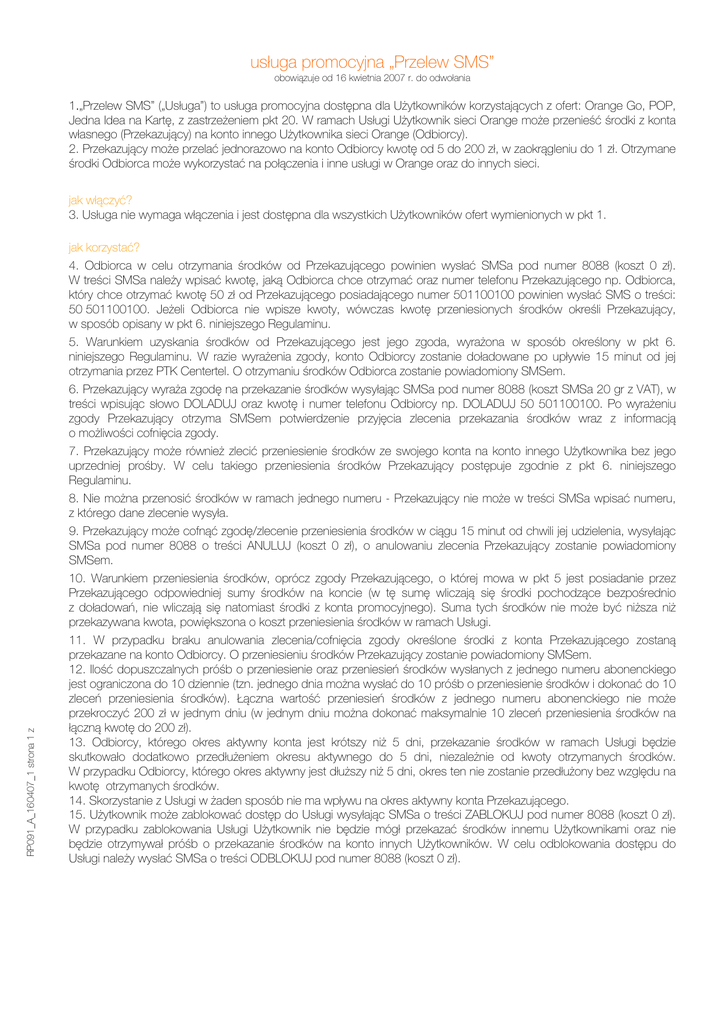 usługa promocyjna „Przelew SMS” obowiązuje od 16 kwietnia 2007 r. do odwołania 1.„Przelew SMS” („Usługa”) to usługa promocyjna dostępna dla Użytkowników korzystających z ofert: Orange Go, POP, Jedna Idea na Kartę, z zastrzeżeniem pkt 20. W ramach Usługi Użytkownik sieci Orange może przenieść środki z konta własnego (Przekazujący) na konto innego Użytkownika sieci Orange (Odbiorcy). 2. Przekazujący może przelać jednorazowo na konto Odbiorcy kwotę od 5 do 200 zł, w zaokrągleniu do 1 zł. Otrzymane środki Odbiorca może wykorzystać na połączenia i inne usługi w Orange oraz do innych sieci. RP091_A_160407_1 strona 1 z jak włączyć? 3. Usługa nie wymaga włączenia i jest dostępna dla wszystkich Użytkowników ofert wymienionych w pkt 1. jak korzystać? 4. Odbiorca w celu otrzymania środków od Przekazującego powinien wysłać SMSa pod numer 8088 (koszt 0 zł). W treści SMSa należy wpisać kwotę, jaką Odbiorca chce otrzymać oraz numer telefonu Przekazującego np. Odbiorca, który chce otrzymać kwotę 50 zł od Przekazującego posiadającego numer 501100100 powinien wysłać SMS o treści: 50 501100100. Jeżeli Odbiorca nie wpisze kwoty, wówczas kwotę przeniesionych środków określi Przekazujący, w sposób opisany w pkt 6. niniejszego Regulaminu. 5. Warunkiem uzyskania środków od Przekazującego jest jego zgoda, wyrażona w sposób określony w pkt 6. niniejszego Regulaminu. W razie wyrażenia zgody, konto Odbiorcy zostanie doładowane po upływie 15 minut od jej otrzymania przez PTK Centertel. O otrzymaniu środków Odbiorca zostanie powiadomiony SMSem. 6. Przekazujący wyraża zgodę na przekazanie środków wysyłając SMSa pod numer 8088 (koszt SMSa 20 gr z VAT), w treści wpisując słowo DOLADUJ oraz kwotę i numer telefonu Odbiorcy np. DOLADUJ 50 501100100. Po wyrażeniu zgody Przekazujący otrzyma SMSem potwierdzenie przyjęcia zlecenia przekazania środków wraz z informacją o możliwości cofnięcia zgody. 7. Przekazujący może również zlecić przeniesienie środków ze swojego konta na konto innego Użytkownika bez jego uprzedniej prośby. W celu takiego przeniesienia środków Przekazujący postępuje zgodnie z pkt 6. niniejszego Regulaminu. 8. Nie można przenosić środków w ramach jednego numeru - Przekazujący nie może w treści SMSa wpisać numeru, z którego dane zlecenie wysyła. 9. Przekazujący może cofnąć zgodę/zlecenie przeniesienia środków w ciągu 15 minut od chwili jej udzielenia, wysyłając SMSa pod numer 8088 o treści ANULUJ (koszt 0 zł), o anulowaniu zlecenia Przekazujący zostanie powiadomiony SMSem. 10. Warunkiem przeniesienia środków, oprócz zgody Przekazującego, o której mowa w pkt 5 jest posiadanie przez Przekazującego odpowiedniej sumy środków na koncie (w tę sumę wliczają się środki pochodzące bezpośrednio z doładowań, nie wliczają się natomiast środki z konta promocyjnego). Suma tych środków nie może być niższa niż przekazywana kwota, powiększona o koszt przeniesienia środków w ramach Usługi. 11. W przypadku braku anulowania zlecenia/cofnięcia zgody określone środki z konta Przekazującego zostaną przekazane na konto Odbiorcy. O przeniesieniu środków Przekazujący zostanie powiadomiony SMSem. 12. Ilość dopuszczalnych próśb o przeniesienie oraz przeniesień środków wysłanych z jednego numeru abonenckiego jest ograniczona do 10 dziennie (tzn. jednego dnia można wysłać do 10 próśb o przeniesienie środków i dokonać do 10 zleceń przeniesienia środków). Łączna wartość przeniesień środków z jednego numeru abonenckiego nie może przekroczyć 200 zł w jednym dniu (w jednym dniu można dokonać maksymalnie 10 zleceń przeniesienia środków na łączną kwotę do 200 zł). 13. Odbiorcy, którego okres aktywny konta jest krótszy niż 5 dni, przekazanie środków w ramach Usługi będzie skutkowało dodatkowo przedłużeniem okresu aktywnego do 5 dni, niezależnie od kwoty otrzymanych środków. W przypadku Odbiorcy, którego okres aktywny jest dłuższy niż 5 dni, okres ten nie zostanie przedłużony bez względu na kwotę otrzymanych środków. 14. Skorzystanie z Usługi w żaden sposób nie ma wpływu na okres aktywny konta Przekazującego. 15. Użytkownik może zablokować dostęp do Usługi wysyłając SMSa o treści ZABLOKUJ pod numer 8088 (koszt 0 zł). W przypadku zablokowania Usługi Użytkownik nie będzie mógł przekazać środków innemu Użytkownikami oraz nie będzie otrzymywał próśb o przekazanie środków na konto innych Użytkowników. W celu odblokowania dostępu do Usługi należy wysłać SMSa o treści ODBLOKUJ pod numer 8088 (koszt 0 zł). 16. Użytkownik, który ma zablokowaną Usługę może otrzymać środki od innego Użytkownika, może również wysłać do innego Użytkownika prośbę o Przelew SMS. 17. Usługa dostępna jest również w roamingu. W celu skorzystania z Usługi w roamingu należy postępować zgodnie z pkt 4 - 16. Numeru 8088 nie trzeba poprzedzać numerem kierunkowym do Polski (+48). Za korzystanie z usługi w ramach roamingu nie są pobierane żadne dodatkowe opłaty, poza opłatą wskazaną w pkt 18. niniejszego Regulaminu. RP091_A_160407_1 strona 2 ile to kosztuje? 18. Koszt przeniesienia środków w ramach Usługi wynosi 20 gr. z VAT niezależnie od wartości przekazanych środków. Koszt przeniesienia środków ponosi tylko Przekazujący. dodatkowe informacje 19. W ramach Usługi można przekazać tylko środki dostępne z doładowań konta (nie można przekazywać środków z konta promocyjnego). 20. Skorzystanie z Usługi może wiązać się z powstaniem obowiązku podatkowego, zgodnie z obowiązującymi przepisami prawa. 21. Usługa nie łączy się z promocjami: Gwarancja Zwrotu, Więcej na konto, StartPOP SMSY na Okrągło oraz innymi usługami (w tym promocjami doładowań), chyba, że ich regulaminy stanowią inaczej. W przypadku, gdy Klient, który skorzystał z usługi