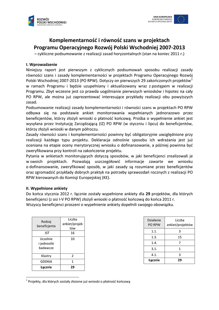 Komplementarność i równość szans w projektach Programu Operacyjnego Rozwój Polski Wschodniej 2007‐2013 – cykliczne podsumowanie z realizacji zasad horyzontalnych (stan na koniec 2011 r.) I. Wprowadzenie Niniejszy raport jest pierwszym z cyklicznych podsumowań sposobu realizacji zasady równości szans i zasady komplementarności w projektach Programu Operacyjnego Rozwój Polski Wschodniej 2007‐2013 (PO RPW). Dotyczy on pierwszych 29 zakończonych projektów 1 w ramach Programu i będzie uzupełniany i aktualizowany wraz z postępem w realizacji Programu. Zbyt wczesne jest co prawda uogólnianie pierwszych wniosków i hipotez na cały PO RPW, ale można już zaprezentować interesujące przykłady realizacji obu powyższych zasad. Podsumowanie realizacji zasady komplementarności i równości szans w projektach PO RPW odbywa się na podstawie ankiet monitorowania wypełnianych jednorazowo przez beneficjentów, którzy złożyli wnioski o płatność końcową. Prośba o wypełnienie ankiet jest wysyłana przez Instytucję Zarządzającą (IZ) PO RPW (w styczniu i lipcu) do beneficjentów, którzy złożyli wnioski w danym półroczu. Zasady równości szans i komplementarności powinny być obligatoryjnie uwzględnione przy realizacji każdego typu projektu. Deklaracja odnośnie sposobu ich wdrażania jest już oceniana na etapie oceny merytorycznej wniosku o dofinansowanie, a później powinna być zweryfikowana przy kontroli na zakończenie projektu. Pytania w ankietach monitorujących dotyczą sposobów, w jaki beneficjenci zrealizowali je w swoich projektach. Pozwalają uszczegółowić informacje zawarte we wniosku o dofinansowanie, zweryfikować sposób, w jaki zasady są rozumiane przez beneficjentów oraz zgromadzić przykłady dobrych praktyk na potrzeby sprawozdań rocznych z realizacji PO RPW kierowanych do Komisji Europejskiej (KE). II. Wypełnione ankiety Do końca stycznia 2012 r. łącznie zostały wypełnione ankiety dla 29 projektów, dla których beneficjenci (z osi I‐V PO RPW) złożyli wnioski o płatność końcową do końca 2011 r. Wszyscy beneficjenci proszeni o wypełnienie ankiety dopełnili swojego obowiązku. Liczba Liczba Działanie Rodzaj beneficjenta JST 1