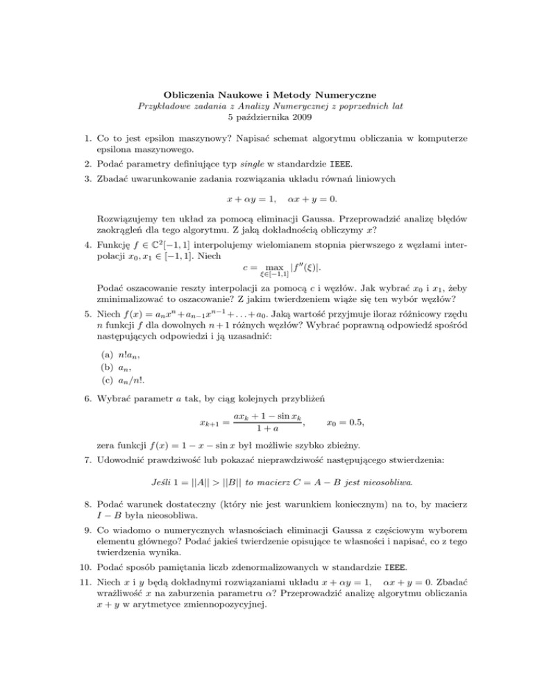 Obliczenia Naukowe i Metody Numeryczne Przykładowe zadania z