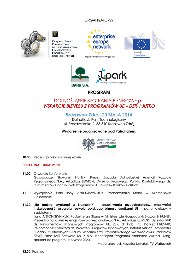 ORGANIZATORZY PROGRAM DOLNOŚLĄSKIE SPOTKANIA BIZNESOWE pt. WSPARCIE BIZNESU Z PROGRAMÓW UE – DZIŚ I JUTRO Szczawno-Zdrój, 20 MAJA 2014 Dolnośląski Park Technologiczny ul. Szczawieńska 2, 58-310 Szczawno-Zdrój Wydarzenie organizowane pod Patronatem: 10.00: Recepcja przy porannej kawie BLOK I. INAUGURACYJNY 11.00: Otwarcie konferencji: Gospodarze: Sławomir HUNEK, Prezes Zarządu Dolnośląskiej Agencji Rozwoju Regionalnego S.A., Arkadiusz LEWICKI, Dyrektor Krajowego Punktu Kontaktowego ds. Instrumentów Finansowych Programów UE, Związek Banków Polskich 11.10: Wystąpienie Gospodarki. Pani Ilony ANTONISZYN-KLIK, Podsekretarza Stanu w Ministerstwie 11.30: „Ile można wycisnąć z Brukselki?” – oczekiwania przedsiębiorców, możliwości i skuteczność wsparcia rozwoju polskiego biznesu środkami UE – panel dyskusyjny z udziałem: Ilona ANTONISZYN-KLIK, Podsekretarz Stanu w Ministerstwie Gospodarki; Sławomir HUNEK, Prezes Dolnośląskiej Agencji Rozwoju Regionalnego S.A.; Arkadiusz LEWICKI, Dyrektor KPK ds. Instrumentów Finansowych Programów UE, ZBP; dr hab. inż. Dariusz HRENIAK, Pełnomocnik Dyrektora ds. Wdrożeń i Projektów Badawczych, Instytut Niskich Temperatur i Badań Strukturalnych PAN im. Włodzimierza Trzebiatowskiego we Wrocławiu; Radosław SZMIT, firma SMT Software Sp. z o.o., beneficjent Programu Ambieted Assited Living, aplikant do programu Horyzont 2020 Moderator: red. Krzysztof Szwałek, TV Wałbrzych 12.30: Przerwa BLOK II. WSPARCIE DLA PRZEDSIĘBIORCÓW W RAMACH PROGRAMÓW 2007-2013 12.45: Gdzie przedsiębiorca może szukać jeszcze wsparcia w ramach programów 2007-2013? 12:45: Aktualne wsparcie pozafinansowe dla przedsiębiorców w ramach sieci Enterprise Europe Network, Tomasz CHARKOT, Konsultant Enterprise Europe Network, DARR S.A. 13.00: Mapa dostępnego wsparcia dla przedsiębiorców z programów ramowych UE, Michał GORZELAK, Krajowy Punkt Kontaktowy ds. Instrumentów Finansowych Programów UE, Związek Banków Polskich 13.15: Giełda Instrumentów Programów UE – preferencyjne kredyty, pożyczki, gwarancje, poręczenia: prezentacje wybranych Narodowych Pośredników Finansowych 14.15: Sesja pytań i odpowiedzi 14.30: Przerwa i indywidualne przedsiębiorcami. sesje match-makingowe NPF z zainteresowanymi BLOK III. WSPARCIE DLA PRZEDSIĘBIORCÓW W RAMACH NOWEJ PERSPEKTYWY FINANSOWEJ UE 14.50: Wsparcie dla przedsiębiorców w ramach nowych programów operacyjnych 2014-2020: Marek URBAŃSKI, Lokalny Punkt Konsultacyjny dla MŚP, DARR S.A. 15.10: Wsparcie dla przedsiębiorców w programach Unii Europejskiej 2014-2020: COSME, HORYZONT 2020, KREATYWNA EUROPA, EASI: 15.10: COSME i Horyzont 2020: Karolina SOBOCIŃSKA, Konsultant Enterprise Europe Network, DARR 15.35: Instrumenty Finansowe: Michał GORZELAK, Krajowy Punkt Kontaktowy ds. Instrumentów Finansowych Programów UE, Związek Banków Polskich 15.50: Sesja pytań i odpowiedzi 16.05: Podsumowanie i zakończenie konferencji – Patron oraz Gospodarze: Ilona ANTONISZYN-KLIK, Podsekretarz Stanu w Ministerstwie Gospodarki, Sławomir HUNEK, Prezes Zarządu Dolnośląskiej Agencji Rozwoju Regionalnego S.A. oraz Arkadiusz LEWICKI, Dyrektor KPK ds. Instrumentów Finansowych Programów UE, ZBP 16.15: Lunch, losowanie nagród oraz indywidualne sesje match-makingowe Narodowych Pośredników Finansowych z zainteresowanymi przedsiębiorcami Udział w konferencji jest bezpłatny WIĘCEJ INFORMACJI NA: WWW.KPK.INFO.PL ORAZ WWW.DARR.PL Przedsięwzięcie finansowane ze środków Unii Europejskiej w ramach Programu ramowego na rzecz konkurencyjności i innowacji na lata 2007-2013 oraz z budżetu państwa w ramach Programu Wieloletniego na rzecz udziału Polski w Programie ramowym na rzecz konkurencyjności i innowacji w latach 2008-2014