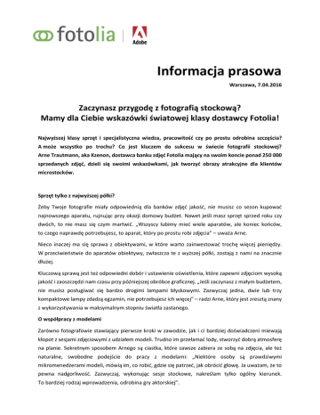Informacja prasowa Warszawa, 7.04.2016 Zaczynasz przygodę z fotografią stockową? Mamy dla Ciebie wskazówki światowej klasy dostawcy Fotolia! Najwyższej klasy sprzęt i specjalistyczna wiedza, pracowitość czy po prostu odrobina szczęścia? A może wszystko po trochu? Co jest kluczem do sukcesu w świecie fotografii stockowej? Arne Trautmann, aka Kzenon, dostawca banku zdjęć Fotolia mający na swoim koncie ponad 250 000 sprzedanych zdjęć, dzieli się swoimi wskazówkami, jak tworzyć obrazy atrakcyjne dla klientów microstocków. Sprzęt tylko z najwyższej półki? Żeby Twoje fotografie miały odpowiednią dla banków zdjęć jakość, nie musisz co sezon kupować najnowszego aparatu, rujnując przy okazji domowy budżet. Nawet jeśli masz sprzęt sprzed roku czy dwóch, to nie masz się czym martwić. „Wszyscy lubimy mieć wiele aparatów, ale koniec końców, to czego naprawdę potrzebujesz, to aparat, który po prostu robi zdjęcia” – uważa Arne. Nieco inaczej ma się sprawa z obiektywami, w które warto zainwestować trochę więcej pieniędzy. W przeciwieństwie do aparatów obiektywy, zwłaszcza te z wyższej półki, zostają z nami na znacznie dłużej. Kluczową sprawą jest też odpowiedni dobór i ustawienie oświetlenia, które zapewni zdjęciom wysoką jakość i zaoszczędzi nam czasu przy późniejszej obróbce graficznej. „Jeśli zaczynasz z małym budżetem, nie musisz posługiwać się bardzo drogimi lampami błyskowymi. Zazwyczaj jedna, dwie lub trzy kompaktowe lampy zdadzą egzamin, nie potrzebujesz ich więcej” – radzi Arne, który jest zresztą znany z wykorzystywania w maksymalnym stopniu światła zastanego. O współpracy z modelami Zarówno fotografowie stawiający pierwsze kroki w zawodzie, jak i ci bardziej doświadczeni miewają kłopot z sesjami zdjęciowymi z udziałem modeli. Trudno im przełamać lody, stworzyć dobrą atmosferę na planie. Sekretnym sposobem Arnego są ciastka, które zawsze zabiera ze sobą na zdjęcia, ale też naturalne, swobodne podejście do pracy z modelami: „Niektóre osoby są prawdziwymi mikromenedżerami modeli, mówią im, co robić, gdzie się patrzeć, jak obrócić głowę. Ja uważam, że to pewna nadgorliwość. Zazwyczaj, wykonując sesje stockowe, nakreślam tylko ogólny kierunek. To bardziej rodzaj wprowadzenia, odrobina gry aktorskiej”. Wybrane zdjęcia dostawców banku zdjęć Fotolia uczestniczących w warsztatach fotograficznych prowadzonych przez Arnego Trautmanna w Warszawie To coś Fotografia stockowa to nie tylko dobre wyposażenie i poprawnie przygotowany plan zdjęciowy. To wszystko ważne, ale pamiętaj, że nie zostaniesz zauważony i doceniony przez klientów microstocków, jeśli Twoje zdjęcia będą bez charakteru, pozbawione „tego czegoś”. Arne radzi więc: „BĄDŹ SOBĄ! BĄDŹ SOBĄ! Stwórz swój własny styl, baw się, eksperymentuj, każdego dnia próbuj czegoś nowego. Nie ma niczego złego w inspirowaniu się innymi, ale nie próbuj być kimś innym. Bądź sobą, rób swoje zdjęcia. Rynek zdjęć stockowych jest globalny. Są tam osoby, które polubią Twój styl, o ile tylko rozwiniesz swój unikatowy styl – obrazy, które będą Cię wyrażać, przez które będziesz przemawiać. To jest naprawdę ważne: stworzenie swojego znaku rozpoznawczego. Gdy ci się to uda, będziesz odnosić sukcesy”. Więcej wskazówek Arnego Trautmanna w formie poradnika wideo znajdziesz tutaj. W marcu 2016 r. Arne odwiedził Polskę, by przeprowadzić dla dostawców banku zdjęć Fotolia warsztaty fotograficzne. Relacje uczestników warsztatów możesz obejrzeć tutaj, a galerię stworzonych przez nich zdjęć – tutaj. Arne Trautmann (aka Kzenon) jest dostawcą banku zdjęć Fotolia o rubinowym rankingu, co oznacza, że sprzedał już ponad 250 000 zdjęć. Szkoli fotografów na całym świecie. Oprócz tego, że profesjonalnie zajmuje się fotografią stockową, jest też prawnikiem i uznanym ekspertem z zakresu prawa autorskiego. O serwisie Fotolia Fotolia jest liderem wśród dostawców zdjęć stockowych w Europie. Oferuje ponad 50 mln obrazów, grafik wektorowych oraz plików wideo dostępnych na licencji royalty-free. Założony w 2004 r., serwis Fotolia dostarcza profesjonalne, wysokiej jakości oraz łatwo dostępne obrazy, których cena zaczyna się od 0,54 zł za pojedynczy obraz. Pliki są wolne od ograniczeń czasowych i geograficznych. Jako międzynarodowy dostawca serwis Fotolia oferuje najwyższej jakości obrazy różnorodnym klientom – zarówno dużym agencjom kreatywnym, prasie oraz wydawnictwom, jak i małym jednoosobowym firmom. Od stycznia 2015 r. Fotolia jest częścią rodziny Adobe. Więcej informacji można uzyskać pod adresem pl.fotolia.com lub na portalach: Facebook, Twitter, Google+ oraz na blogu Fotolia.