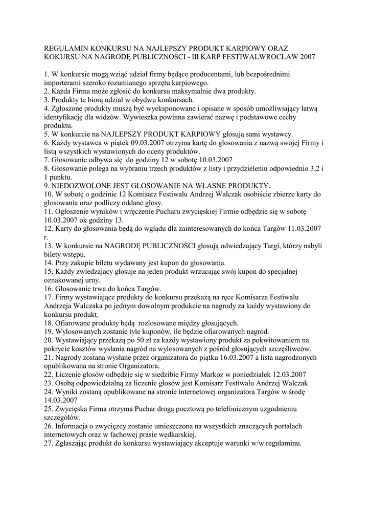 REGULAMIN KONKURSU NA NAJLEPSZY PRODUKT KARPIOWY ORAZ KOKURSU NA NAGRODĘ PUBLICZNOŚCI - III KARP FESTIWALWROCŁAW 2007 1. W konkursie mogą wziąć udział firmy będące producentami, lub bezpośrednimi importerami szeroko rozumianego sprzętu karpiowego. 2. Każda Firma może zgłosić do konkursu maksymalnie dwa produkty. 3. Produkty te biorą udział w obydwu konkursach. 4. Zgłoszone produkty muszą być wyeksponowane i opisane w sposób umożliwiający łatwą identyfikację dla widzów. Wywieszka powinna zawierać nazwę i podstawowe cechy produktu. 5. W konkurcie na NAJLEPSZY PRODUKT KARPIOWY głosują sami wystawcy. 6. Każdy wystawca w piątek 09.03.2007 otrzyma kartę do głosowania z nazwą swojej Firmy i listą wszystkich wystawionych do oceny produktów. 7. Głosowanie odbywa się do godziny 12 w sobotę 10.03.2007 8. Głosowanie polega na wybraniu trzech produktów z listy i przydzieleniu odpowiednio 3,2 i 1 punktu. 9. NIEDOZWOLONE JEST GŁOSOWANIE NA WŁASNE PRODUKTY. 10. W sobotę o godzinie 12 Komisarz Festiwalu Andrzej Walczak osobiście zbierze karty do głosowania oraz podliczy oddane głosy. 11. Ogłoszenie wyników i wręczenie Pucharu zwycięskiej Firmie odbędzie się w sobotę 10.03.2007 ok godziny 13. 12. Karty do głosowania będą do wglądu dla zainteresowanych do końca Targów 11.03.2007 r. 13. W konkursie na NAGRODĘ PUBLICZNOŚCI głosują odwiedzający Targi, którzy nabyli bilety wstępu. 14. Przy zakupie biletu wydawany jest kupon do głosowania. 15. Każdy zwiedzający głosuje na jeden produkt wrzucając swój kupon do specjalnej oznakowanej urny. 16. Głosowanie trwa do końca Targów. 17. Firmy wystawiające produkty do konkursu przekażą na ręce Komisarza Festiwalu Andrzeja Walczaka po jednym dowolnym produkcie na nagrody za każdy wystawiony do konkursu produkt. 18. Ofiarowane produkty będą rozlosowane między głosujących. 19. Wylosowanych zostanie tyle kuponów, ile będzie ofiarowanych nagród. 20. Wystawiający przekażą po 50 zł za każdy wystawiony produkt za pokwitowaniem na pokrycie kosztów wysłania nagród na wylosowanych z pośród głosujących szczęśliwców. 21. Nagrody zostaną wysłane przez organizatora do piątku 16.03.2007 a lista nagrodzonych opublikowana na stronie Organizatora. 22. Liczenie głosów odbędzie się w siedzibie Firmy Markoz w poniedziałek 12.03.2007 23. Osobą odpowiedzialną za liczenie głosów jest Komisarz Festiwalu Andrzej Walczak 24. Wyniki zostaną opublikowane na stronie internetowej organizatora Targów w środę 14.03.2007 25. Zwycięska Firma otrzyma Puchar drogą pocztową po telefonicznym uzgodnieniu szczegółów. 26. Informacja o zwycięzcy zostanie umieszczona na wszystkich znaczących portalach internetowych oraz w fachowej prasie wędkarskiej. 27. Zgłaszając produkt do konkursu wystawiający akceptuje warunki w/w regulaminu.
