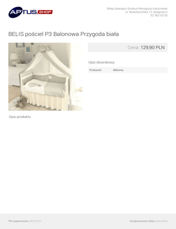 Sklep dziecięcy Smykuś Remigiusz Kaczmarek ul. Nowotoruńska 12, Bydgoszcz 52 362 02 63 BELIS pościel P3 Balonowa Przygoda biała Cena: 129,90 PLN Opis słownikowy Producent Belisima Opis produktu Plik wygenerowano: 08-03-2017 Powered by TCPDF (www.tcpdf.org) Oprogramowanie sklepu: AptusShop