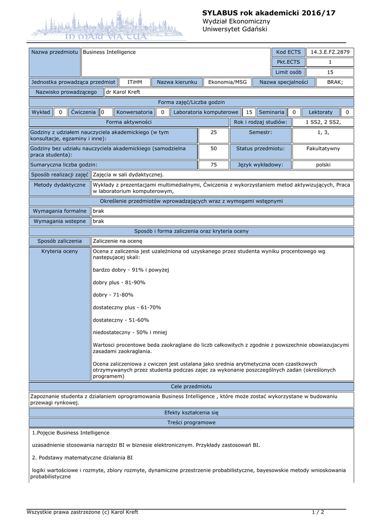 SYLABUS rok akademicki 2016/17 Wydział Ekonomiczny Uniwersytet Gdański Nazwa przedmiotu Business Intelligence Jednostka prowadząca przedmiot Nazwisko prowadzącego ITiHM Nazwa kierunku Ekonomia/MSG Kod ECTS 14.3.E.FZ.2879 Pkt.ECTS 1 Limit osób 15 Nazwa specjalności BRAK; dr Karol Kreft Forma zajęć/Liczba godzin Wykład 0 Ćwiczenia 0 Konwersatoria 0 Laboratoria komputerowe Forma aktywności 15 Seminaria 0 Lektoraty Rok i rodzaj studiów: 1 SS2, 2 SS2, Godziny z udziałem nauczyciela akademickiego (w tym konsultacje, egzaminy i inne): 25 Semestr: 1, 3, Godziny bez udziału nauczyciela akademickiego (samodzielna praca studenta): 50 Status przedmiotu: Fakultatywny Sumaryczna liczba godzin: 75 Język wykładowy: polski 0 Sposób realizacji zajęć Zajęcia w sali dydaktycznej. Metody dydaktyczne Wykłady z prezentacjami multimedialnymi, Ćwiczenia z wykorzystaniem metod aktywizujących, Praca w laboratorium komputerowym, Określenie przedmiotów wprowadzających wraz z wymogami wstępnymi Wymagania formalne brak Wymagania wstepne brak Sposób i forma zaliczenia oraz kryteria oceny Sposób zaliczenia Kryteria oceny Zaliczenie na ocenę Ocena z zaliczenia jest uzależniona od uzyskanego przez studenta wyniku procentowego wg nastepujacej skali: bardzo dobry - 91% i powyżej dobry plus - 81-90% dobry - 71-80% dostateczny plus - 61-70% dostateczny - 51-60% niedostateczny - 50% i mniej Wartosci procentowe beda zaokraglane do liczb całkowitych z zgodnie z powszechnie obowiazujacymi zasadami zaokraglania. Ocena zaliczeniowa z cwiczen jest ustalana jako srednia arytmetyczna ocen czastkowych otrzymywanych przez studenta podczas zajec za wykonanie poszczególnych zadan (określonych programem) Cele przedmiotu Zapoznanie studenta z działaniem oprogramowania Business Intelligence , które może zostać wykorzystane w budowaniu przewagi rynkowej. Efekty kształcenia się Treści programowe 1.Pojęcie Business Intelligence uzasadnienie stosowania narzędzi BI w biznesie elektronicznym. Przykłady zastosowań BI. 2. Podstawy matematyczne działania BI logiki wartościowe i rozmyte, zbiory rozmyte, dynamiczne przestrzenie probabilistyczne, bayesowskie metody wnioskowania probabilistyczne Wszystkie prawa zastrzeżone (c) Karol Kreft 1/2 SYLABUS rok akademicki 2016/17 Wydział Ekonomiczny Uniwersytet Gdański 3.Prezentacja oprogramowania BI na przykładzie Statistica Neural Networks PL, SPHINX Pakiet Sztucznej Inteligencji 4. Zasada budowy narzędzi BI dokumentacja projektowa, fazy projektowe, struktura danych 5. Praktyczna optymalizacja wybranego przez studentów BI metody pozyskiwania danych do narzędzi BI, przygotowanie danych do oprogramowania BI 6. Budowa modelu BI stworzenie aplikacji do przetworzenia zgromadzonych danych 7. Przeprowadzenie badania na przygotowanym modelu wnioski końcowe Wykaz literatury podstawowej i uzupełniającej Stasieńsko J., Technologie Business Intelligence w procesie podejmowania decyzji, Roczniki Kolegium Analiz Ekonomicznych / Szkoła Główna Handlowa, nr 19, Warszawa 2009 Business Intelligence: An Analysis of the Literature, Information Systems Management Volume 25, Issue 2, 2008 Kasperski M., Sztuczna Inteligencja, Wydawnictwo Helikon, Gliwice 2007 Rutkowska D., Pilinski M., Rutkowski L., Sieci neuronowe, algorytmy genetyczne i systemy rozmyte, Wydawnictwo Naukowe PWN, Warszawa 2012 Januszewski A.: Funkcjonalność Informatycznych Systemów Zarządzania, t.2 Systemy Business Intelligence, PWN, Warszawa 2008 Łotewski S.: Razem z biznesem. Raport Specjalny Business Intelligence, ComputerWorld nr 09/848 2009 Kontakt , Wszystkie prawa zastrzeżone (c) Karol Kreft 2/2