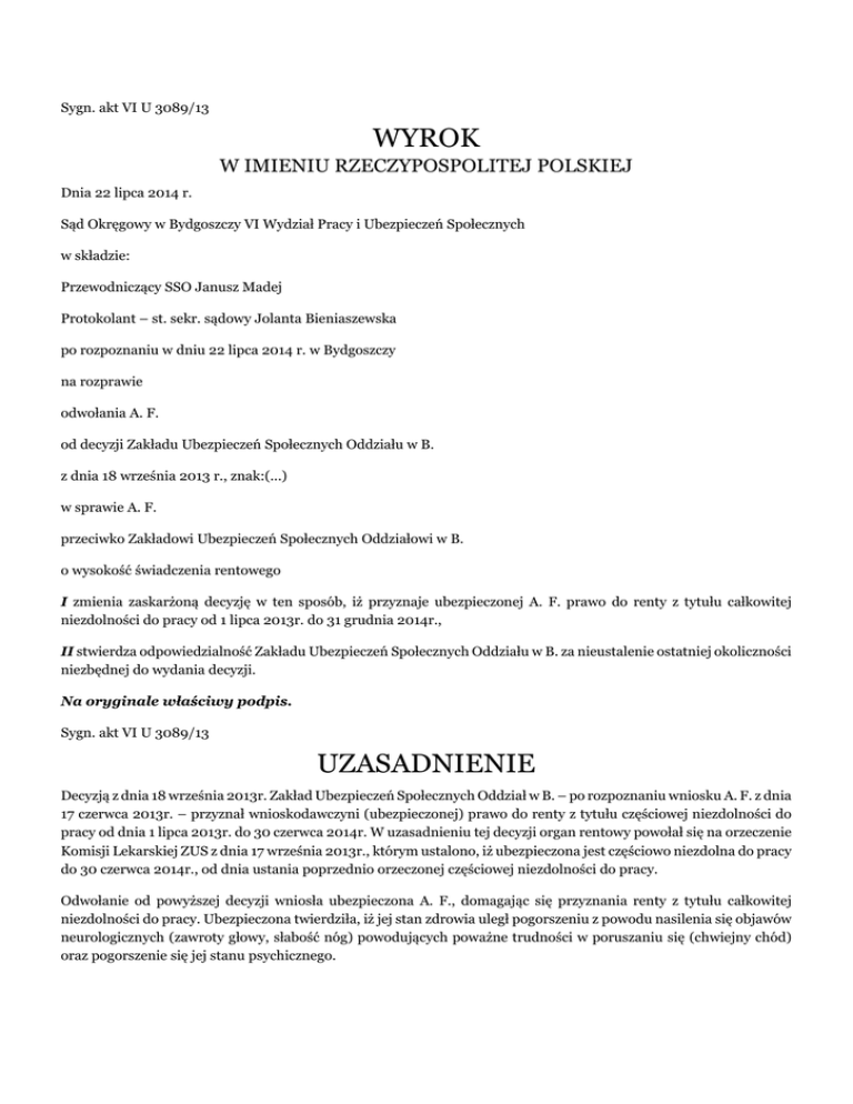 Sygn. akt VI U 3089/13 WYROK W IMIENIU RZECZYPOSPOLITEJ POLSKIEJ Dnia 22 lipca 2014 r. Sąd Okręgowy w Bydgoszczy VI Wydział Pracy i Ubezpieczeń Społecznych w składzie: Przewodniczący SSO Janusz Madej Protokolant – st. sekr. sądowy Jolanta Bieniaszewska po rozpoznaniu w dniu 22 lipca 2014 r. w Bydgoszczy na rozprawie odwołania A. F. od decyzji Zakładu Ubezpieczeń Społecznych Oddziału w B. z dnia 18 września 2013 r., znak:(...) w sprawie A. F. przeciwko Zakładowi Ubezpieczeń Społecznych Oddziałowi w B. o wysokość świadczenia rentowego I zmienia zaskarżoną decyzję w ten sposób, iż przyznaje ubezpieczonej A. F. prawo do renty z tytułu całkowitej niezdolności do pracy od 1 lipca 2013r. do 31 grudnia 2014r., II stwierdza odpowiedzialność Zakładu Ubezpieczeń Społecznych Oddziału w B. za nieustalenie ostatniej okoliczności niezbędnej do wydania decyzji. Na oryginale właściwy podpis. Sygn. akt VI U 3089/13 UZASADNIENIE Decyzją z dnia 18 września 2013r. Zakład Ubezpieczeń Społecznych Oddział w B. – po rozpoznaniu wniosku A. F. z dnia 17 czerwca 2013r. – przyznał wnioskodawczyni (ubezpieczonej) prawo do renty z tytułu częściowej niezdolności do pracy od dnia 1 lipca 2013r. do 30 czerwca 2014r. W uzasadnieniu tej decyzji organ rentowy powołał się na orzeczenie Komisji Lekarskiej ZUS z dnia 17 września 2013r., którym ustalono, iż ubezpieczona jest częściowo niezdolna do pracy do 30 czerwca 2014r., od dnia ustania poprzednio orzeczonej częściowej niezdolności do pracy. Odwołanie od powyższej decyzji wniosła ubezpieczona A. F., domagając się przyznania renty z tytułu całkowitej niezdolności do pracy. Ubezpieczona twierdziła, iż jej stan zdrowia uległ pogorszeniu z powodu nasilenia się objawów neurologicznych (zawroty głowy, słabość nóg) powodujących poważne trudności w poruszaniu się (chwiejny chód) oraz pogorszenie się jej stanu psychicznego. Organ rentowy wniósł o oddalenie odwołania powołując argumentację przedstawioną w uzasadnieniu zaskarżonej decyzji. Sąd Okręgowy ustalił i rozważył , co następuje: Ubezpieczona A. F. (urodz. (...)) do dnia 30 czerwca 2013r. uprawniona była do renty z tytułu częściowej niezdolności do pracy. Orzeczeniem z dnia 17 września 2013r. Komisja Lekarska ZUS ustaliła, iż ubezpieczona jest nadal częściowo niezdolna do pracy do 30 czerwca 2014r. Zaskarżona decyzja opierała się na tym orzeczeniu Komisji Lekarskiej ZUS (okoliczności niesporne, potwierdzone dowodami z dokumentów zebranych w aktach rentowych). W celu zweryfikowania stanowiska organu rentowego Sąd dopuścił dowód z opinii zespołu biegłych sądowych w składzie: specjalista medycyny przemysłowej, specjalista onkolog-radioterapeuta, specjalista neurolog, specjalista psycholog kliniczny i specjalista psychiatra. Biegli sądowi rozpoznali u ubezpieczonej: 1) niedostateczność krążenia mózgowego pod postacią nasilonego zespołu móżdżkowego; 2) zmiany zwyrodnieniowe kręgosłupa szyjnego z zespołem bólowym szyjnym; 3) przebyty uraz kręgosłupa C leczony operacyjnie; 4) rak piersi lewej, leczony operacyjnie i chemioterapią w 1999r.; rekonstrukcja piersi przeszczepem płata skórnego, powikłana infekcją zapalną z rozległą blizną po pobraniu płata skórnego (2013r.); 5) zaburzenia depresyjne nawracające. W ocenie opiniujących biegłych w stanie zdrowia badanej nastąpiło istotne pogorszenie ze strony centralnego układu nerwowego. Aktualnie obserwuje się nasilenie zespołu móżdżkowego pod postacią bólów, zawrotów głowy, trudności w chodzeniu, częste upadki, a próba palec - kolano jest obustronnie wybitnie dodatnia. W czasie próby Romberga ubezpieczona chwieje się do tyłu i z tego powodu była leczona szpitalnie. W 2013r. wykonano u niej rekonstrukcje piersi, leczonej operacyjnie z powodu raka. Zdaniem biegłych sądowych badana aktualnie jest całkowicie niezdolna do pracy od 1 lipca 2013r. do 31 grudnia 2014r., a powodem tej całkowitej niezdolności do pracy jest niedostateczność krążenia mózgowego. Biegli sądowi nie zgodzili się z opinią Komisji Lekarskiej ZUS z dnia 17 września 2013r. co do stopnia niezdolności do pracy i czasu jej trwania. Dodatkowo wyjaśnili oni, iż posługiwali się tymi samymi wynikami badań i konsultacji, które posiadali lekarza ZUS oraz dodatkowymi wynikami szpitalnymi dostarczonymi przez badaną, których nie posiadali lekarze ZUS. (protokół badań sądowo- lekarskich i orzeczenie lekarskie z dnia 18.03.2014r. – k. 17 i 18 akt sprawy). Organ rentowy nie wniósł zastrzeżeń do powyższej opinii i w związku z tym wniósł o zmianę zaskarżonej decyzji poprzez przyznanie ubezpieczonej prawa do renty, zgodnie z opinią powołanego w sprawie zespołu biegłych sądowych. (pismo procesowe pełnomocnika ZUS – k. 33). Ubezpieczona wniosła na rozprawie o zmianę zaskarżonej decyzji i przyznanie jej prawa do renty z tytułu całkowitej niezdolności do pracy, zgodnie z opinią powołanego w sprawie zespołu biegłych. ( e-protokół rozprawy k. 42v.). Zgodnie z art. 57 ust. 1 i 2 ustawy z dnia 17.12.1998r. o emeryturach i rentach z FUS ( t.j. Dz. U. z 2013r. poz. 1440 ze zm.) renta z tytułu niezdolności do pracy przysługuje ubezpieczonemu, który spełnia łącznie następujące warunki: 1) jest niezdolny do pracy, 2) ma wymagany okres składkowy i nieskładkowy, 3) niezdolność do pracy powstała w okresach wskazanych w ustawie, albo nie później niż w ciągu 18 miesięcy od ustania tych okresów. Przepisu ust. 1 pkt 3 nie stosuje się do ubezpieczonego, który udowodnił okres składkowy i nieskładkowy wynoszący, co najmniej 20 lat dla kobiety lub 25 lat dla mężczyzny oraz jest całkowicie niezdolny do pracy. Przy czym w myśl art. 12 wspomnianej wyżej ustawy - niezdolną do pracy jest osoba, która całkowicie lub częściowo utraciła zdolność do pracy zarobkowej z powodu naruszenia sprawności organiz