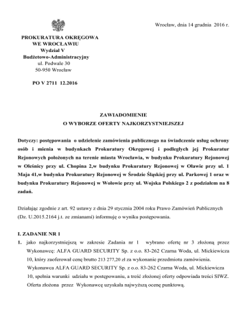 Wrocław, dnia 14 grudnia 2016 r. PROKURATURA OKRĘGOWA WE WROCŁAWIU Wydział V Budżetowo-Administracyjny ul. Podwale 30 50-950 Wrocław PO V 2711 12.2016 ZAWIADOMIENIE O WYBORZE OFERTY NAJKORZYSTNIEJSZEJ Dotyczy: postępowania o udzielenie zamówienia publicznego na świadczenie usług ochrony osób i mienia w budynkach Prokuratury Okręgowej i podległych jej Prokuratur Rejonowych położonych na terenie miasta Wrocławia, w budynku Prokuratury Rejonowej w Oleśnicy przy ul. Chopina 2,w budynku Prokuratury Rejonowej w Oławie przy ul. 1 Maja 41,w budynku Prokuratury Rejonowej w Środzie Śląskiej przy ul. Parkowej 1 oraz w budynku Prokuratury Rejonowej w Wołowie przy ul. Wojska Polskiego 2 z podziałem na 8 zadań. Działając zgodnie z art. 92 ustawy z dnia 29 stycznia 2004 roku Prawo Zamówień Publicznych (Dz. U.2015.2164 j.t. ze zmianami) informuję o wyniku postępowania. I. ZADANIE NR 1 1. jako najkorzystniejszą w zakresie Zadania nr 1 wybrano ofertę nr 3 złożoną przez Wykonawcę: ALFA GUARD SECURITY Sp. z o.o. 83-262 Czarna Woda, ul. Mickiewicza 10, który zaoferował cenę brutto 213 277,20 zł za wykonanie przedmiotu zamówienia. Wykonawca ALFA GUARD SECURITY Sp. z o.o. 83-262 Czarna Woda, ul. Mickiewicza 10, spełnia warunki udziału w postępowaniu, a treść złożonej oferty odpowiada treści SIWZ. Oferta złożona przez Wykonawcę uzyskała najwyższą ocenę punktową. Jednocześnie przedstawiam streszczenie ocen i porównanie złożonych ofert: liczba punktów w kryterium Cena 100% Nr Nazwa i adres Wykonawcy oferty 3. 4. 5. 6. ALFA GUARD SECURITY 83-262 Czarna Woda ul. Mickiewicza 10 100,00 Konsorcjum: Lider: Impel Security Polska Sp. z o.o. ul. Ślężna 118 53-111 Wrocław Partner: Impel Provider Security Partner Sp. z o.o. Sp. k. ul. Ślężna 118 53-111 Wrocław Partner: ISP Security Partner Sp. z o.o. Sp.k. ul. Ślężna 118 53-111 Wrocław Partner: IPSP Security Partner Sp. z o.o. Sp.k. ul. Ślężna 118 53-111 Wrocław Partner: Impel Monitoring Sp. z o.o. Sp.k. ul. Ślężna 118 53-111 Wrocław ITM Poland S.A. ul. Kostrzyńska 3 65-127 Zielona Góra Konsorcjum: Lider: PROTECTOR SERVICE Sp. z o.o. 60-461 Poznań ul. Wergiliusza 42 Partner: Biuro Ochrony VIGOR Sp. z o.o. ul. Starołęcka 18 61-361 Poznań Konsorcjum: Lider: WOLF Służba Ochrony Sp. z o.o. Pl. Orląt Lwowskich 2 53-605 Wrocław Partner: WOLF II Służba Ochrony Sp. z o.o. ul. Hetm. Stanisława Żółkiewskiego 4 38-400 Krosno 62,67 80,33 81,68 7. MAKROPOL Sp. z o.o. 60-821 Poznań ul. Zacisze 8 62,51 8. Konsorcjum: Lider: SILEZJAN EKO Sp. z o.o. ul. Buforowa 2 52-131 Wrocław 62,28 2 Partner: SILEZJAN SYSTEM SECURITY Biuro Ochrony Mienia Sp. z o.o. ul. Buforowa 2 52-131 Wrocław 9. Agencja Usługowa KRYZA – PROLEX ZARZYCKI Sp. jawna 50-079 Wrocław ul. Ruska 34 61,09 II. ZADANIE NR 4 1. jako najkorzystniejszą w zakresie Zadania nr 4 wybrano ofertę nr 3 złożoną przez Wykonawcę: ALFA GUARD SECURITY Sp. z o.o. 83-262 Czarna Woda, ul. Mickiewicza 10, który zaoferował cenę brutto 106 638,60 zł za wykonanie przedmiotu zamówienia. Wykonawca ALFA GUARD SECURITY Sp. z o.o. 83-262 Czarna Woda, ul. Mickiewicza 10, spełnia warunki udziału w postępowaniu, a treść złożonej oferty odpowiada treści SIWZ. Oferta złożona przez Wykonawcę uzyskała najwyższą ocenę punktową. Jednocześnie przedstawiam streszczenie ocen i porównanie złożonych ofert: Nr oferty Nazwa i adres Wykonawcy liczba punktów w kryterium Cena 100% 3. ALFA GUARD SECURITY 83-262 Czarna Woda ul. Mickiewicza 10 100,00 4. Konsorcjum: Lider: Impel Security Polska Sp. z o.o. ul. Ślężna 118 53-111 Wrocław Partner: Impel Provider Security Partner Sp. z o.o. Sp. k. ul. Ślężna 118 53-111 Wrocław Partner: ISP Security Partner Sp. z o.o. Sp.k. ul. Ślężna 118 53-111 Wrocław Partner: IPSP Security Partner Sp. z o.o. Sp.k. ul. Ślężna 118 53-111 Wrocław Partner: Impel Monitoring Sp. z o.o. Sp.k. ul. Ślężna 118 53-111 Wrocław ITM Poland S.A. ul. Kostrzyńska 3 65-127 Zielona Góra 62,67 3 5. 6. Konsorcjum: Lider: PROTECTOR SERVICE Sp. z o.o. 60-461 Poznań ul. Wergiliusza 42 Partner: Biuro Ochrony VIGOR Sp. z o.o. ul. Starołęcka 18 61-361 Poznań Konsorcjum: Lider: WOLF Służba Ochrony Sp. z o.o. Pl. Orląt Lwowskich 2 53-605 Wrocław Partner: WOLF II Służba Ochrony Sp. z o.o. ul. Hetm. Stanisława Żółkiewskiego 4 38-400 Krosno 80,33 75,98 7. MAKROPOL Sp. z o.o. 60-821 Poznań ul. Zacisze 8 62,51 8. Konsorcjum: Lider: SILEZJAN EKO Sp. z o.o. ul. Buforowa 2 52-131 Wrocław Partner: SILEZJAN SYSTEM SECURITY Biuro Ochrony Mienia Sp. z o.o. ul. Buforowa 2 52-131 Wrocław 62,28 III. ZADANIE NR 5 1. jako najkorzystniejszą w zakresie Zadania nr 5 wybrano ofertę nr 3 złożoną przez Wykonawcę: ALFA GUARD SECURITY Sp. z o.o. 83-262 Czarna Woda, ul. Mickiewicza 10, który zaoferował cenę brutto 106 638,60 zł za wykonanie przedmiotu zamówienia. Wykonawca ALFA GUARD SECURITY Sp. z o.o. 83-262 Czarna Woda, ul. Mickiewicza 10, spełnia warunki udziału w postępowaniu, a treść złożonej oferty odpowiada treści SIWZ. Oferta złożona przez Wykonawcę uzyskała najwyższą ocenę punktową. Jednocześnie przedstawiam streszczenie ocen i porównanie złożonych ofert: Nr oferty 1. Nazwa i adres Wykonawcy ARES Biuro Ochrony Osób i Mienia Grzegorz Cieślik 32-300 Olkusz liczba punktów w kryterium Cena 100% 62,76 4 ul. Kr. K. Wielkiego 29/34 3. 4. 5. 6. ALFA GUARD SECURITY 83-262 Czarna Woda ul. Mickiewicza 10 100,00 Konsorcjum: Lider: Impel Security Polska Sp. z o.o. ul. Ślężna 118 53-111 Wrocław Partner: Impel Provider Security Partner Sp. z o.o. Sp. k. ul. Ślężna 118 53-111 Wrocław Partner: ISP Security Partner Sp. z o.o. Sp.k. ul. Ślężna 118 53-111 Wrocław Partner: IPSP Security Partner Sp. z o.o. Sp.k. ul. Ślężna 118 53-111 Wrocław Partner: Impel Monitoring Sp. z o.o. Sp.k. ul. Ślężna 118 53-111 Wrocław ITM Poland S.A. ul. Kostrzyńska 3 65-127 Zielona Góra Konsorcjum: Lider: PR