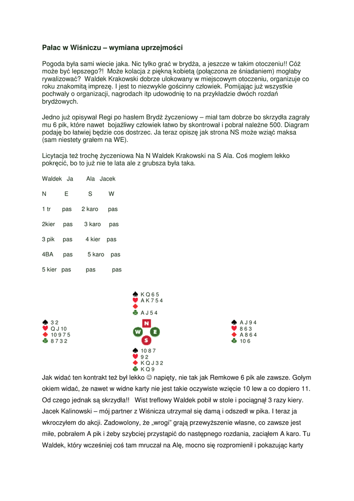Pałac w Wiśniczu – wymiana uprzejmości Pogoda była sami wiecie jaka. Nic tylko grać w brydża, a jeszcze w takim otoczeniu!! Cóż może być lepszego?! Może kolacja z piękną kobietą (połączona ze śniadaniem) mogłaby rywalizować? Waldek Krakowski dobrze ulokowany w miejscowym otoczeniu, organizuje co roku znakomitą imprezę. I jest to niezwykle gościnny człowiek. Pomijając już wszystkie pochwały o organizacji, nagrodach itp udowodnię to na przykładzie dwóch rozdań brydżowych. Jedno już opisywał Regi po hasłem Brydż życzeniowy – miał tam dobrze bo skrzydła zagrały mu 6 pik, które nawet bojaźliwy człowiek łatwo by skontrował i pobrał należne 500. Diagram podaję bo łatwiej będzie cos dostrzec. Ja teraz opiszę jak strona NS może wziąć maksa (sam niestety grałem na WE). Licytacja też trochę życzeniowa Na N Waldek Krakowski na S Ala. Coś mogłem lekko pokręcić, bo to już nie te lata ale z grubsza była taka. Waldek Ja N Ala Jacek E S W 1 tr pas 2 karo pas 2kier pas 3 karo 3 pik pas 4 kier 4BA pas 5 kier pas pas pas 5 karo pas pas pas KQ65 AK754 AJ54 32 Q J 10 10 9 7 5 8732 AJ94 863 A864 10 6 10 8 7 92 KQJ32 KQ9 Jak widać ten kontrakt też był lekko ☺ napięty, nie tak jak Remkowe 6 pik ale zawsze. Gołym okiem widać, że nawet w widne karty nie jest takie oczywiste wzięcie 10 lew a co dopiero 11. Od czego jednak są skrzydła!! Wist treflowy Waldek pobił w stole i pociągnął 3 razy kiery. Jacek Kalinowski – mój partner z Wiśnicza utrzymał się damą i odszedł w pika. I teraz ja wkroczyłem do akcji. Zadowolony, że „wrogi” grają przewyższenie własne, co zawsze jest miłe, pobrałem A pik i żeby szybciej przystąpić do następnego rozdania, zaciąłem A karo. Tu Waldek, który wcześniej coś tam mruczał na Alę, mocno się rozpromienił i pokazując karty oświadczył, że to On już chyba zrobi swoje. Trzy razy przeglądałem jego karty szukając ratunku, zastanawiałem się czy nie ma koguta albo coś takiego. Nic jednak nie udało się wymyślić. Wynik nie był budujący. Jakoś tak pociągnęło smutkiem przy stoliku (głównie nam). Najwyraźniej Waldek, jako gospodarz imprezy postanowił nam to jednak zrekompensować. Głośno o tym co prawda nie powiedział, ale jestem najgłębiej przekonany, że inaczej być nie mogło. Zwyciężyło w Nim przekonanie, iż gospodarz musi zrobić wszystko by goście nie byli smutni ☺. Sami popatrzcie na następne rozdanie. 10 7 5 Q 10 8 3 KQ9543 EW KJ963 A K 10 A975 J Q842 QJ32 K62 A2 A5 98764 J4 10 8 7 6 Licytowaliśmy sobie tak dość luźno przy wcale nie biernej postawie przeciwnika. Ja E Ala Jacek Waldek S W N 1trefl pas 1 pik 3 trefl 3 pik 4 trefl 4 BA 5 trefl Pas(1-4) pas 6 pik 7 trefl !! Kontra pas pas pas Po niespecjalnie trudnej obronie wzięliśmy zgrabne 1100, właściwie do niczego. Widać jak byk, że As atu i jedno karo są do zwrotu, nie ma zmiłuj. Każdemu kto spróbuje głośno powiedzieć, że Waldek jest niegościnny zarzucę bez wahania kłamstwo ☺. No i tak sobie różnie graliśmy, niestety aż tyle nam skrzydła nie przyniosły a i sami trochę oddaliśmy, zatem 53% z hakiem wydaje się być sprawiedliwym wynikiem. Za rok w Wiśniczu spotykamy się koniecznie. Tadek Biernat PS Nie wiem dlaczego jakiś nóż Regi wprowadził do swojego tekstu, a nuż ma jakieś mordercze zamiary. Hm, mam nadzieję, że to nie ja jestem na celowniku